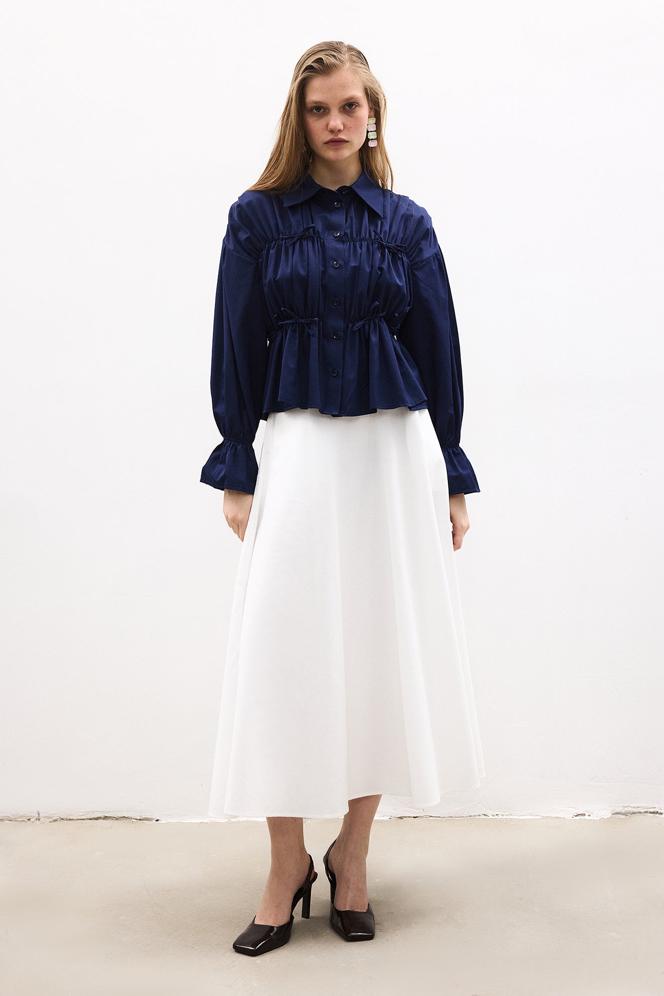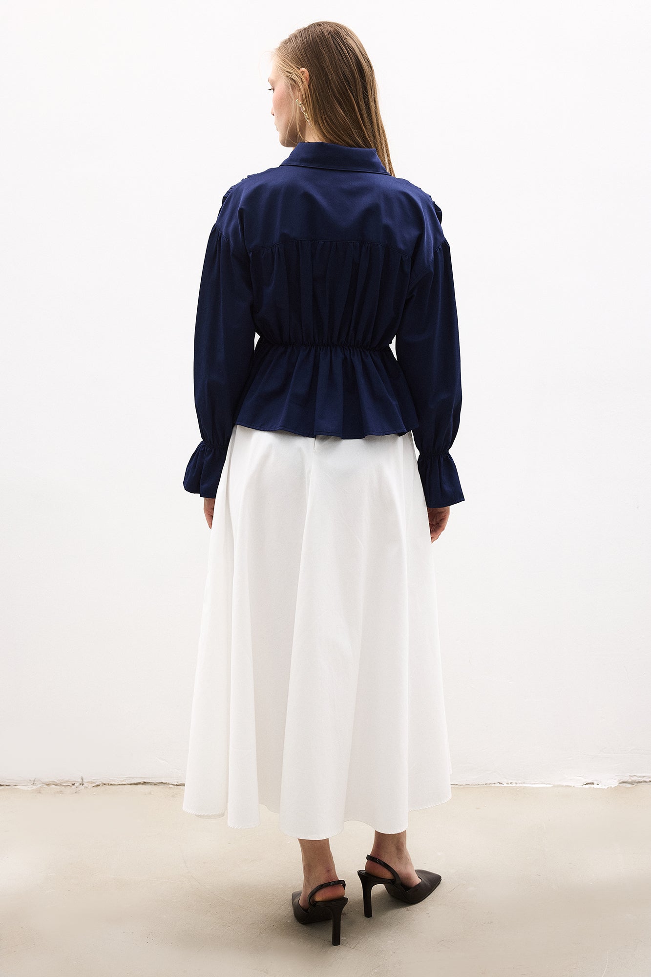 Günlük şıklığı modern detaylarla buluşturan bu gömlek, hafif ve nefes alabilen kumaş yapısıyla gün boyu konfor sunar. Gömlek yaka ve boydan düğmeli tasarımı, ürüne zamansız ve düzenli bir görünüm kazandırırken; göğüs ve bel hattında yer alan büzgü detayları modele hareket ve form verir.