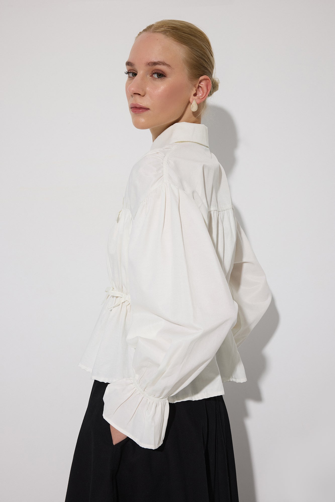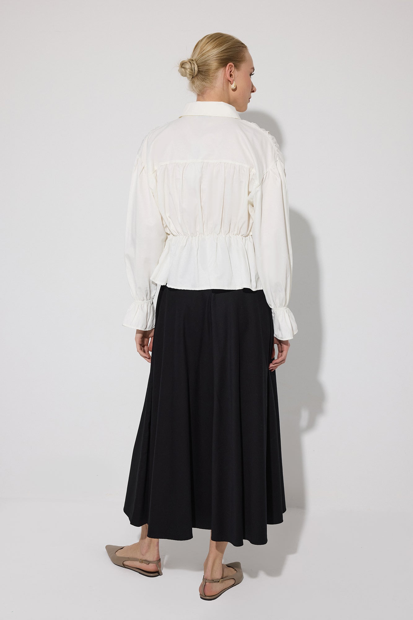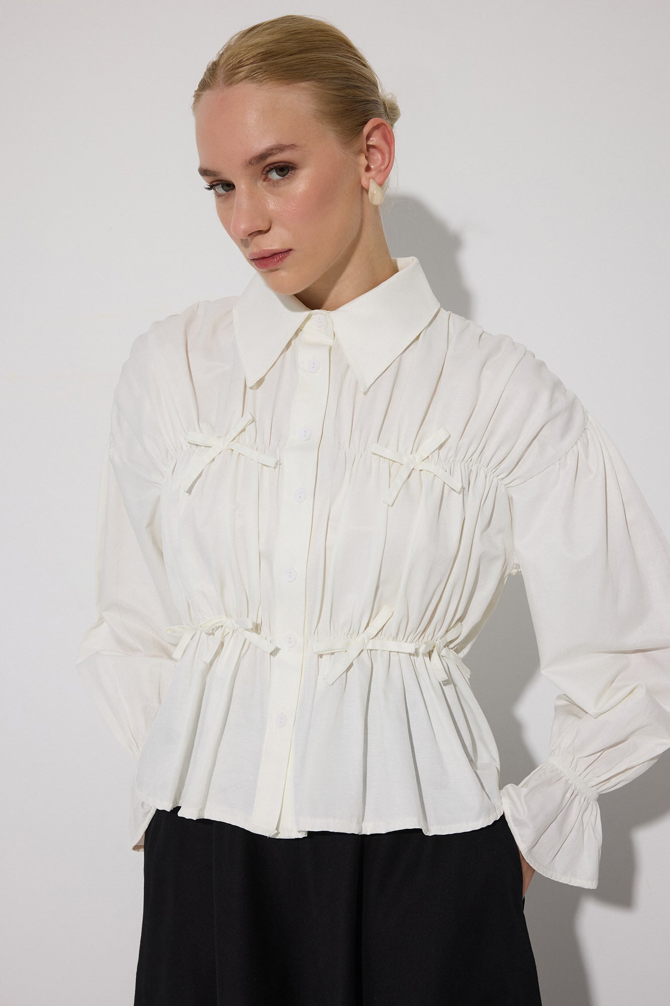 Gömlek yaka. Önü düğme kapamalı. Büzgü detaylı. Uzun kollu, lastikli manşetli kol ucu.