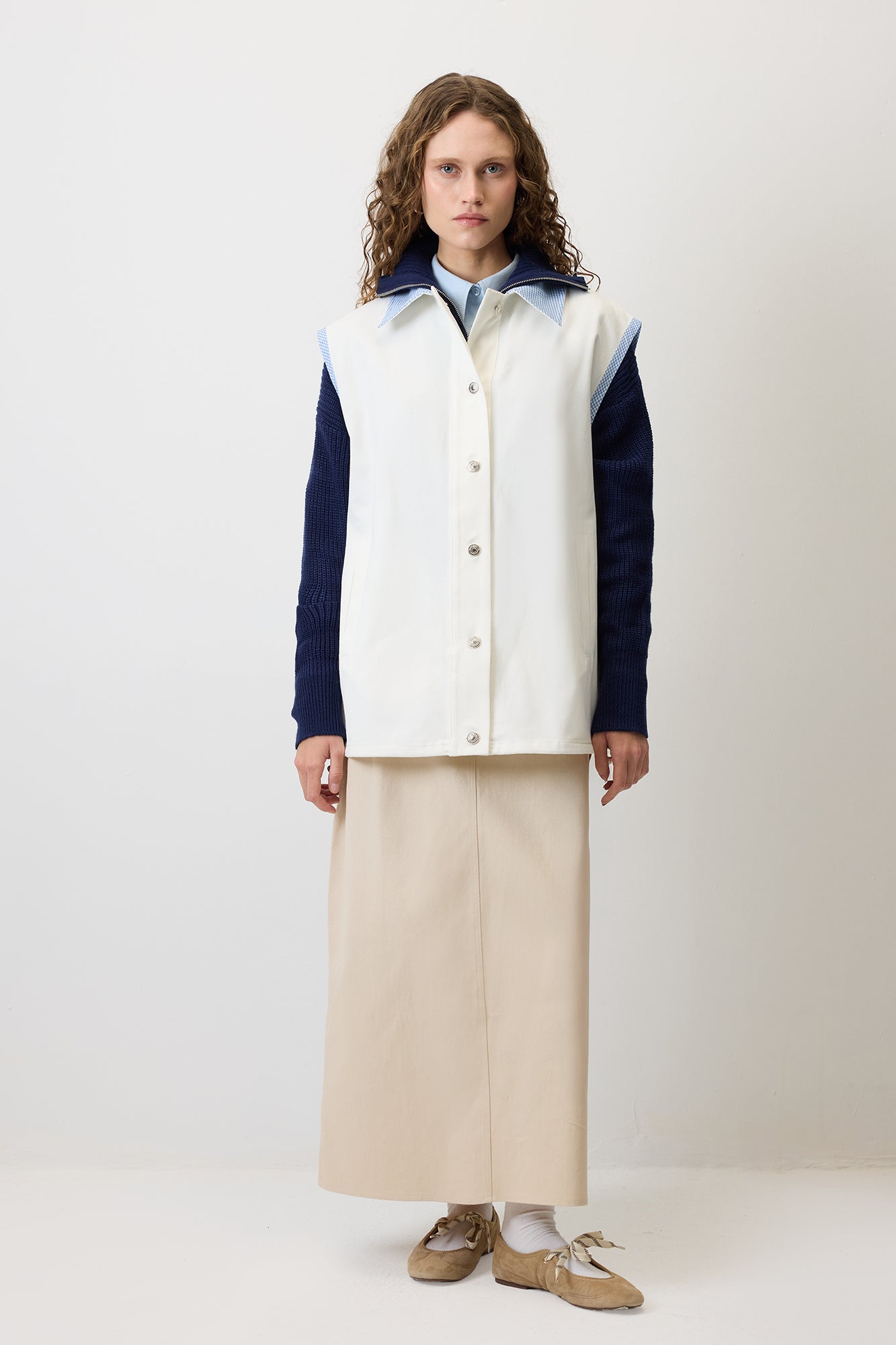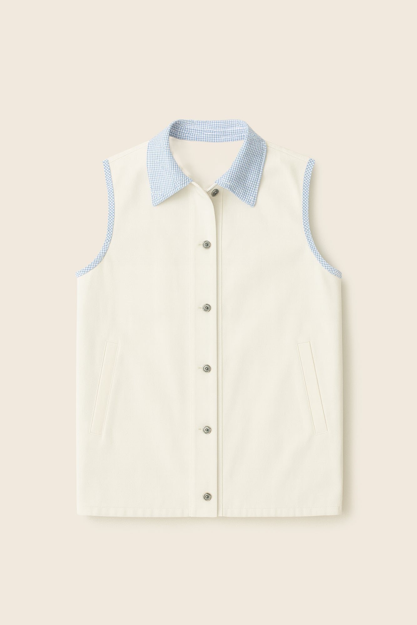 Klasik yaka. Kolsuz. Yakası pöti kareli. Önden düğme kapamalı.