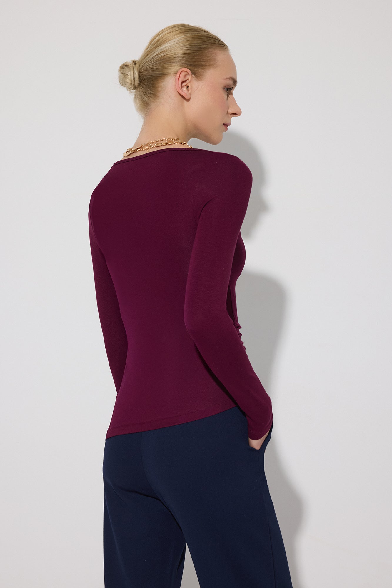 Kayık yaka. Uzun kol. Büzgü detaylı.