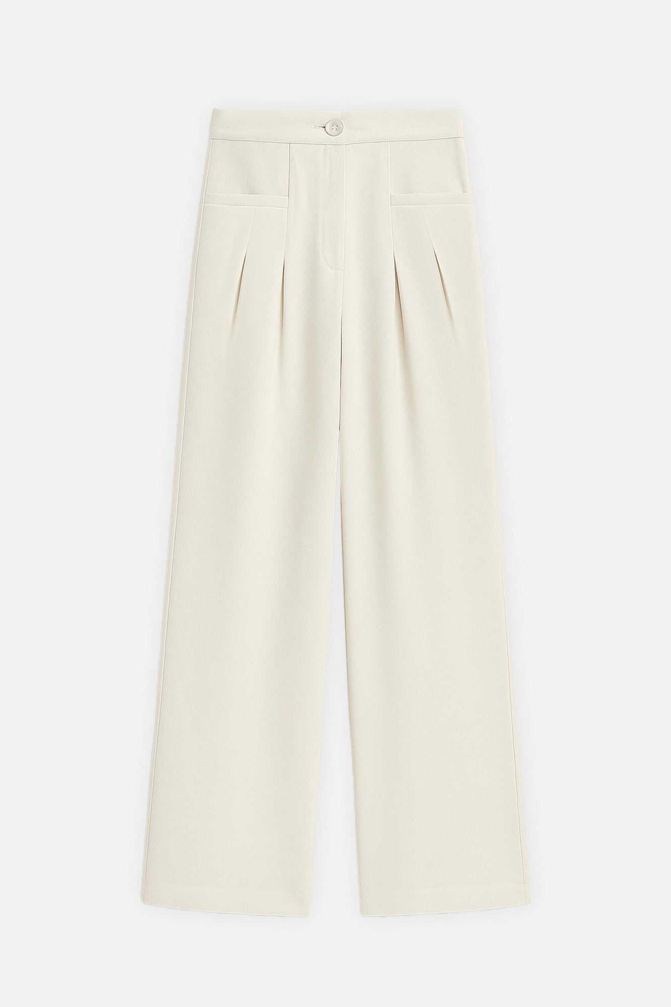 Cep ve pili detayları ile rahat kesimi bir araya getiren bol paça keten pantolon.