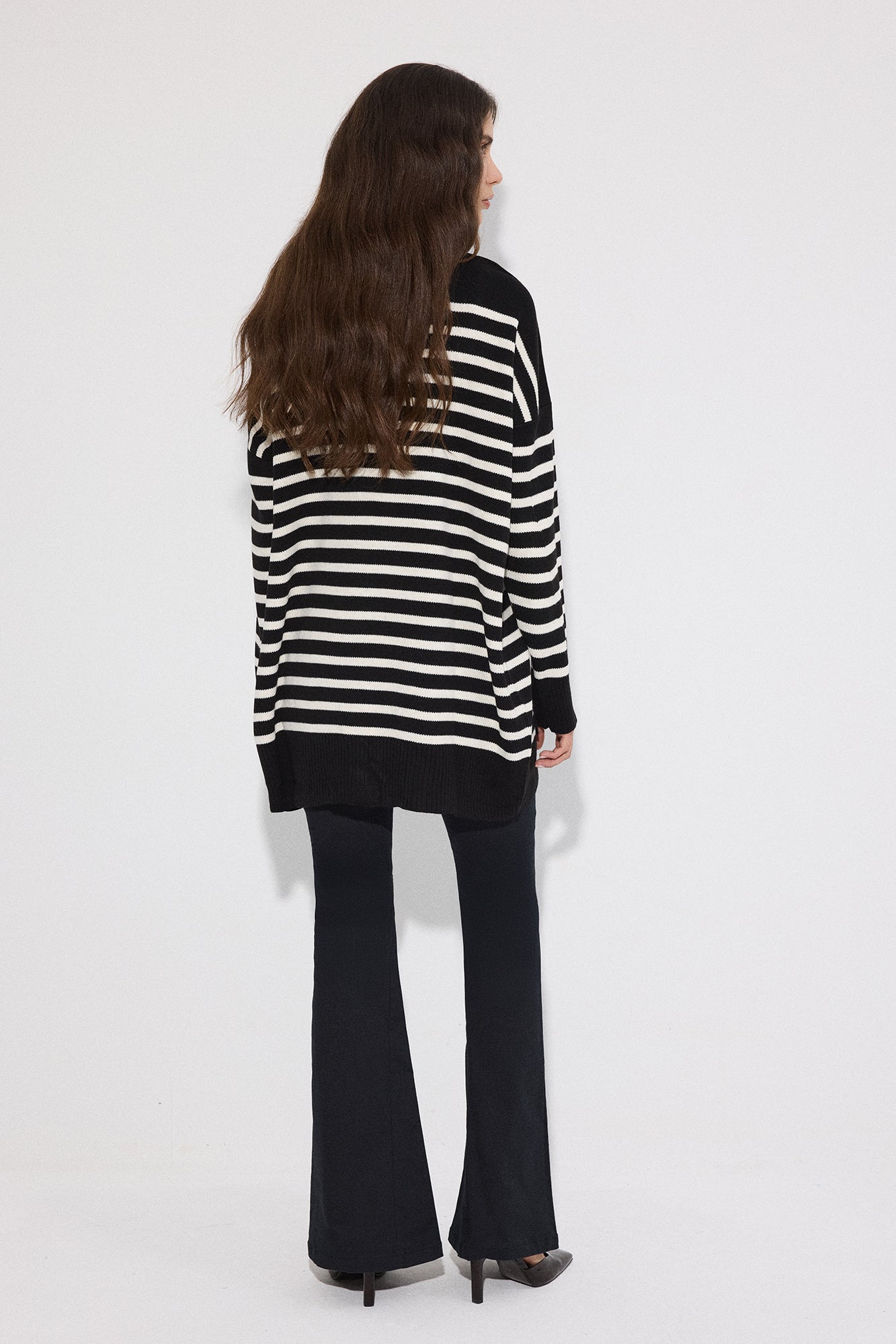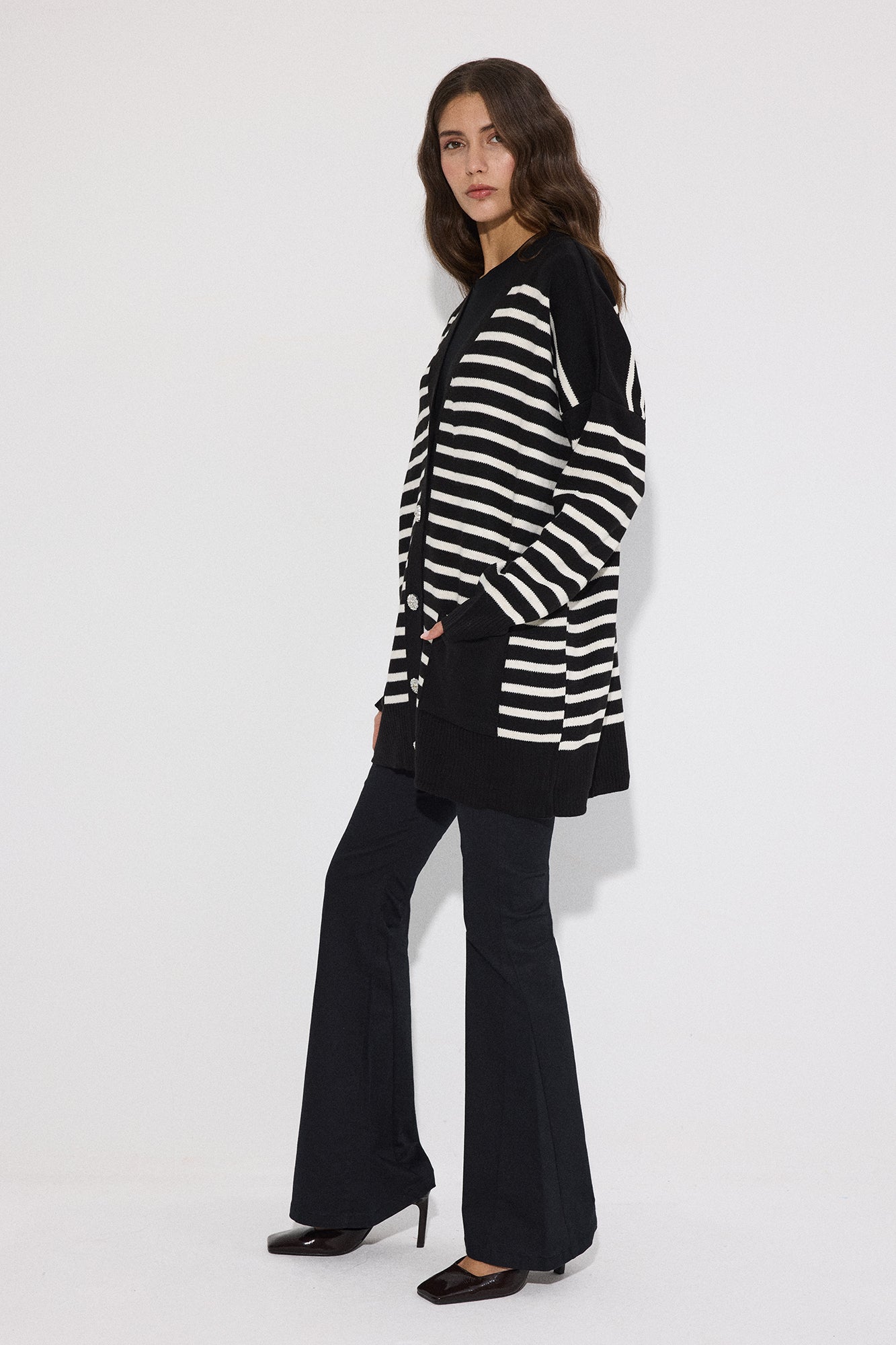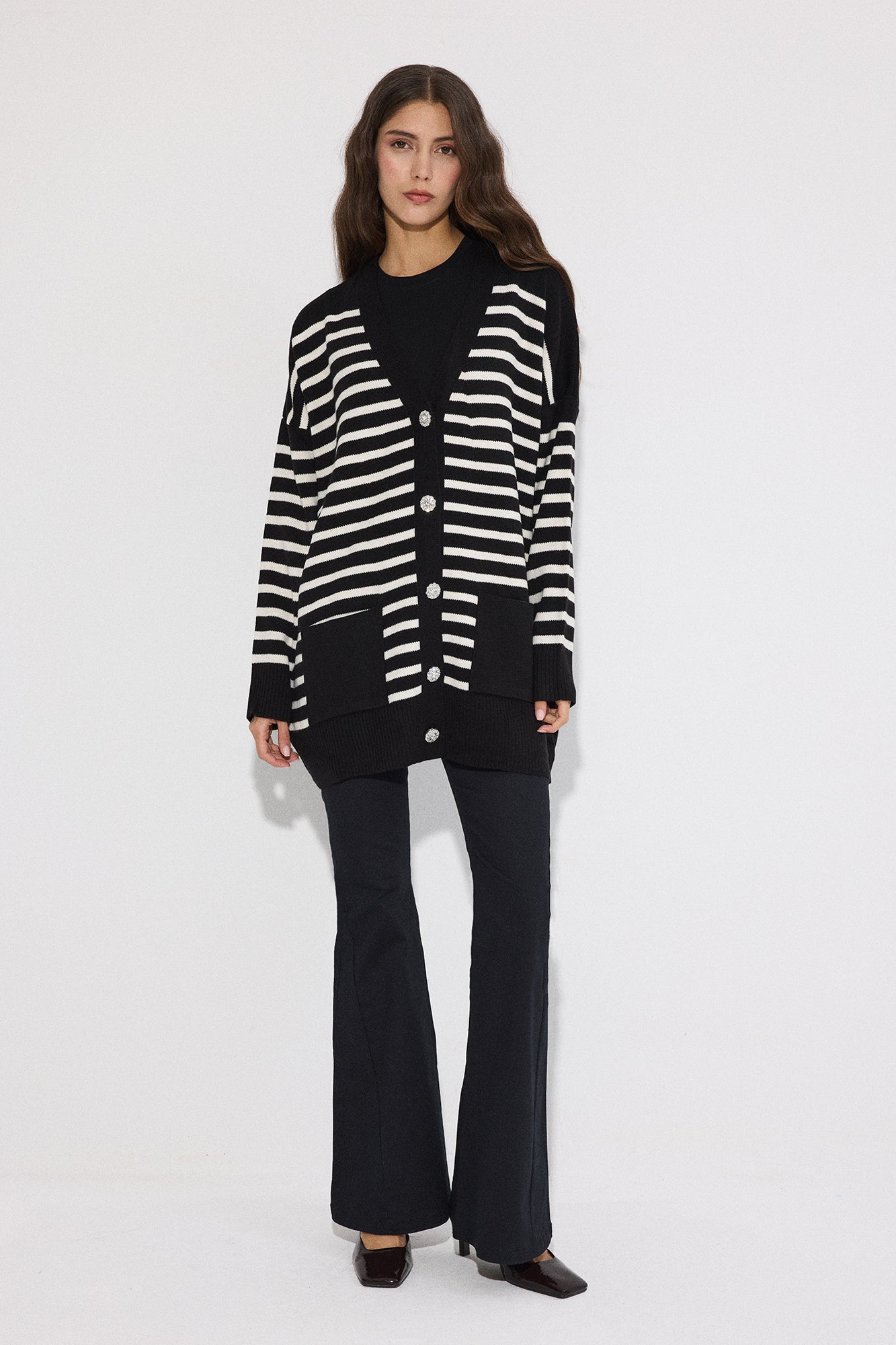 Oversize ve rahat kesim. V yaka. Önü düğmeli kapama. Çizgili desen. Uzun kol. Dekoratif metal görünümlü düğme detaylı.