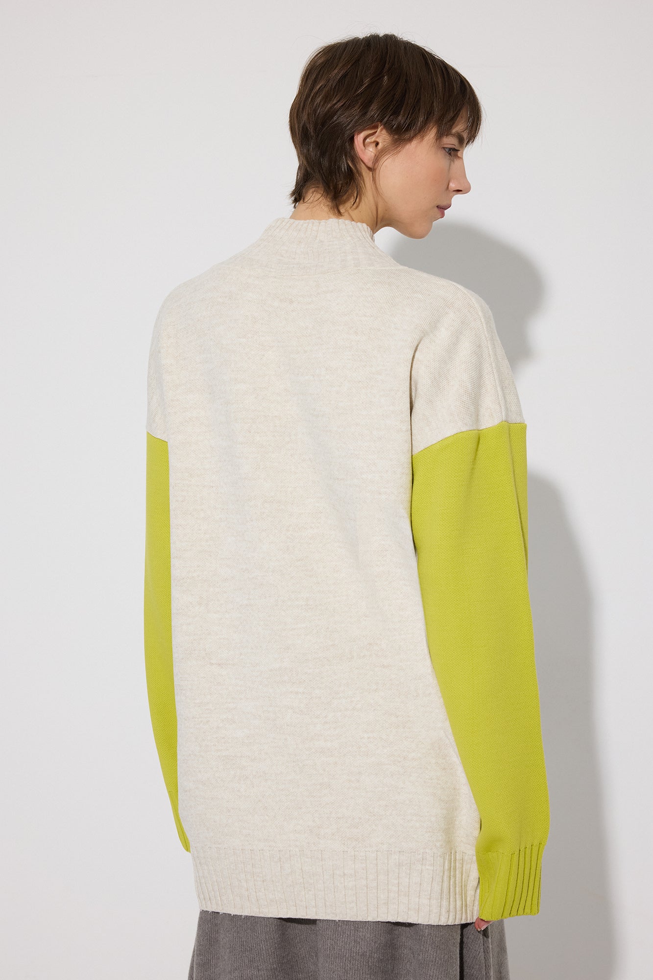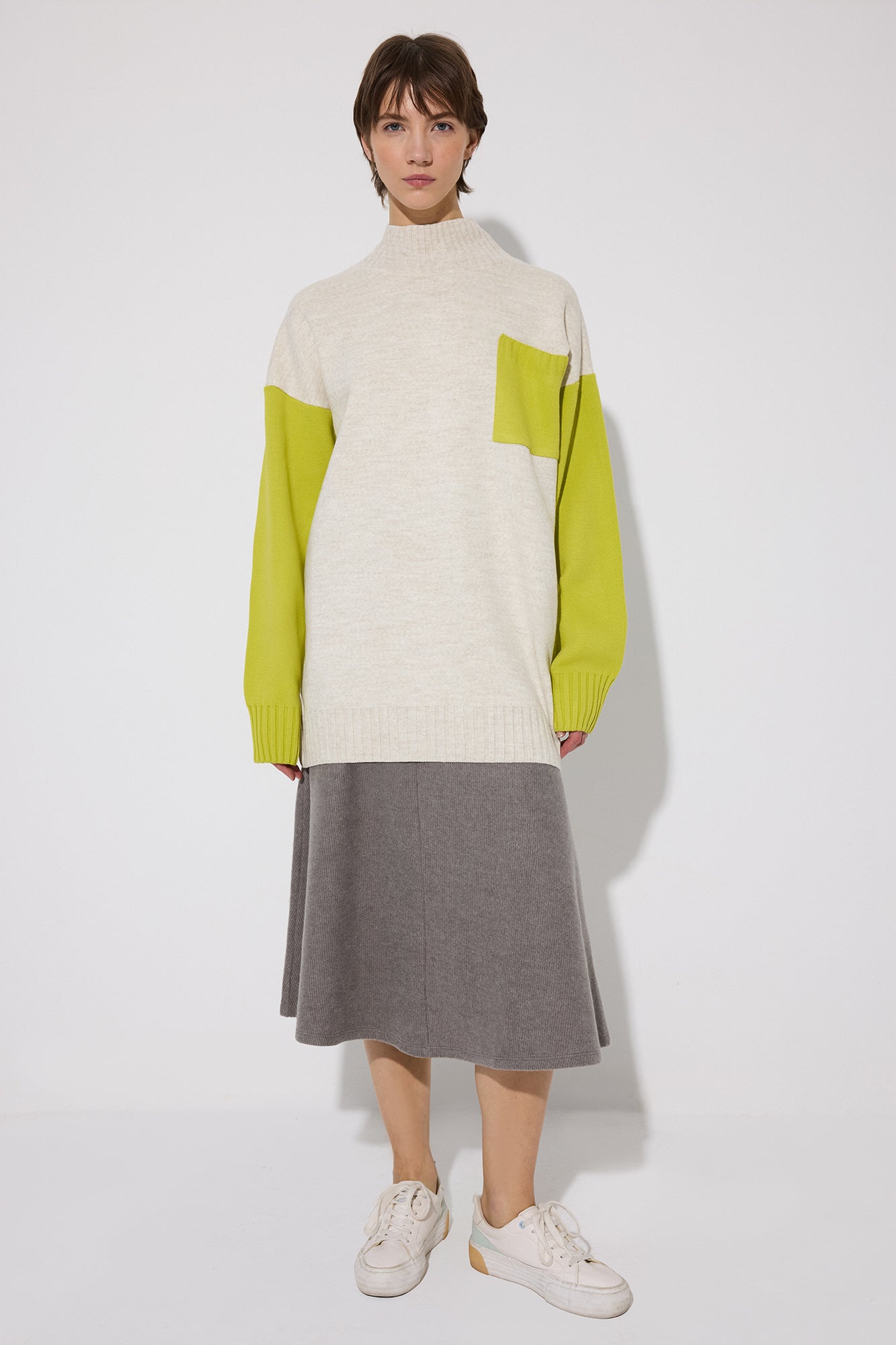 Dik yaka. Uzun kollu. Cep detaylı. Triko.