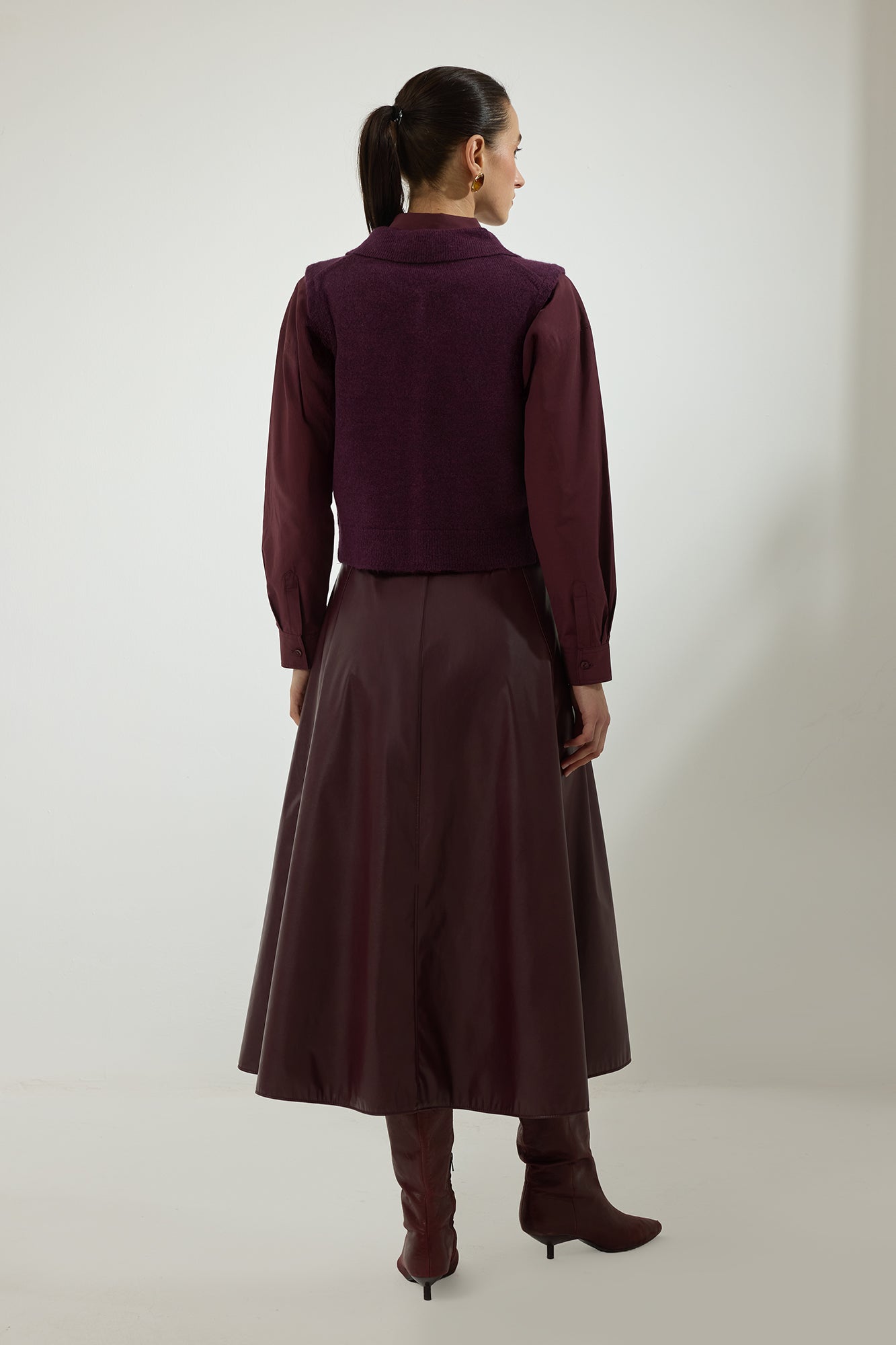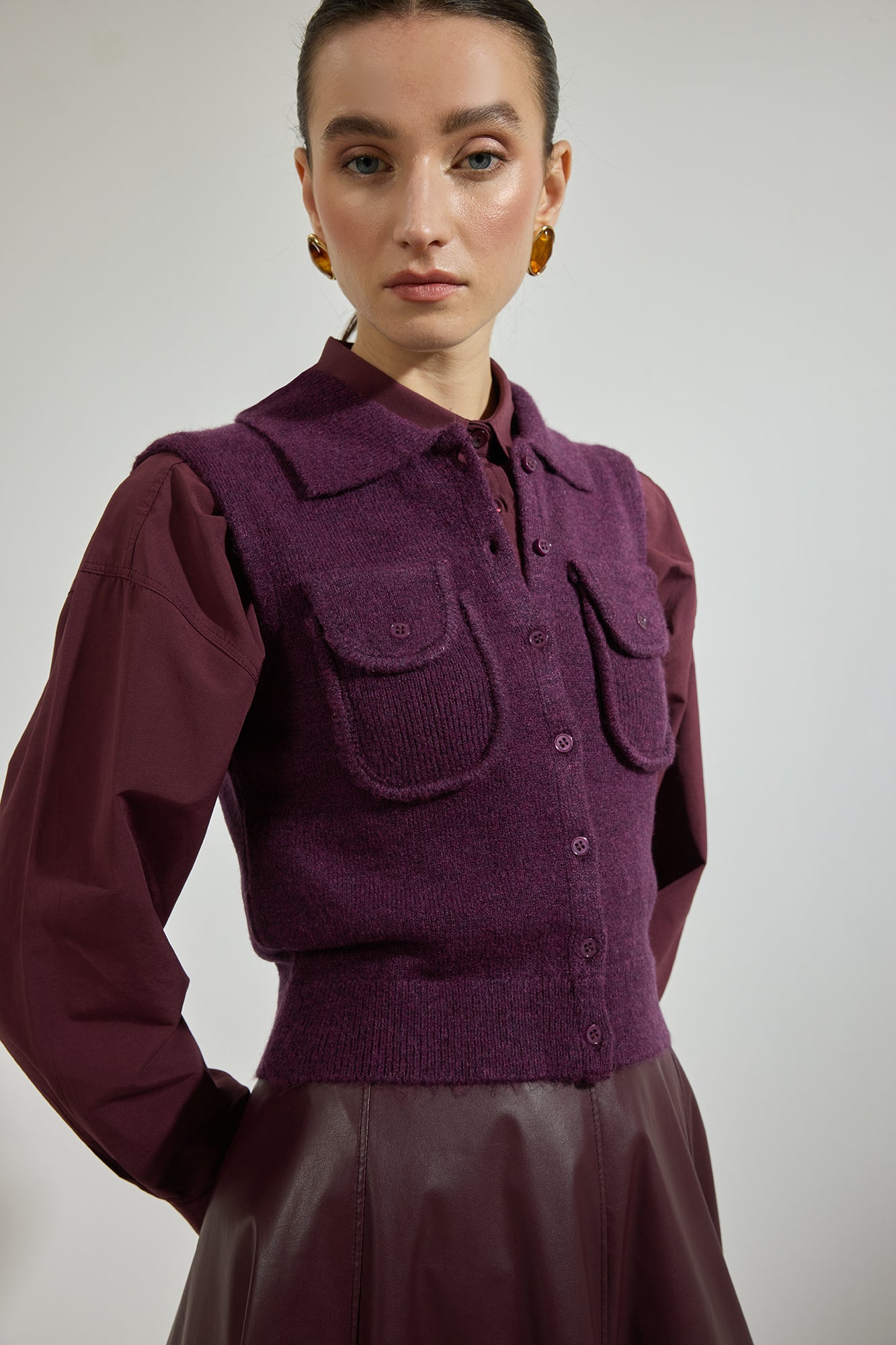 Gömlek yaka. Kolsuz. Cep detaylı. Düğme kapamalı. Triko yelek.