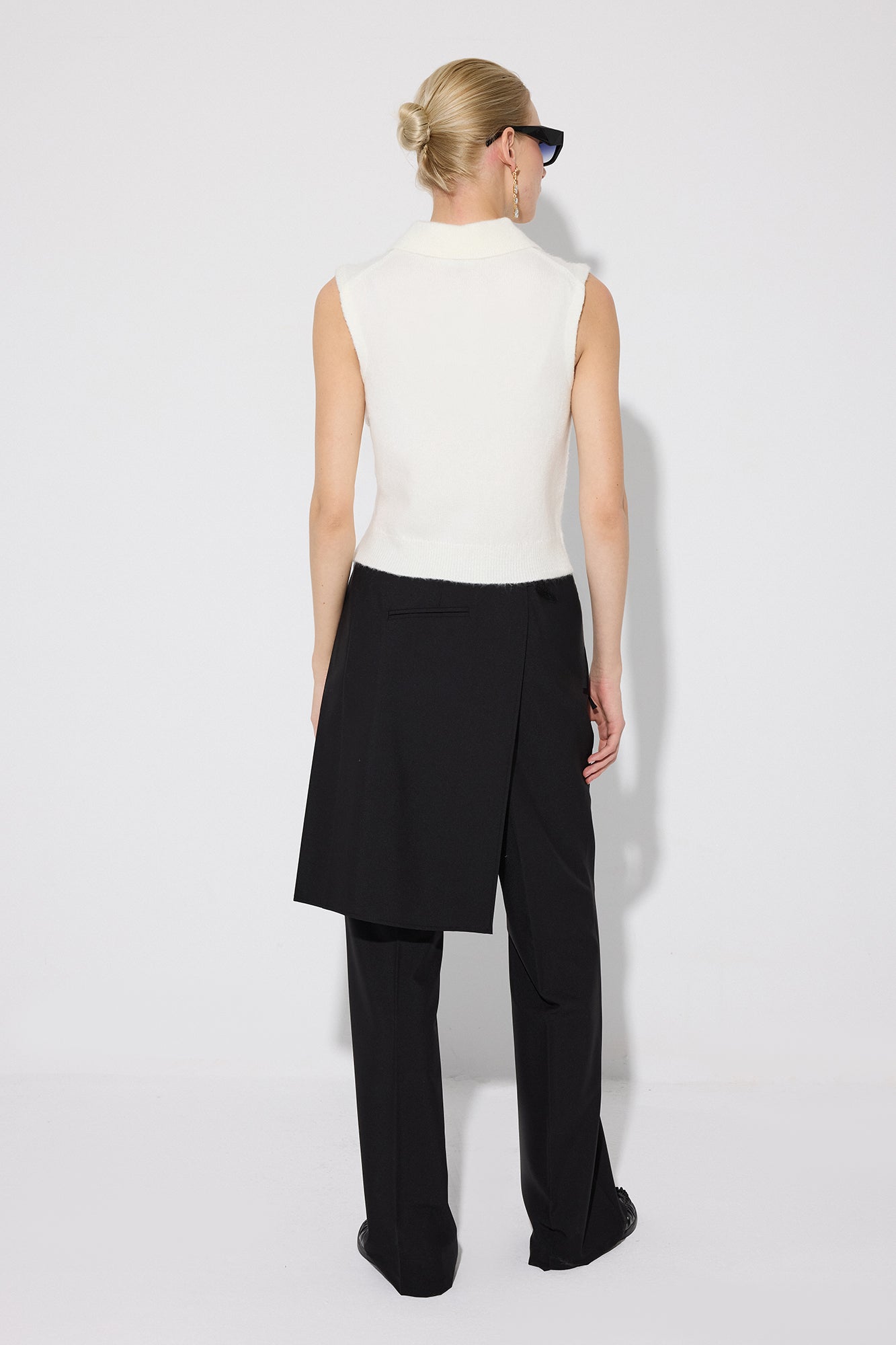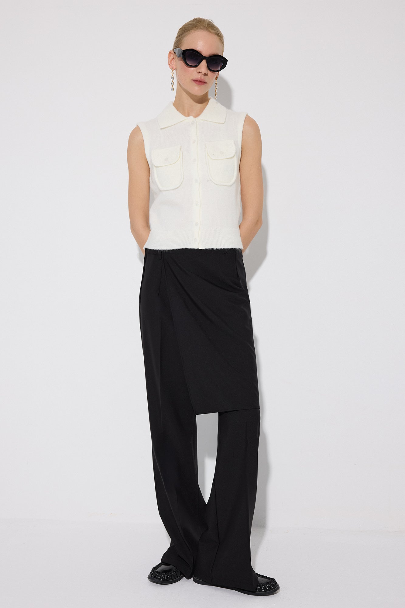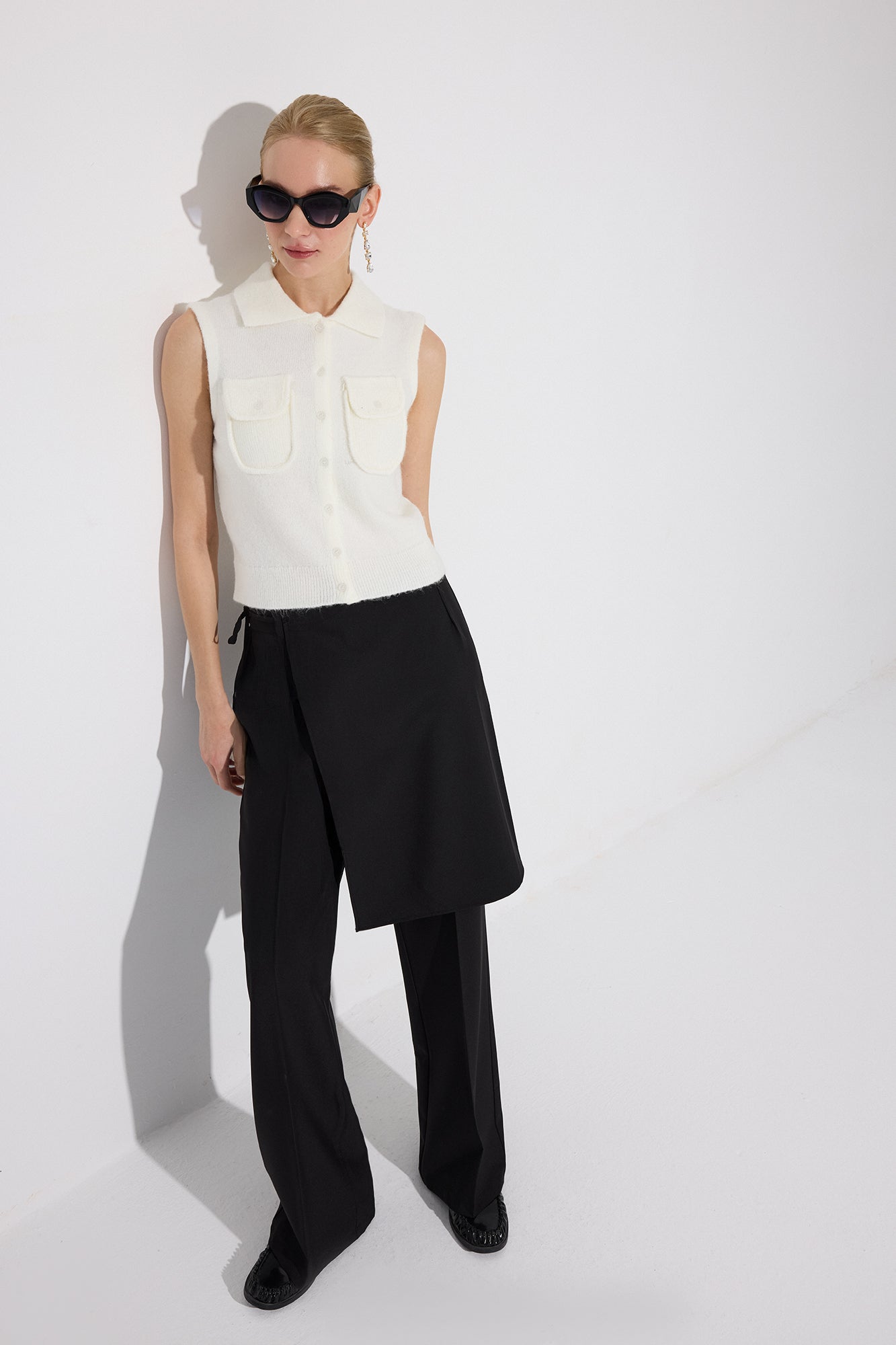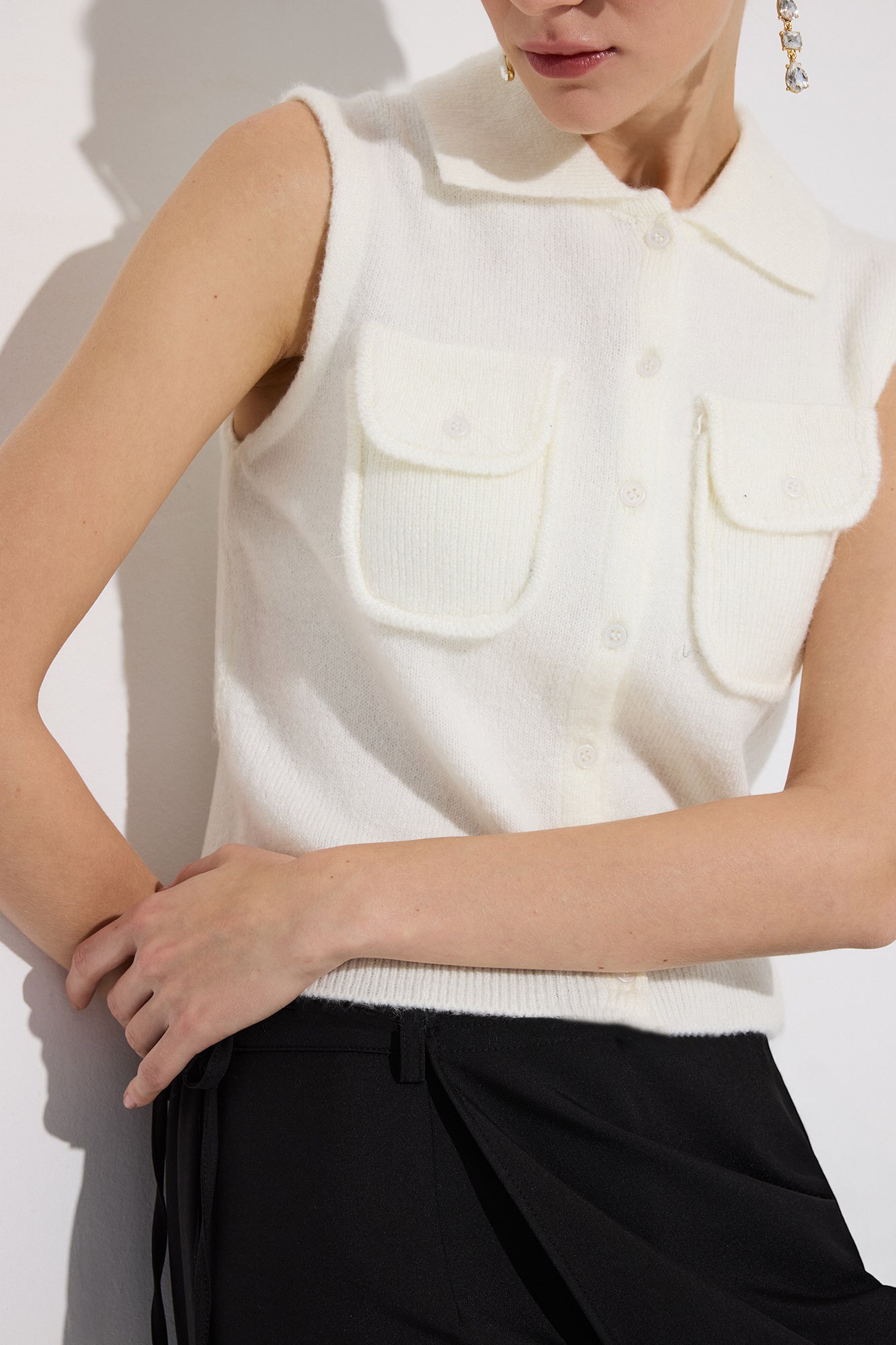 Gömlek yaka. Kolsuz. Cep detaylı. Düğme kapamalı. Triko yelek.