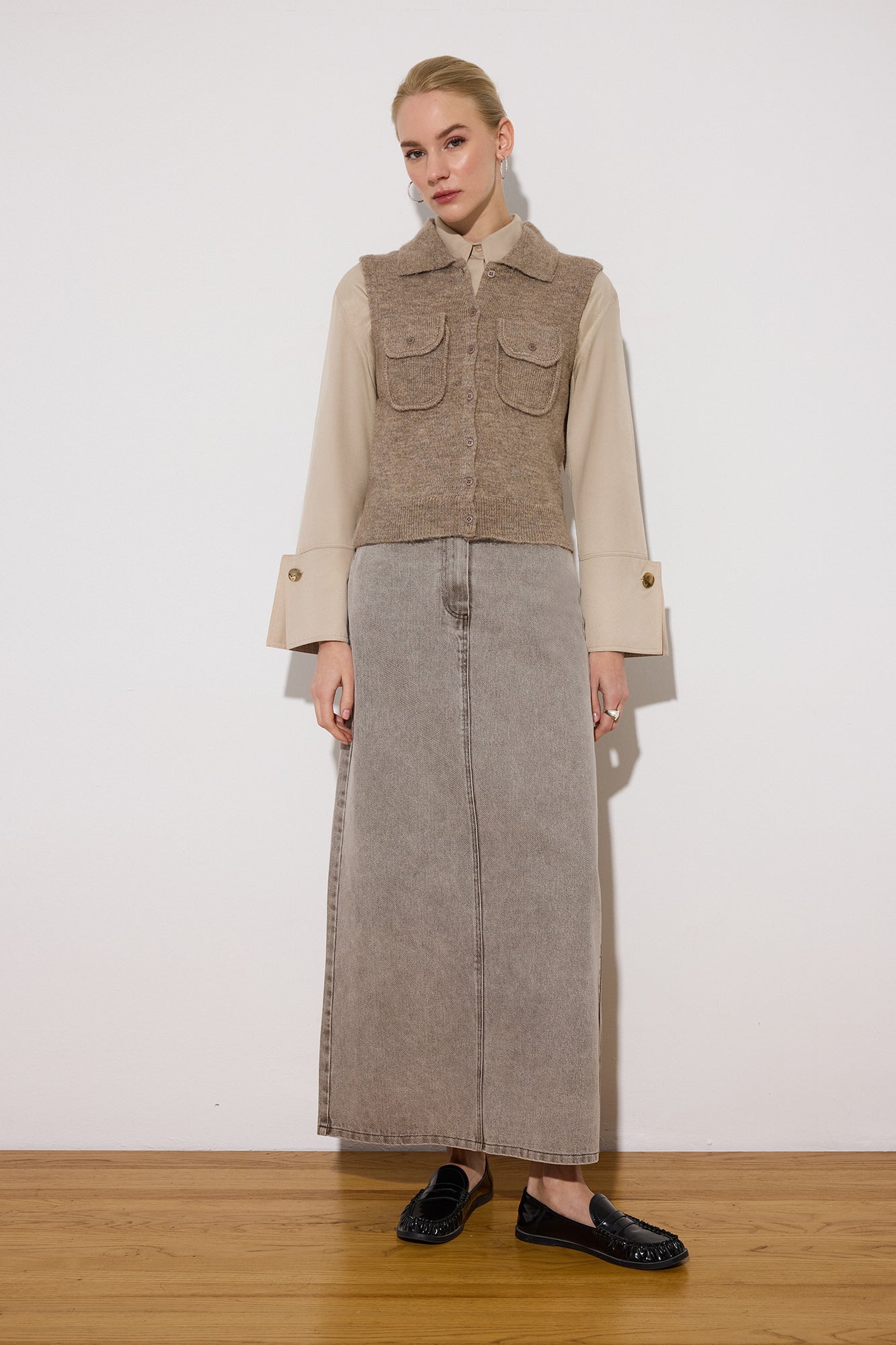 Gömlek yaka. Kolsuz. Cep detaylı. Düğme kapamalı. Triko yelek.