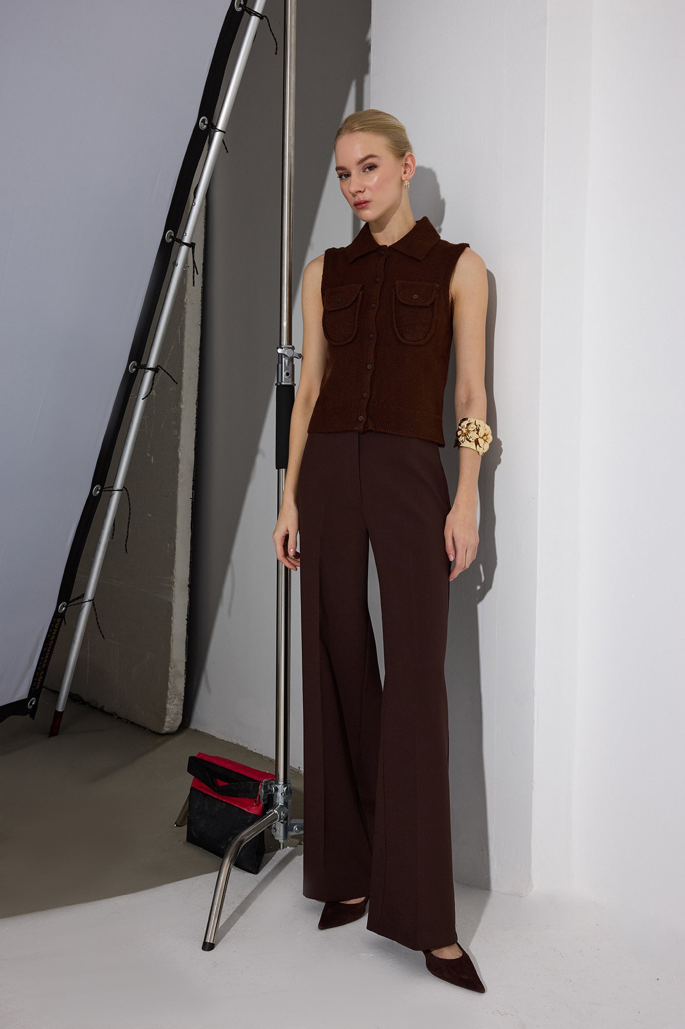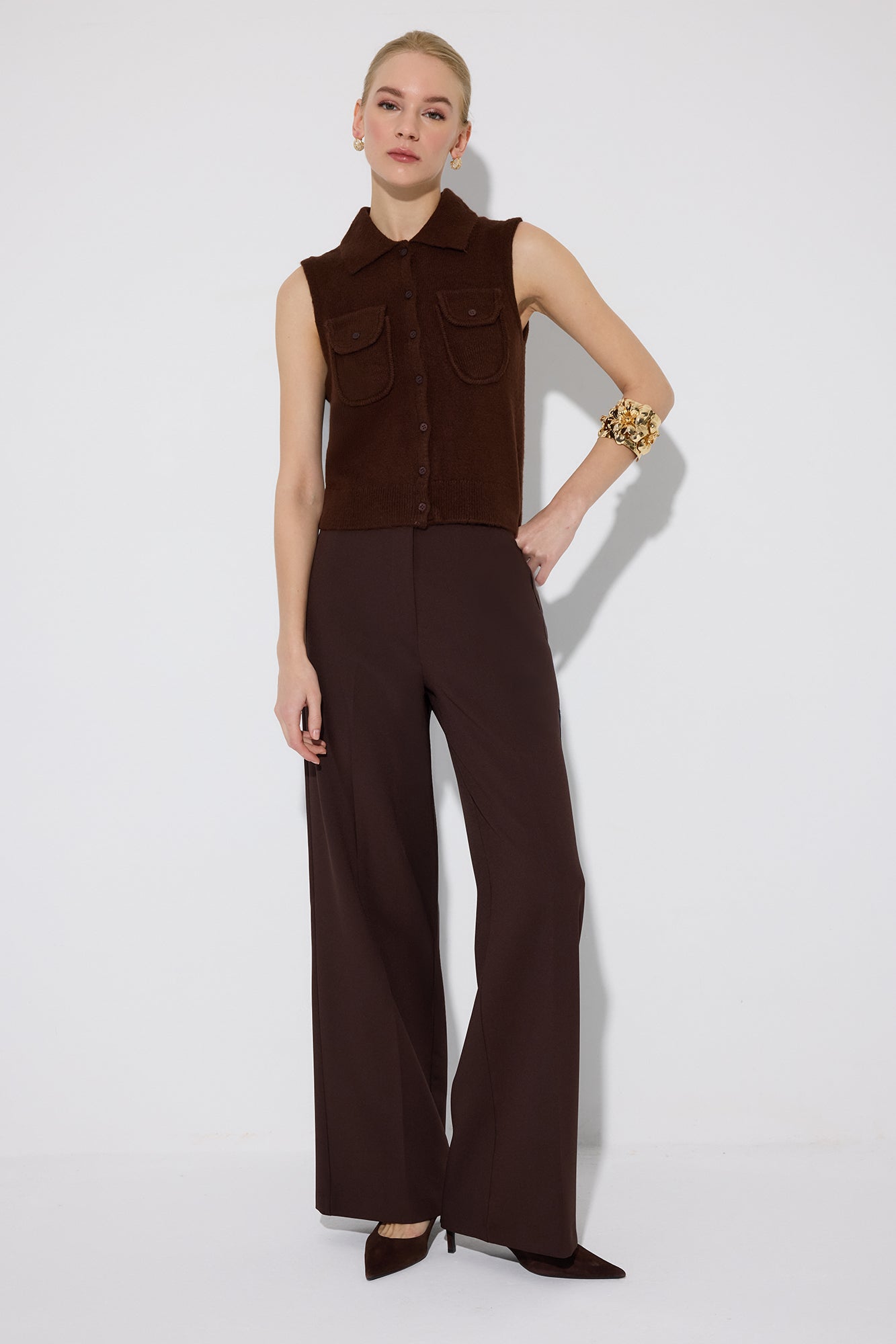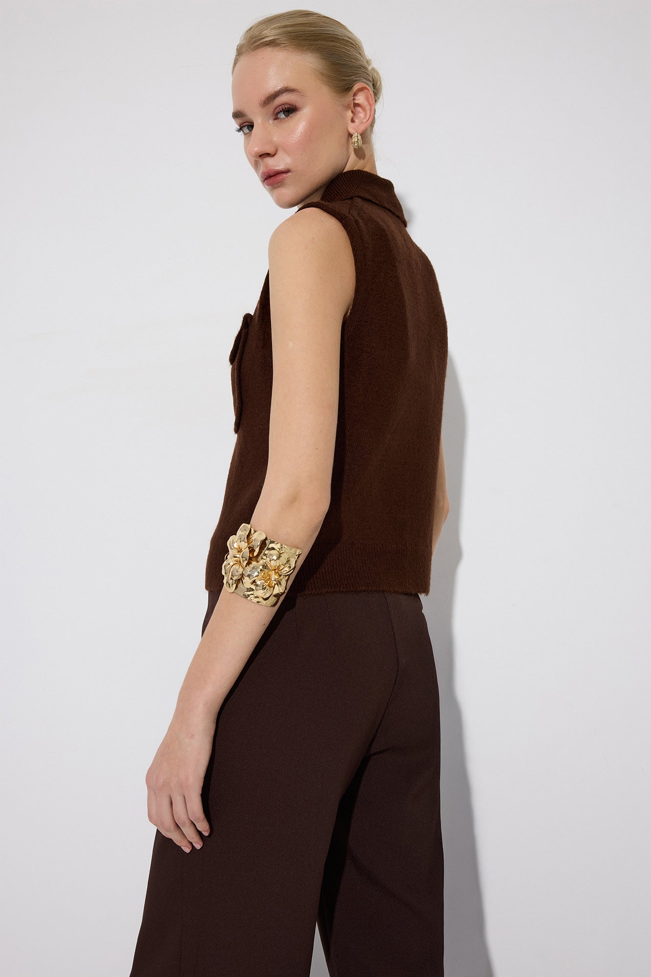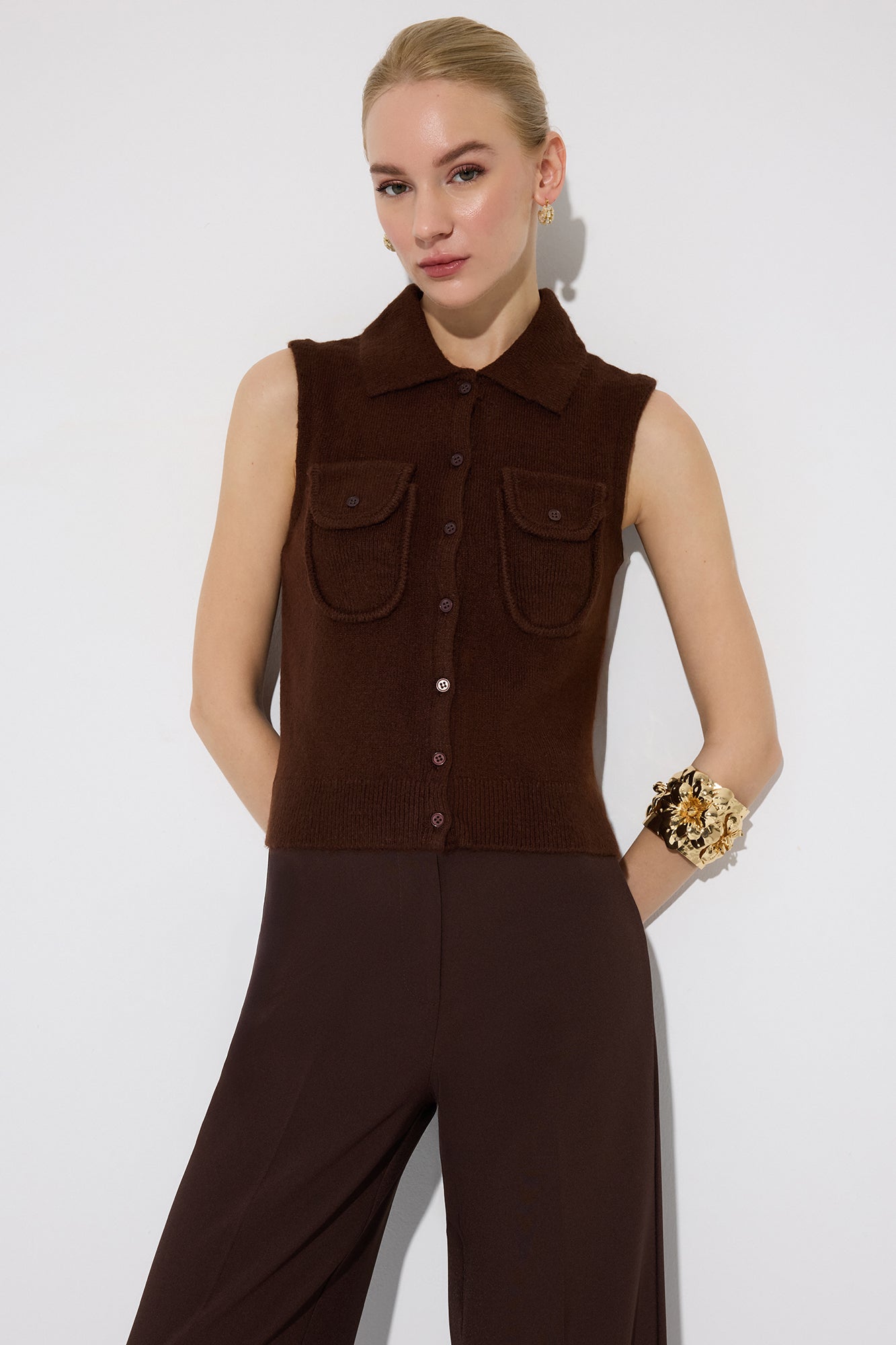 Gömlek yaka. Kolsuz. Cep detaylı. Düğme kapamalı. Triko yelek.