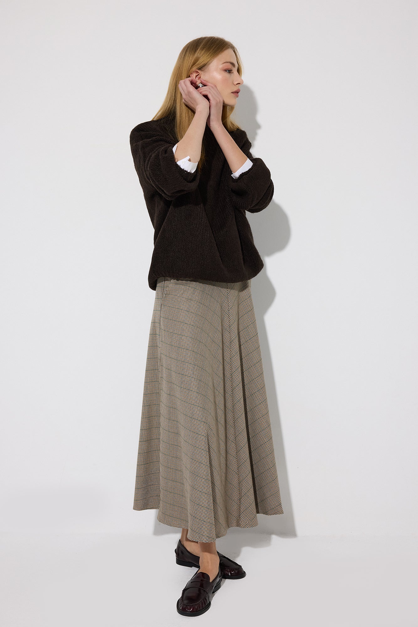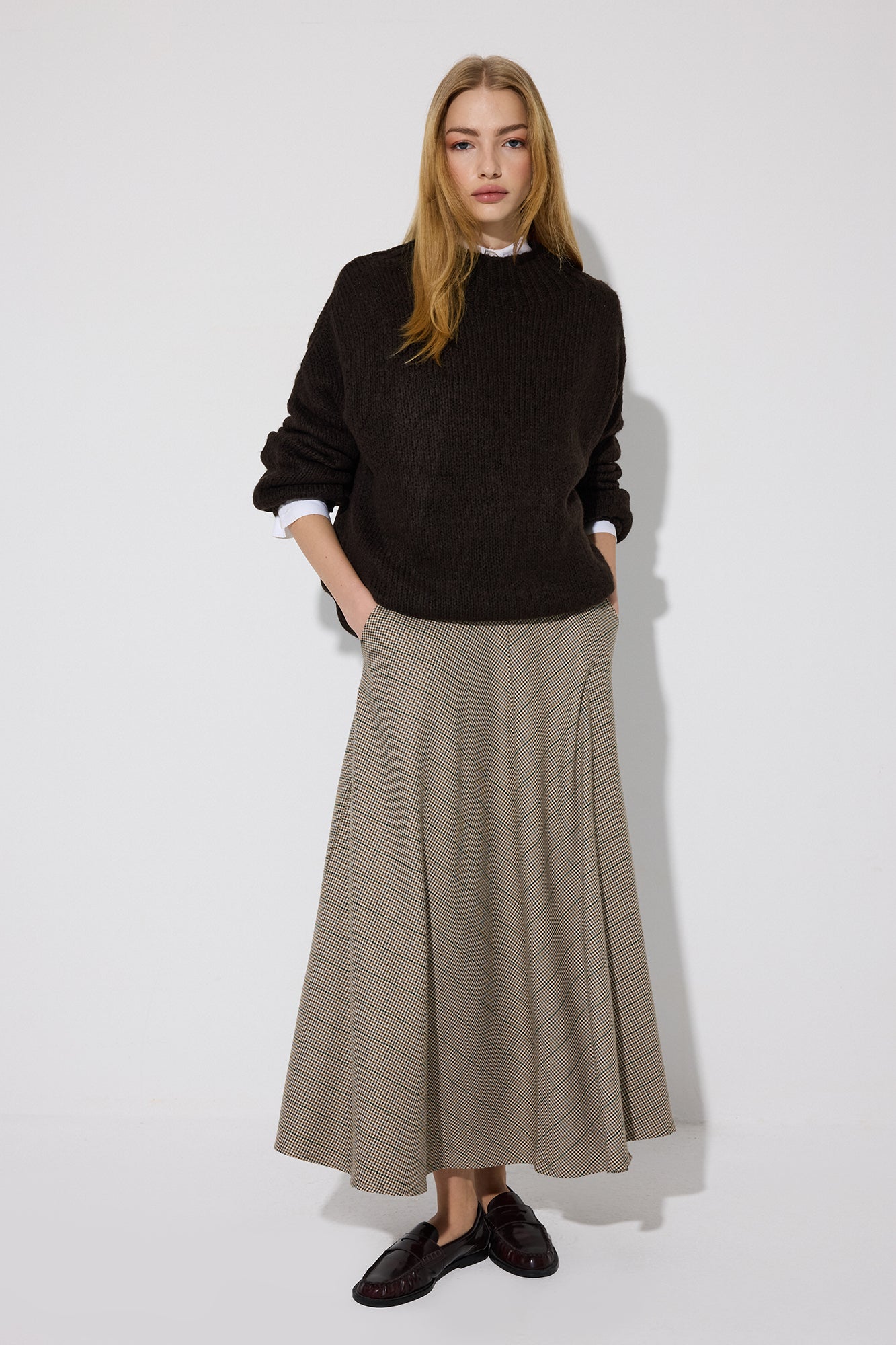 A kesim. Midi boy. Cepli. Pile detaylı. Yüksek bel. Ekose desenli.