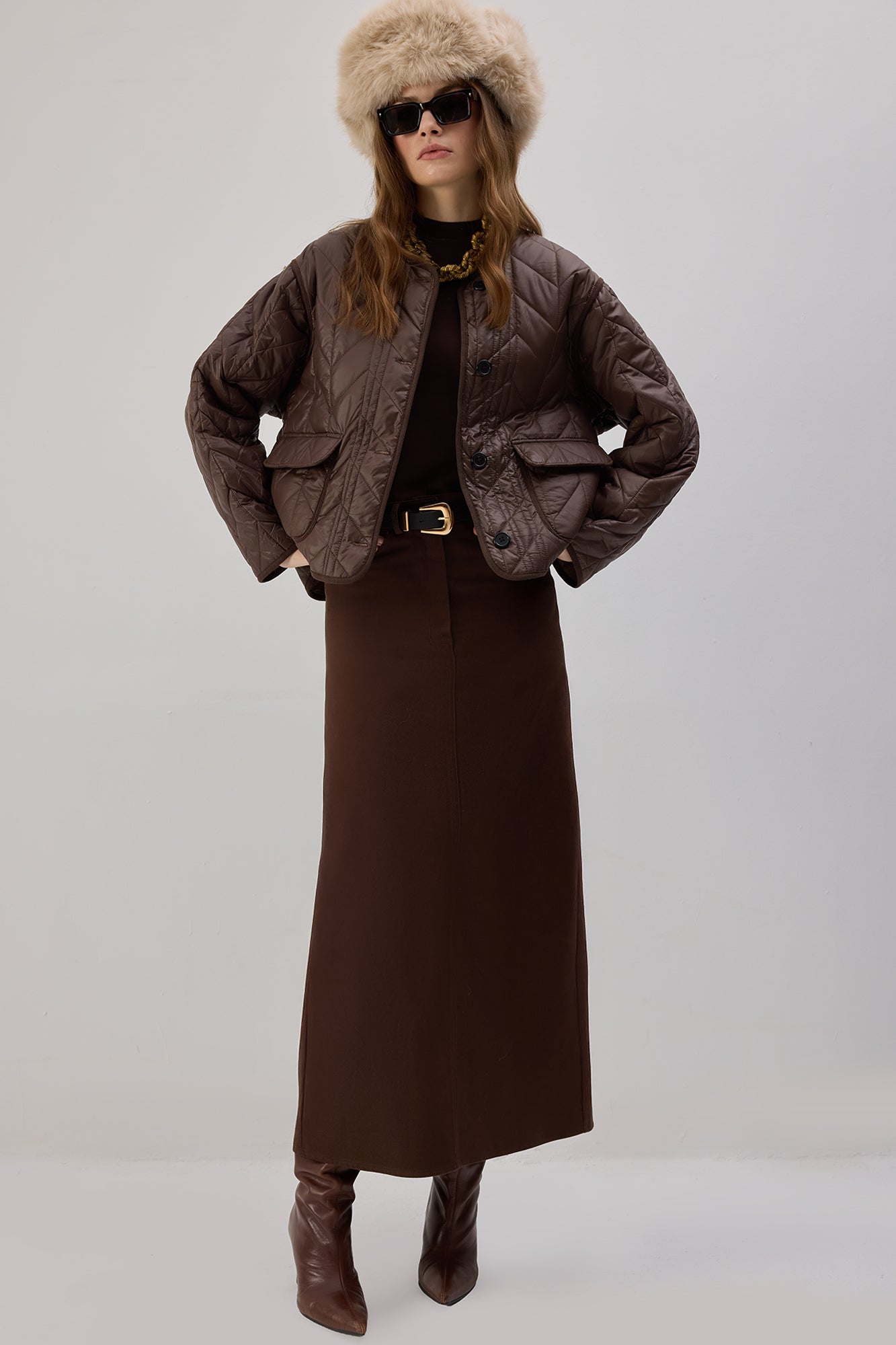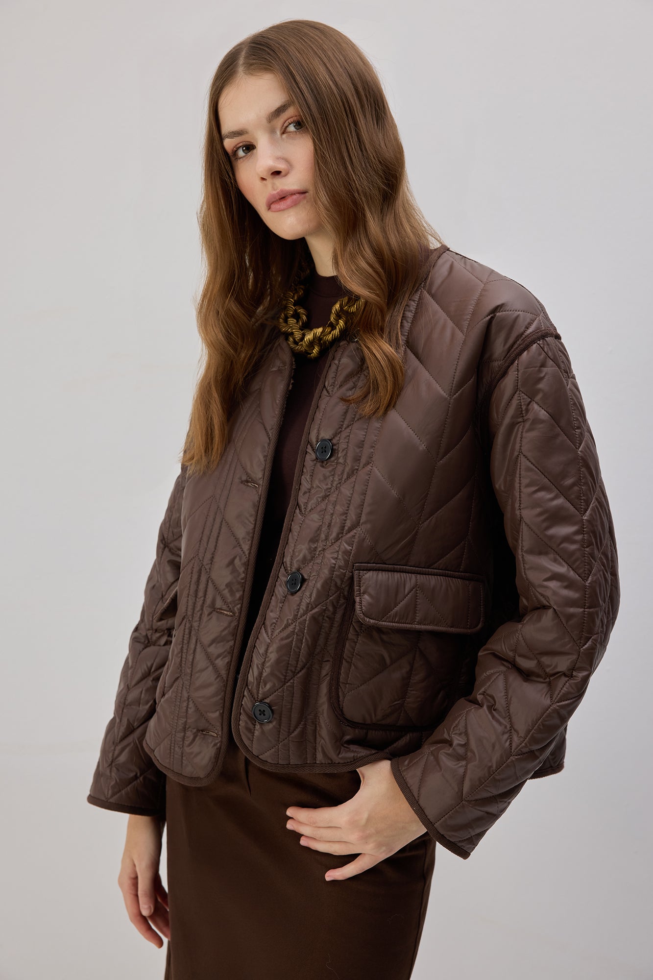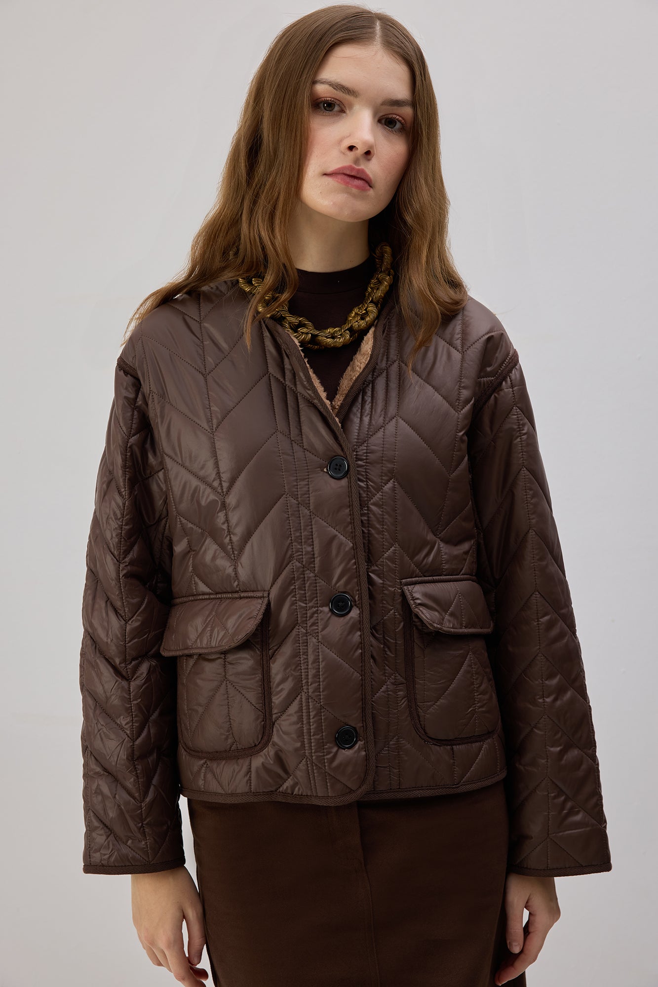 Düğme kapamalı. Ön kısmında büyük kapaklı cepli. İçi yumuşak peluş astarlı. Kapitone ceket.