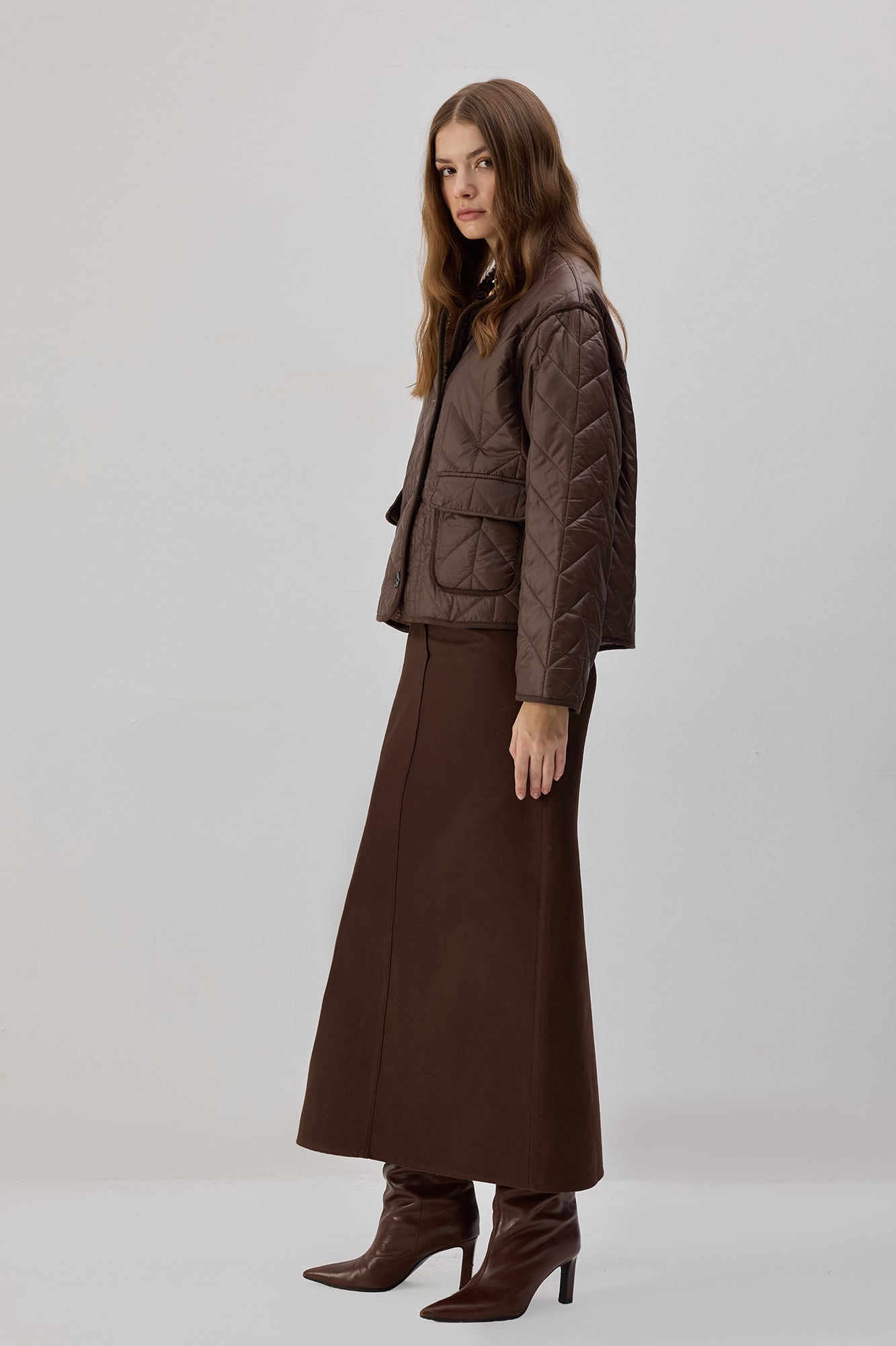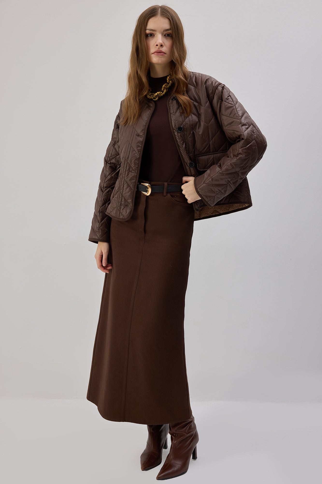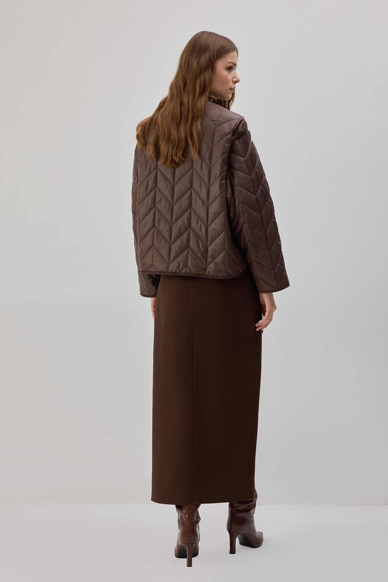 Düğme kapamalı. Ön kısmında büyük kapaklı cepli. İçi yumuşak peluş astarlı. Kapitone ceket.