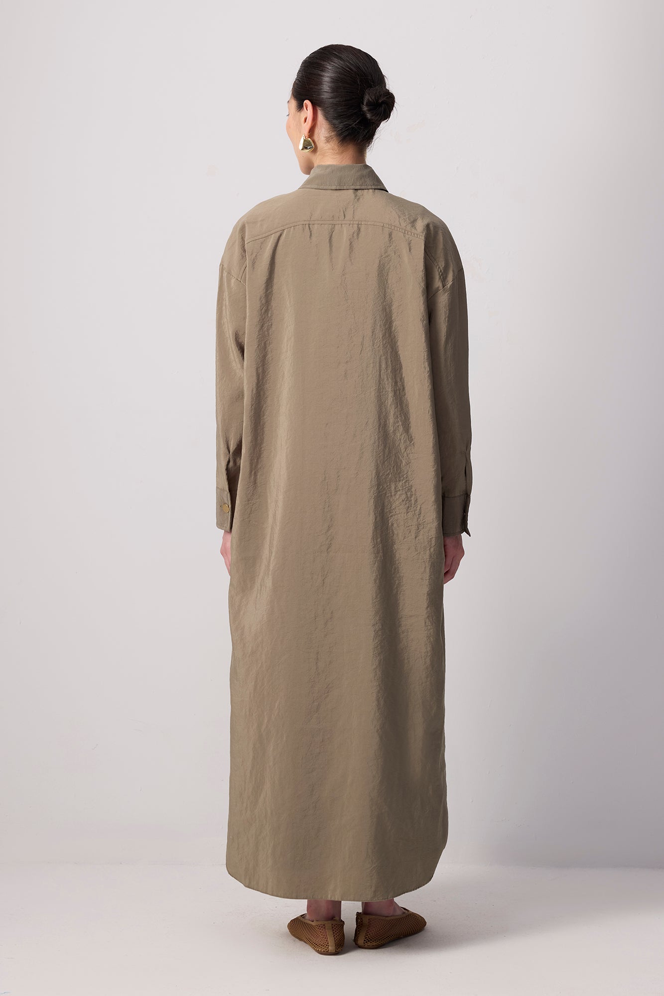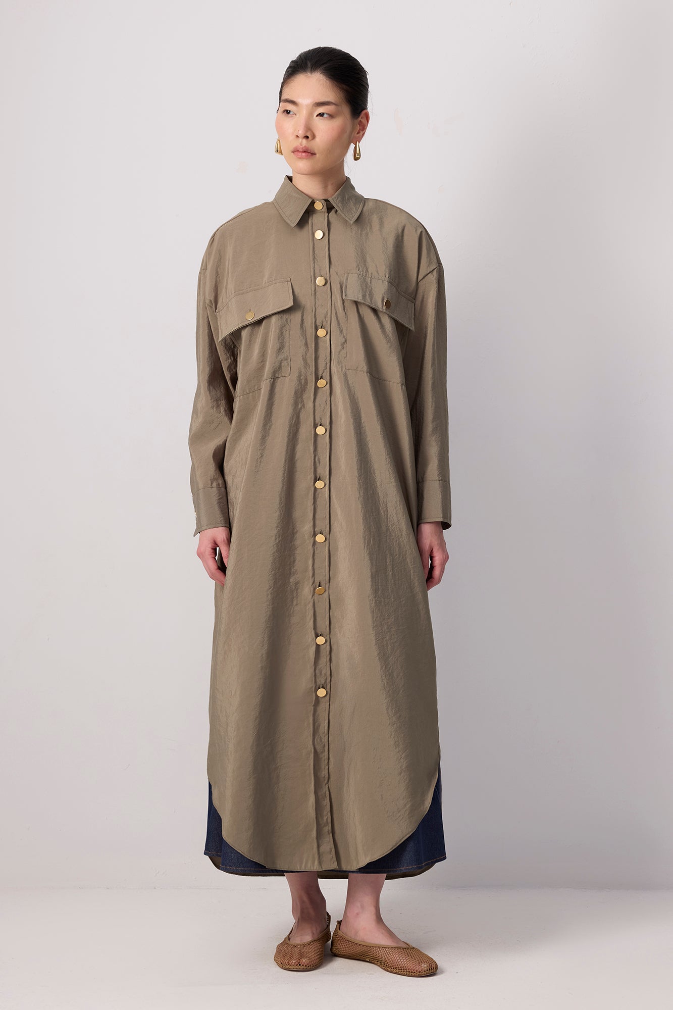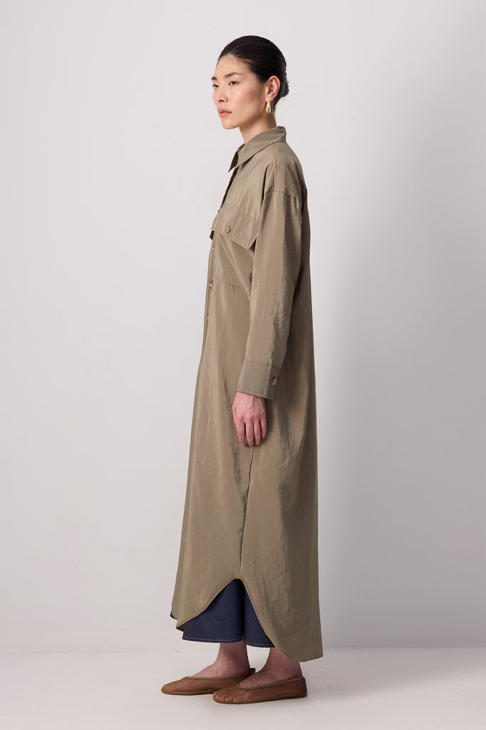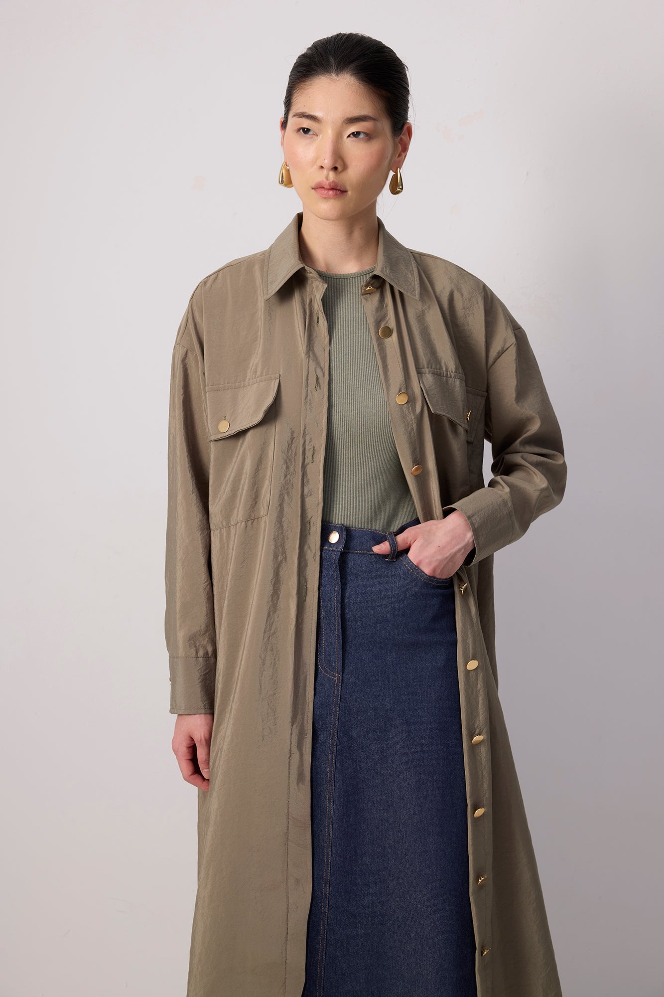 Kupra. Gömlek yaka. Uzun boy. Önü ve manşeti metal düğme kapama. Göğüs hizasında geniş cepler. Yanlar yırtmaçlı.