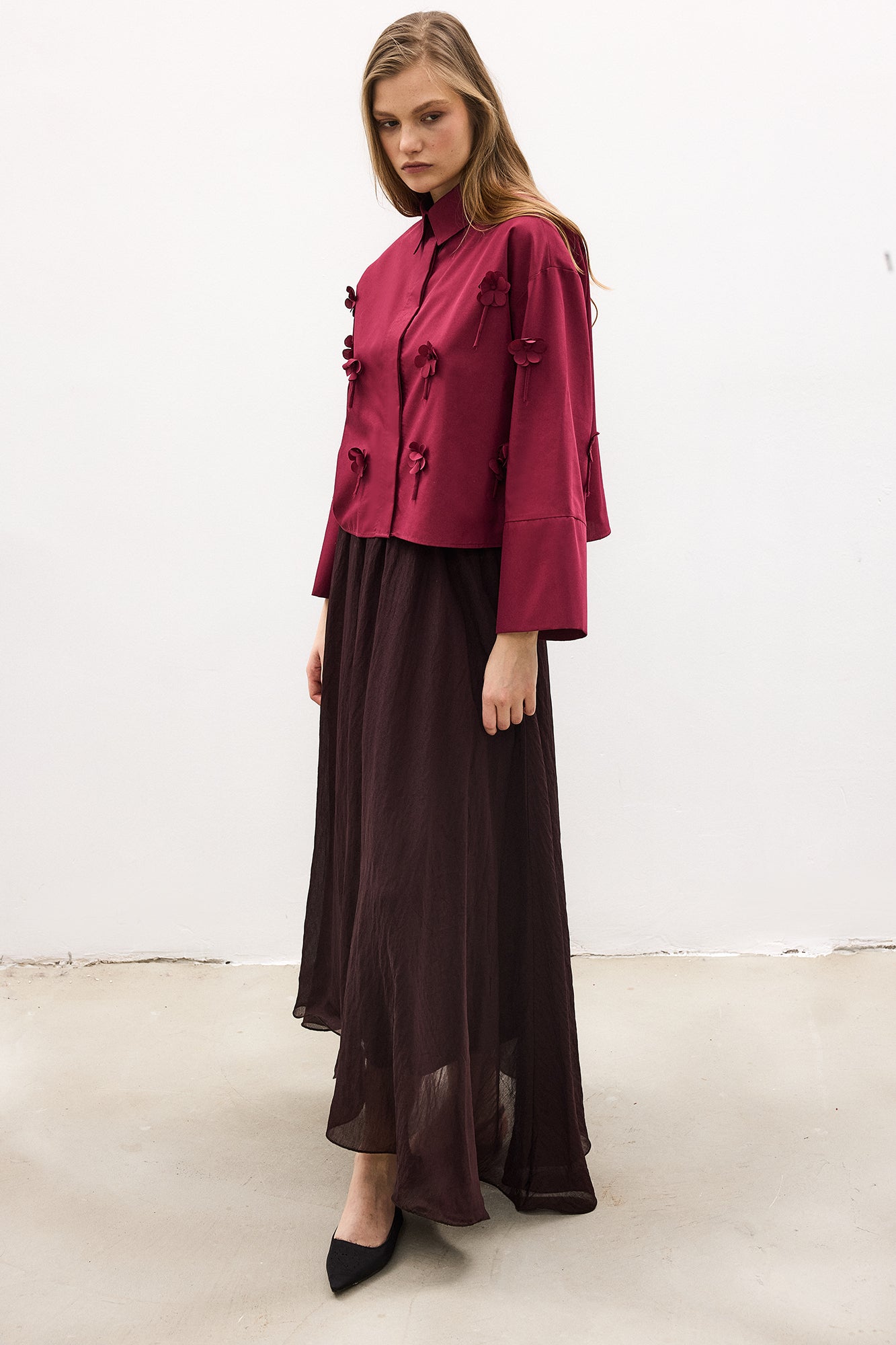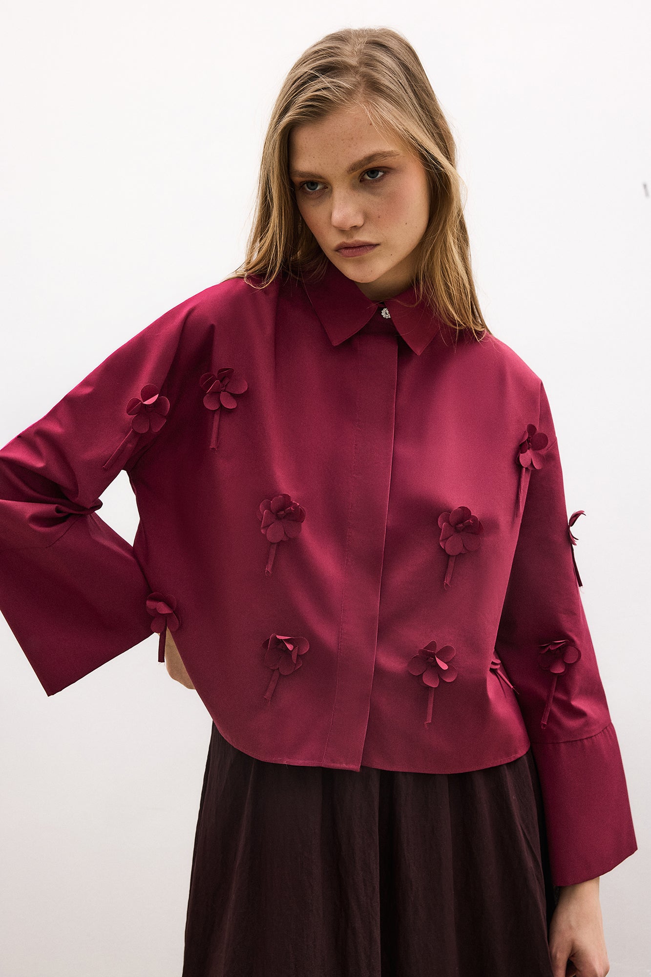 Gömlek yaka. Geniş manşetli. Gizli düğmeli ön kapama. Çiçek aplikeli.