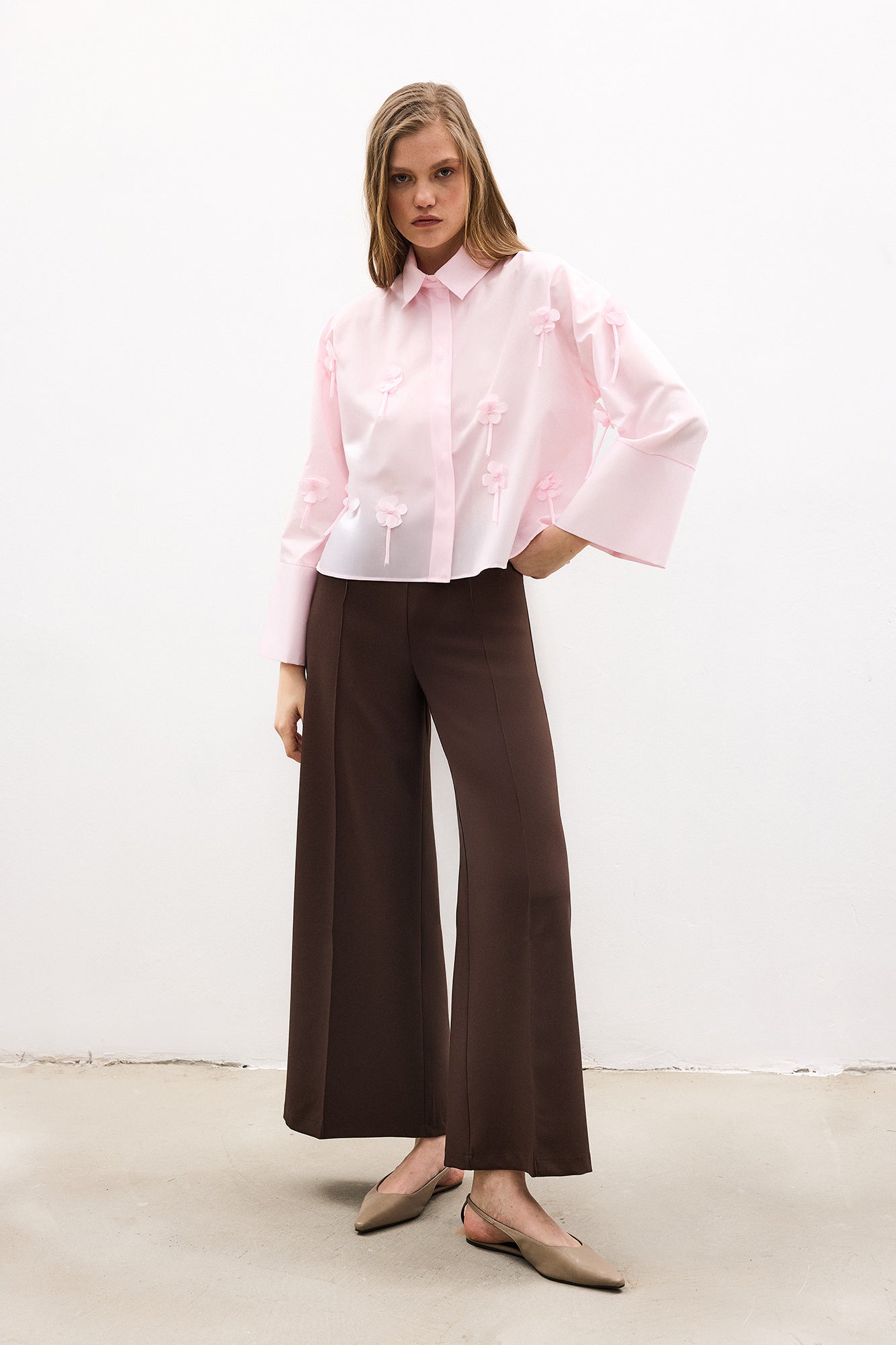 Gömlek yaka. Geniş manşetli. Gizli düğmeli ön kapama. Çiçek aplikeli.