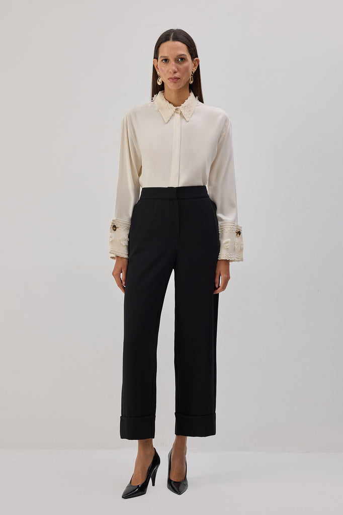 Önü düğme kapamalı. Gömlek yaka. Düğmeli manşetli uzun kollu. Çiçek aplikeli.