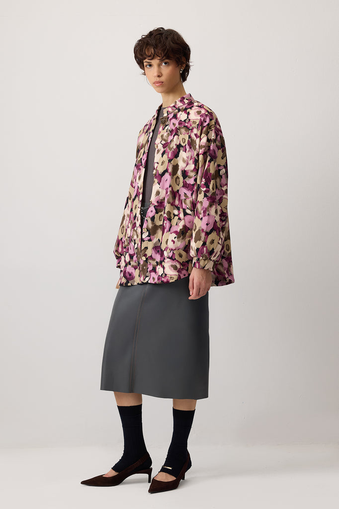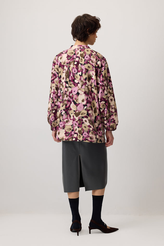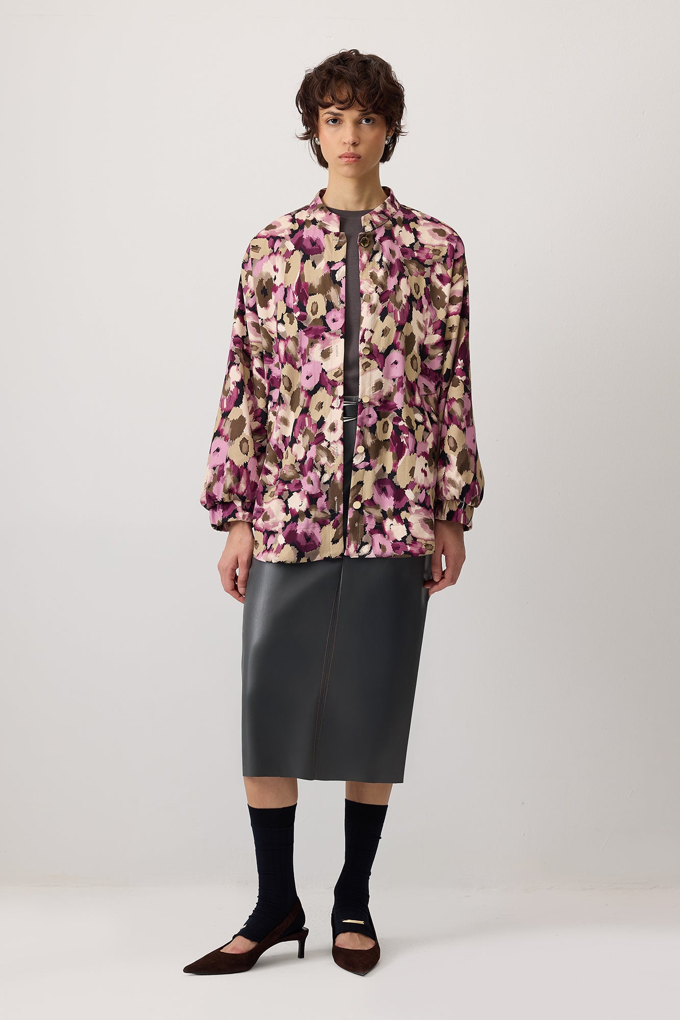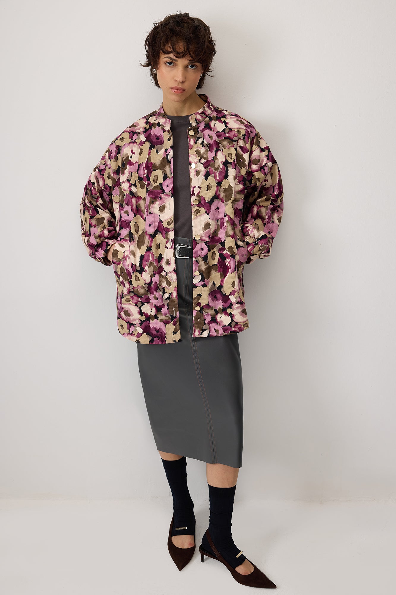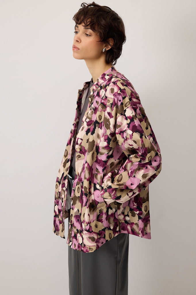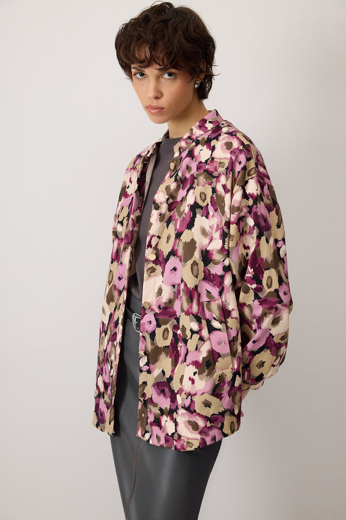 Desenli kumaş. Düğmeli. Uzun kollu. Yuvarlak yaka. Rahat kesim ceket.