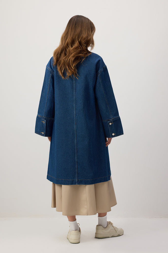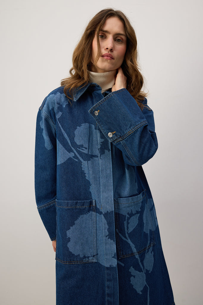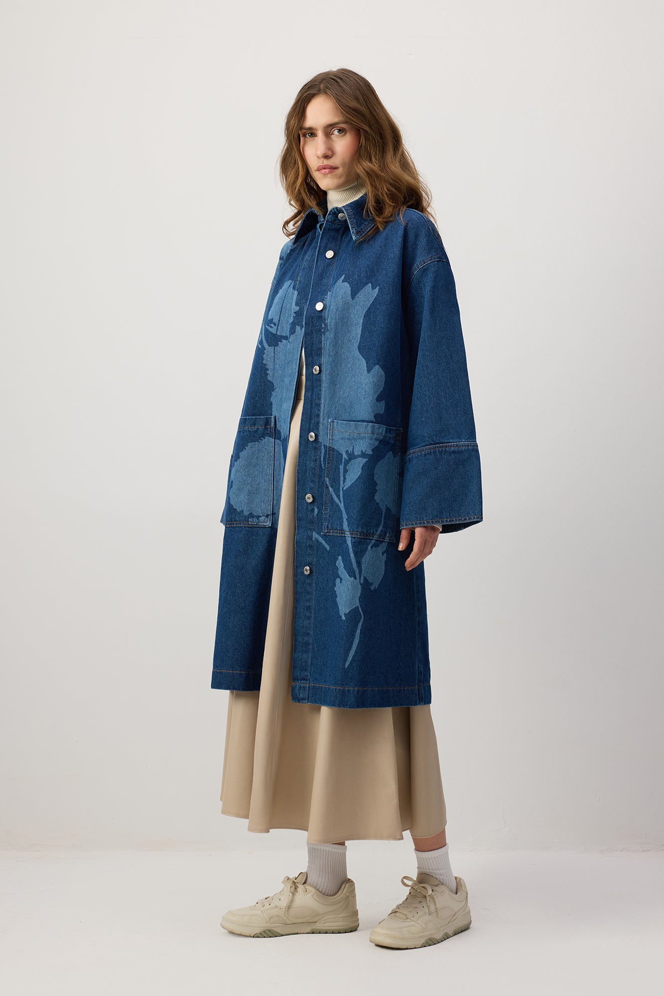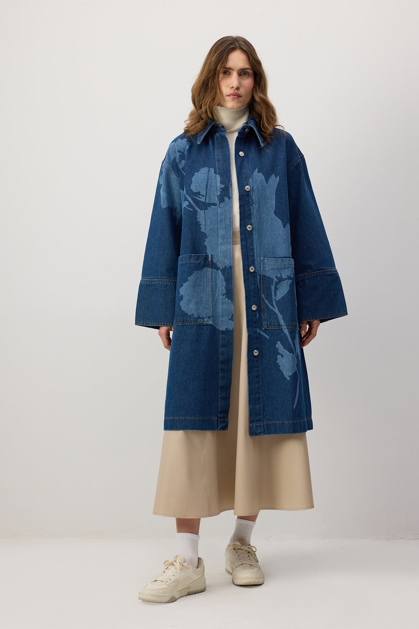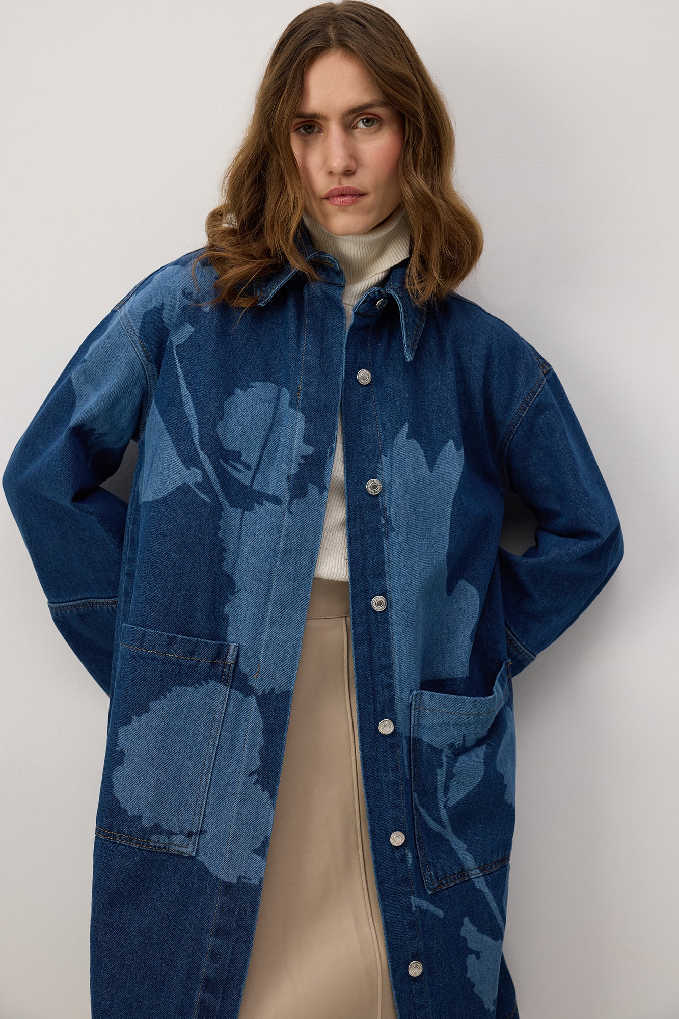 Desenli denim oversize ceket. Düğme kapamalı. Büyük cepli.