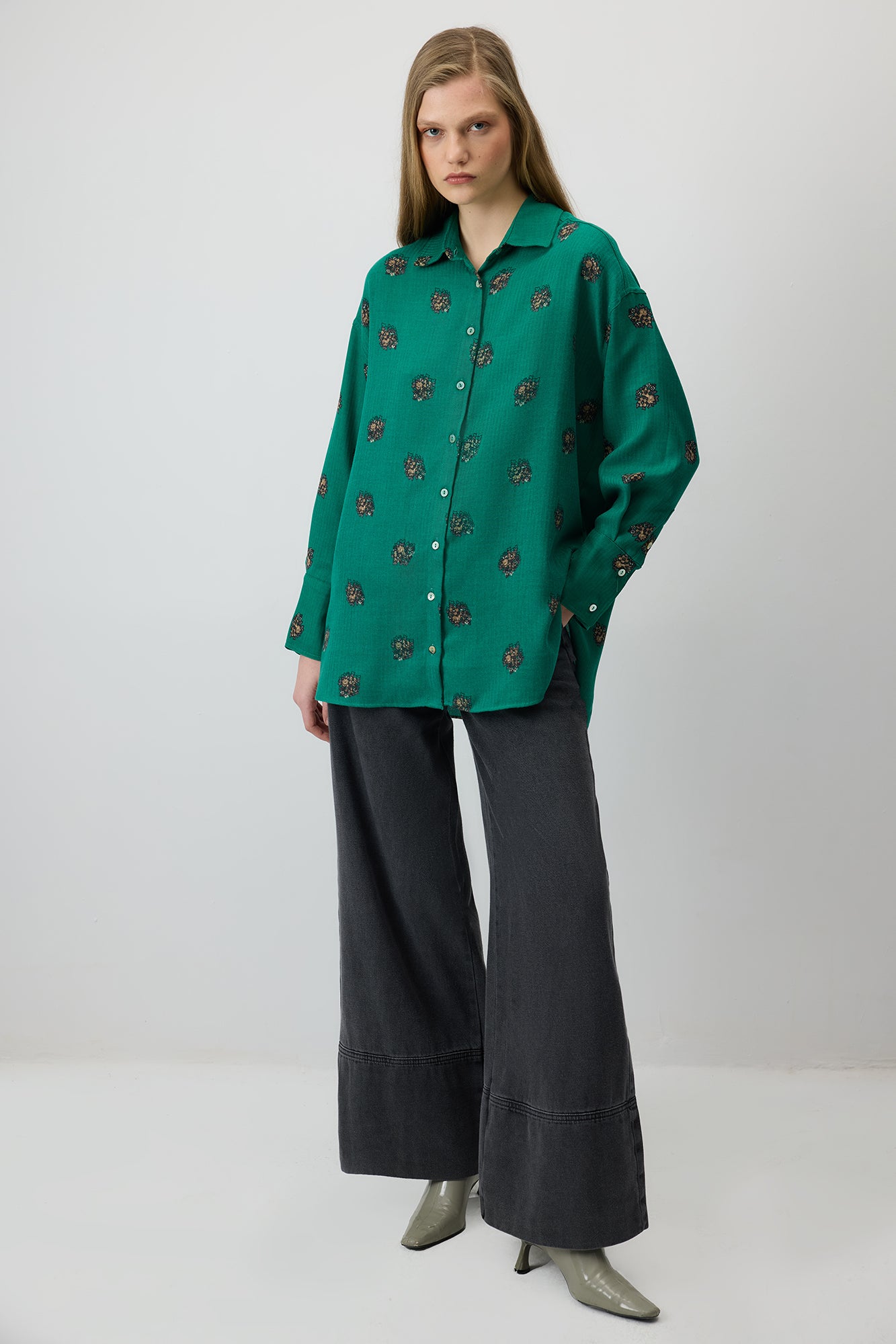 Yumuşak dokulu kumaşı ve desenli yüzeyiyle dikkat çeken bu gömlek, klasik yakası ve rahat kesimiyle modern bir görünüm sunar.