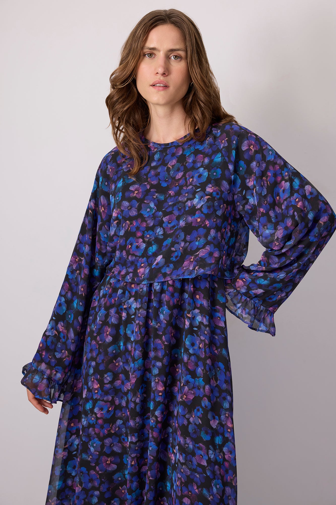 Şifon. Çiçek desenli. Bisiklet yaka. Pileli.