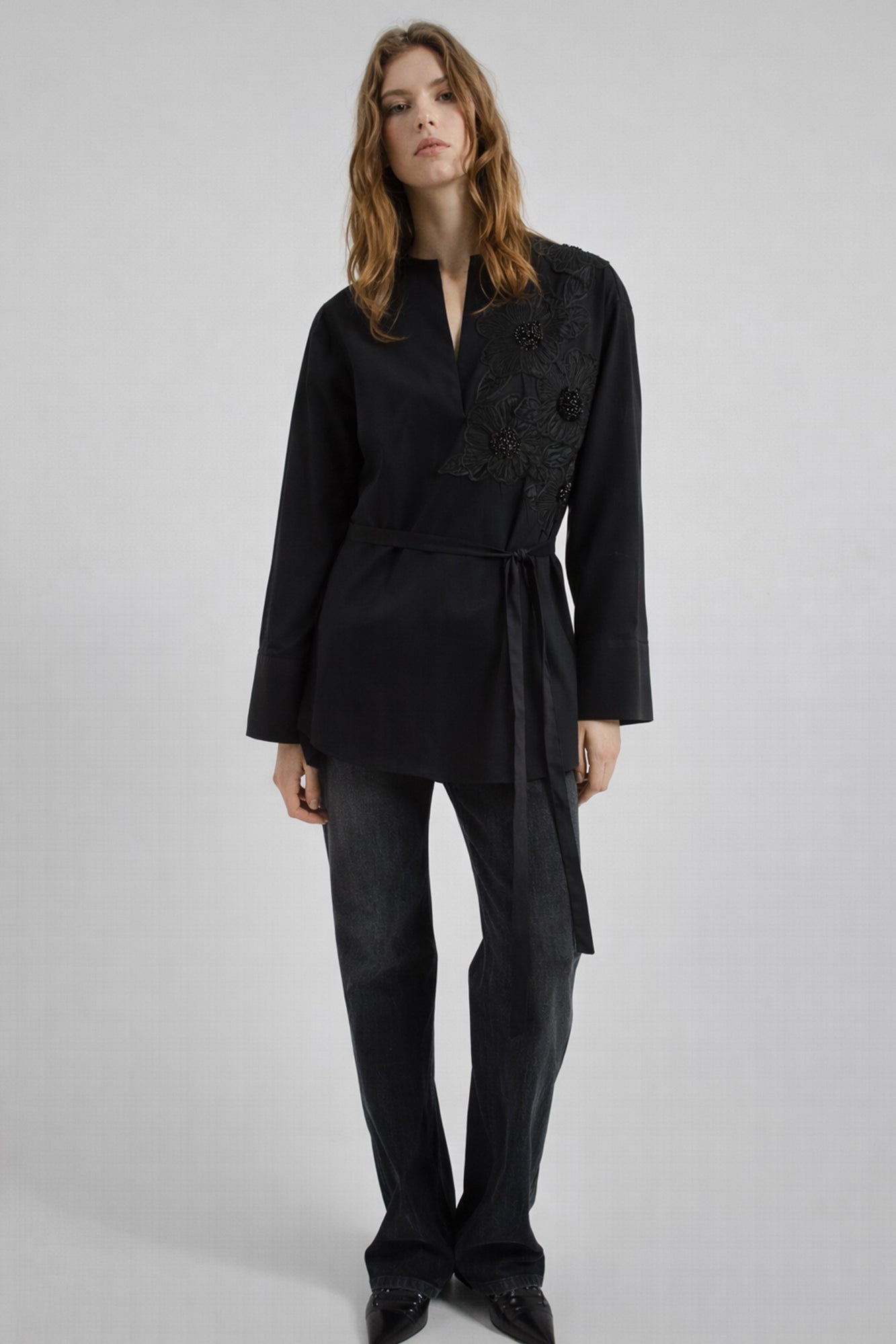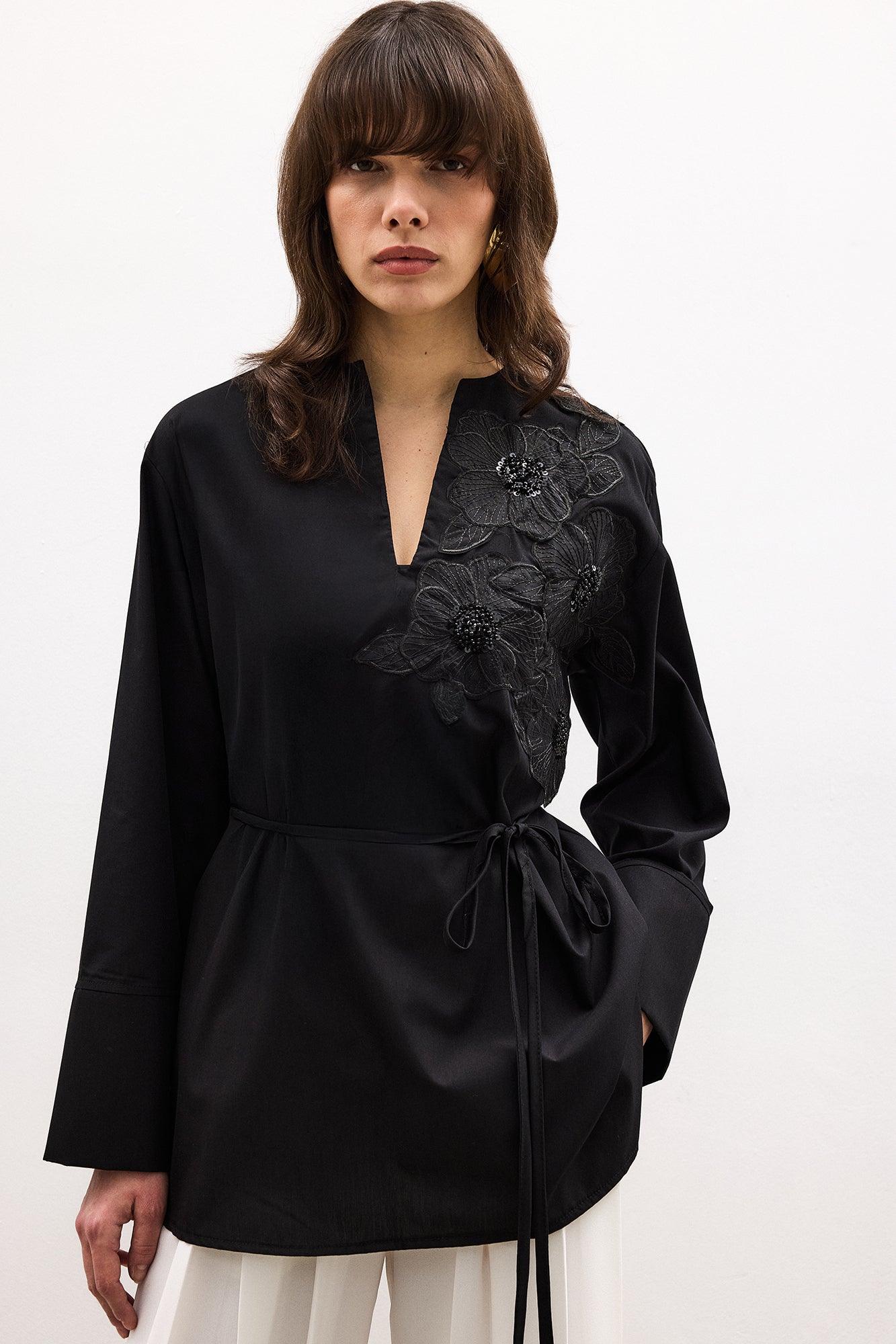 Göğüs bölümünde çiçek aplikeli ve boncuk işlemeli tasarım. Ayarlanabilir bağcıklı kuşak. Uzun kol, manşetli.