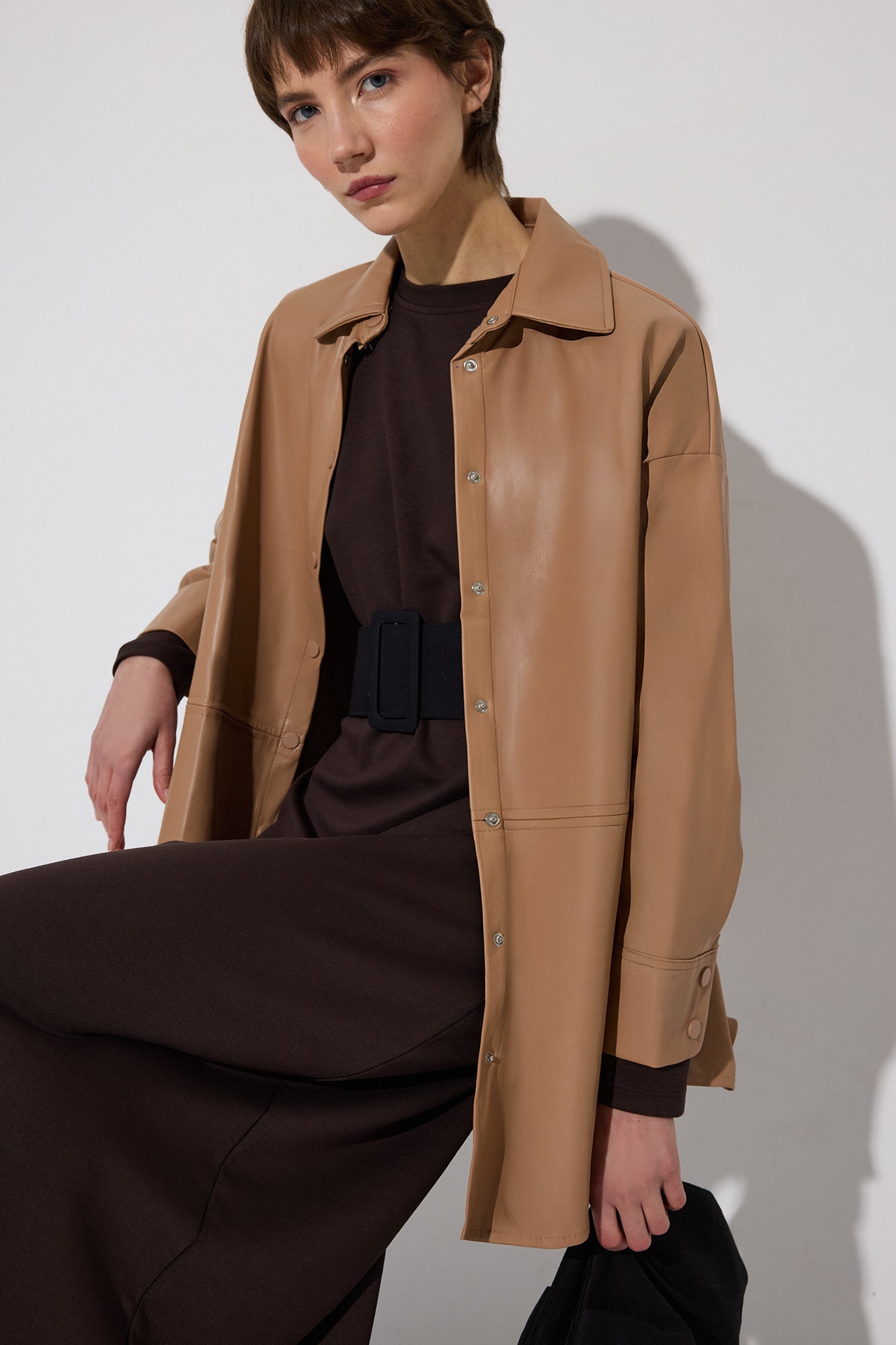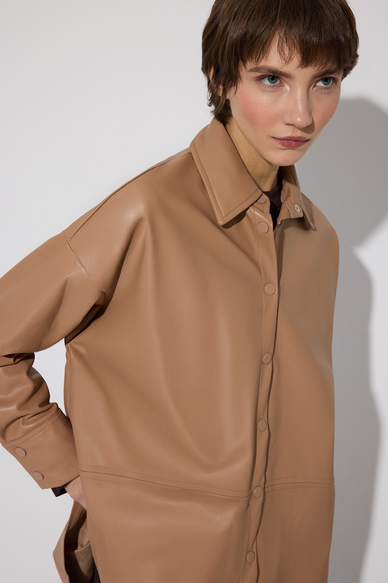 Gömlek yaka. Önü çıtçıt kapamalı. Vegan deri gömlek.