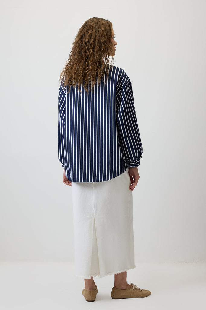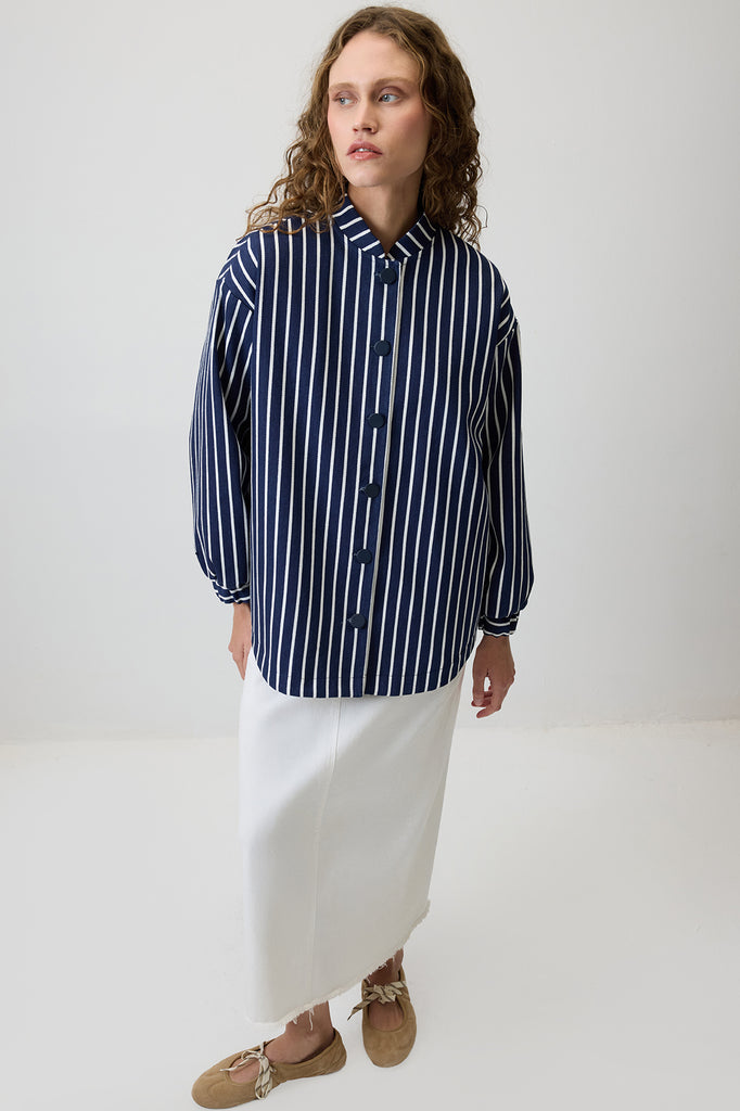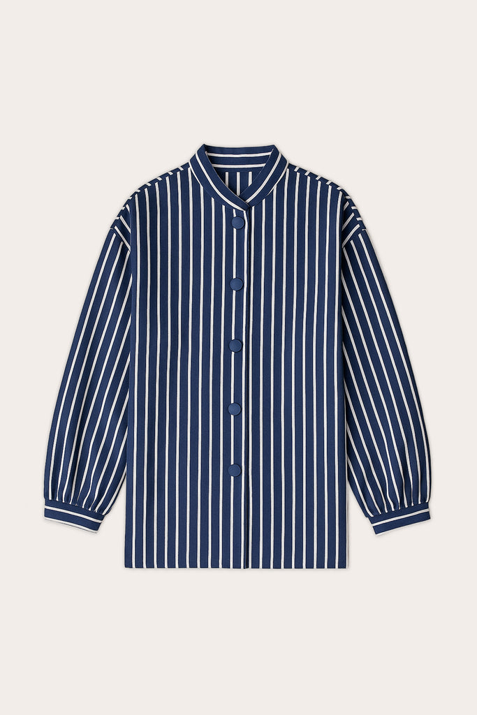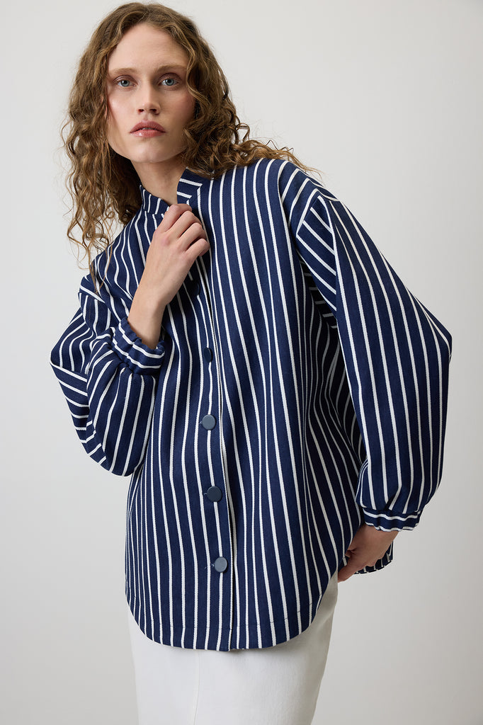 Düşük omuz. Uzun kollu. Düğmeli. Çizgili gabardin ceket.