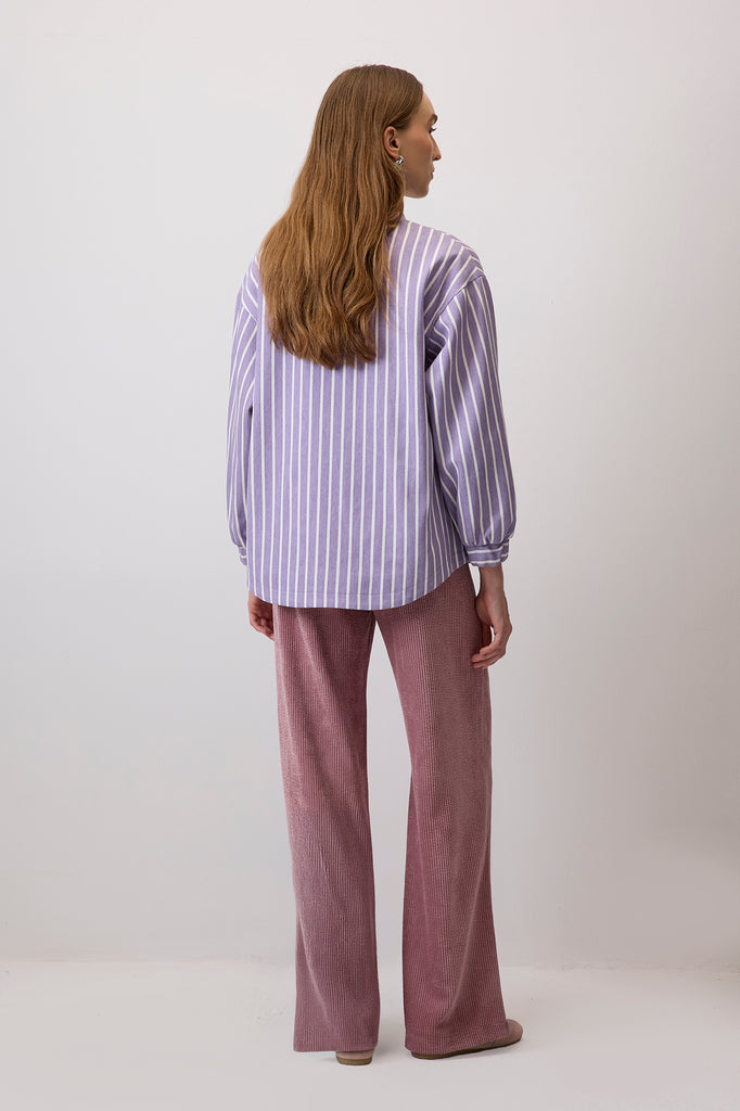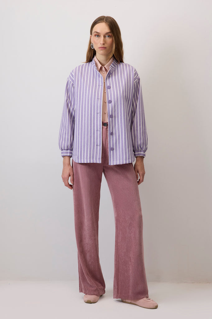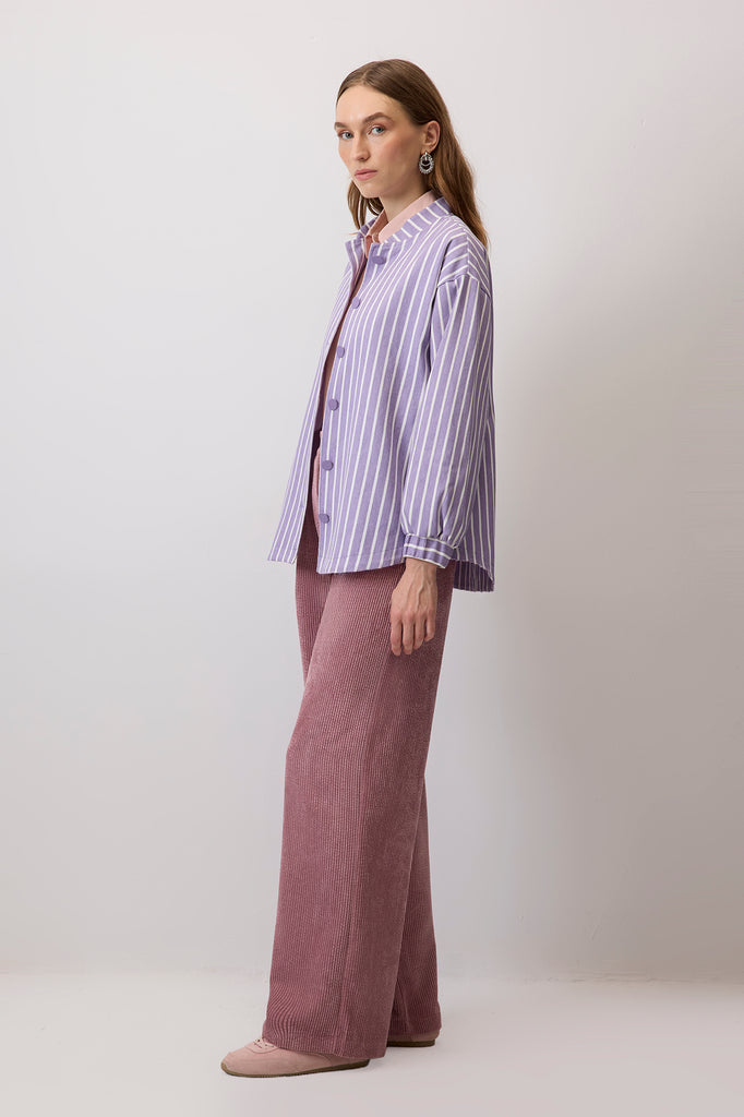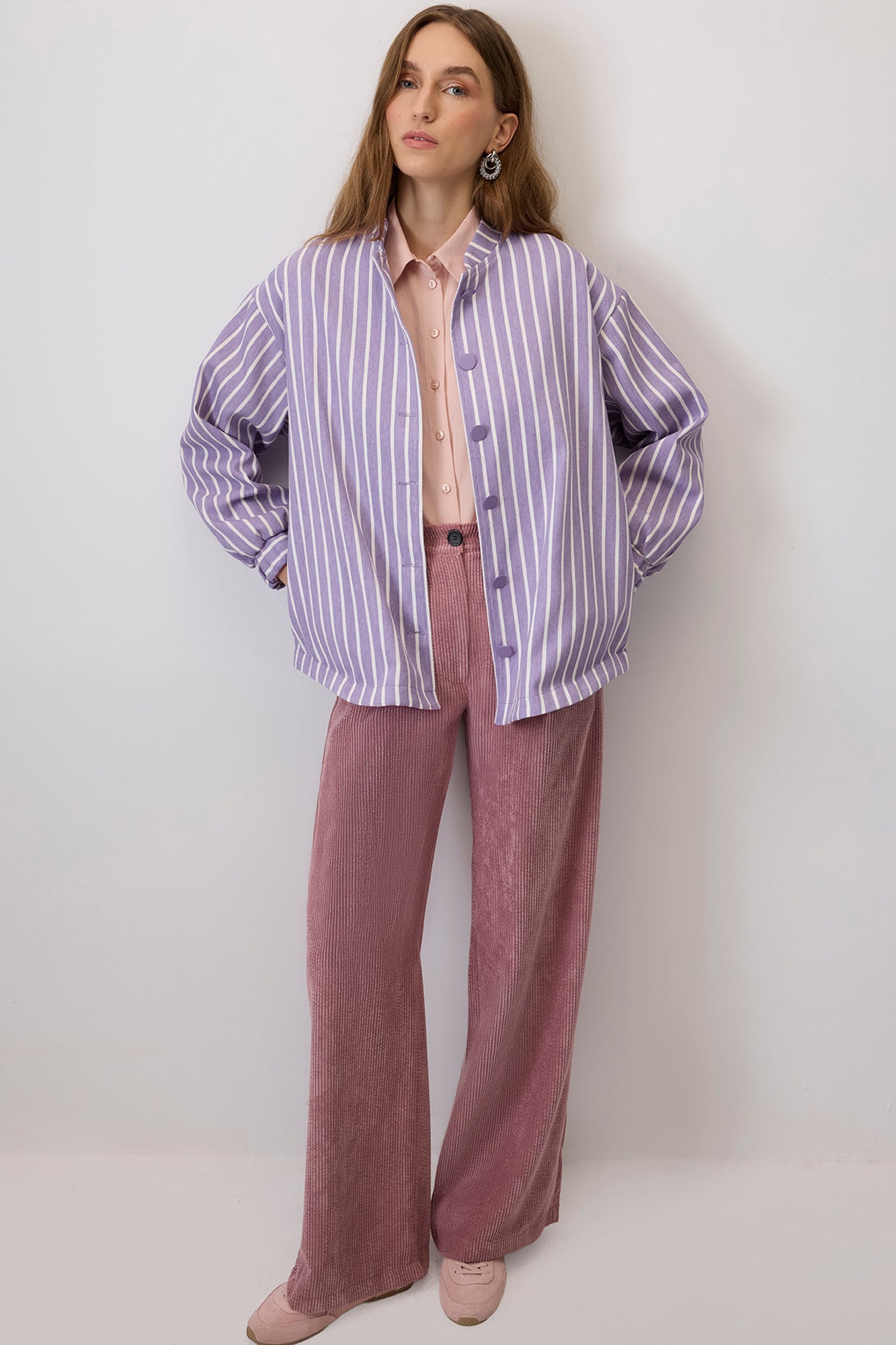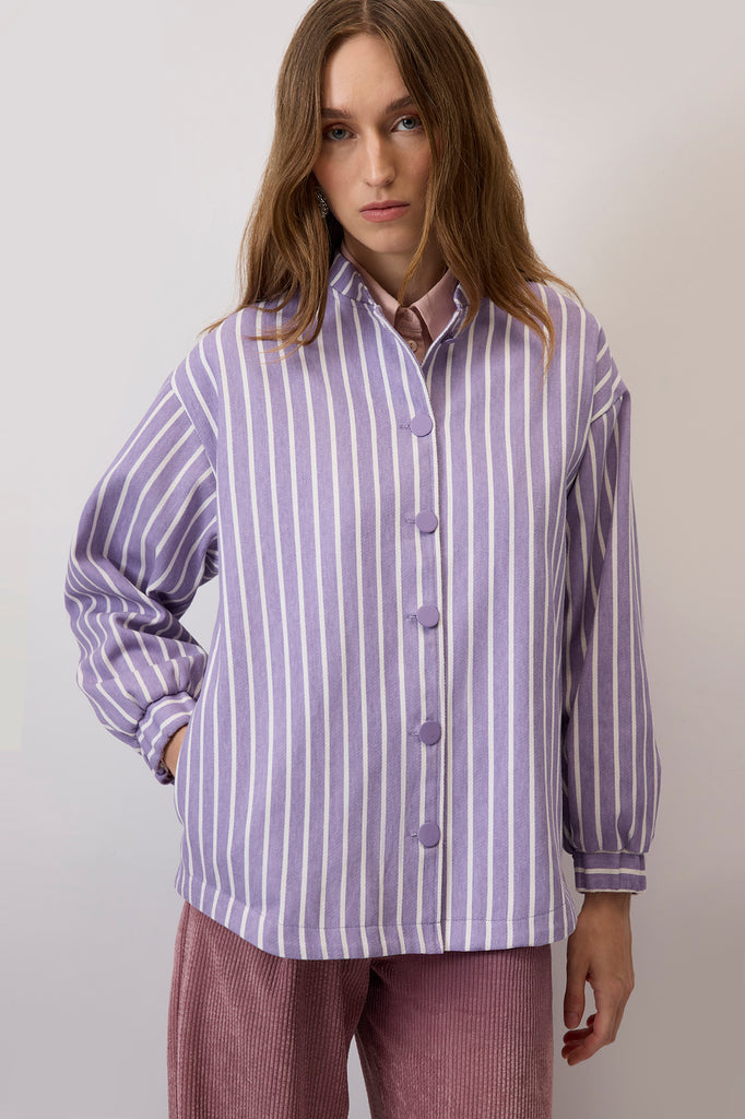 Düşük omuz. Uzun kollu. Düğmeli. Çizgili gabardin ceket.