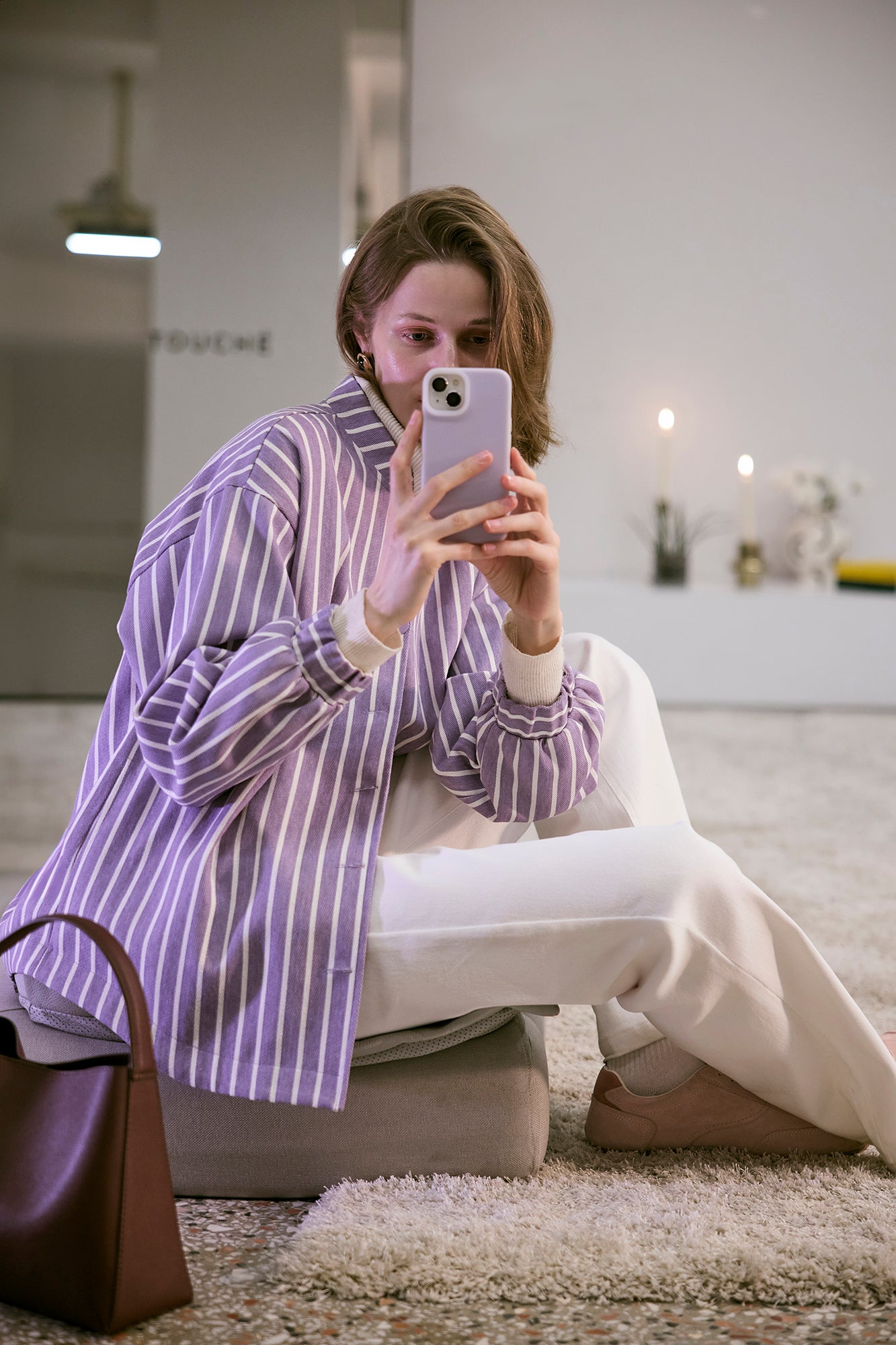 Düşük omuz. Uzun kollu. Düğmeli. Çizgili gabardin ceket.