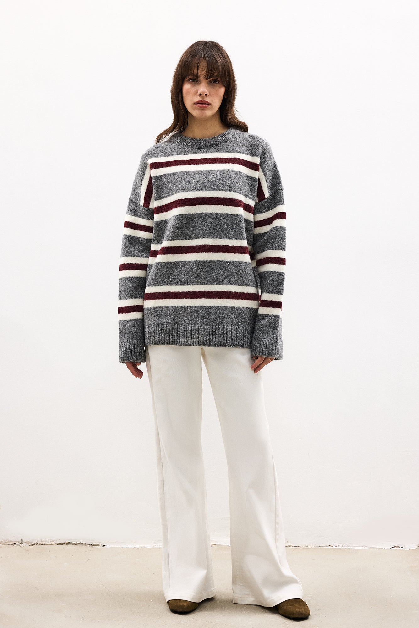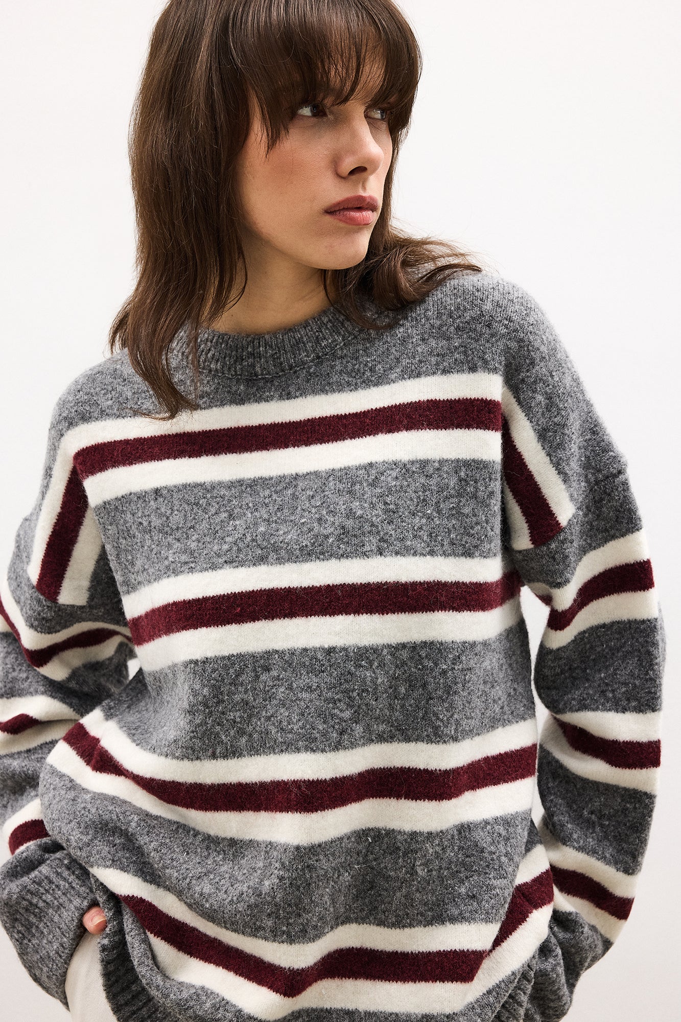 Bisiklet yaka. Uzun kol. Düşük omuz. Çizgili.
