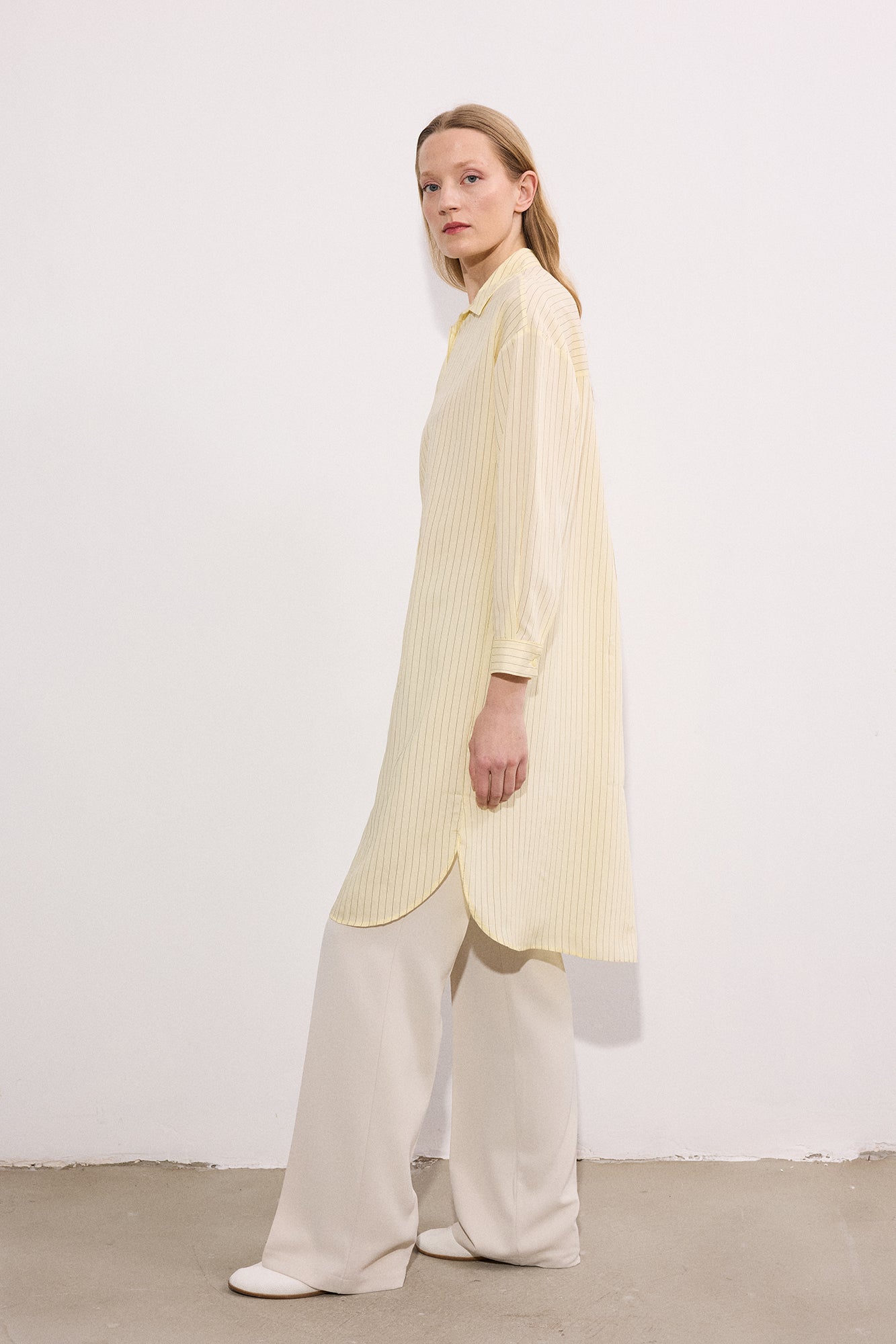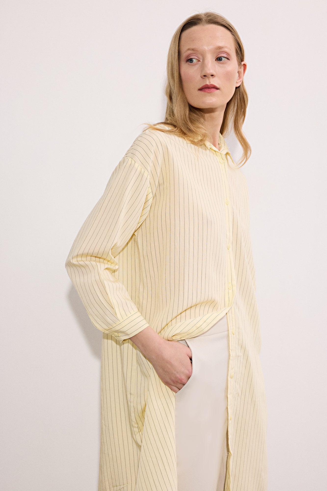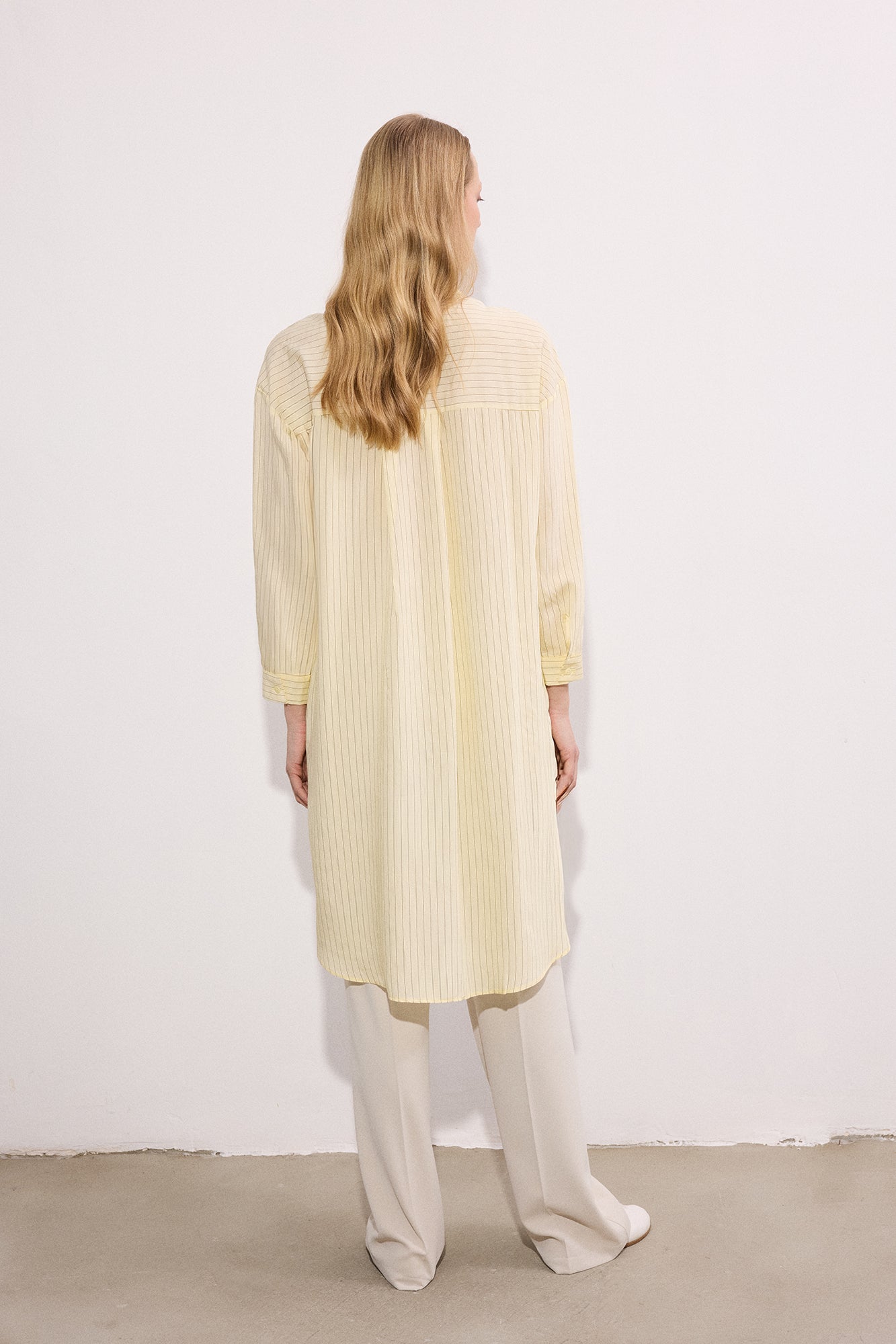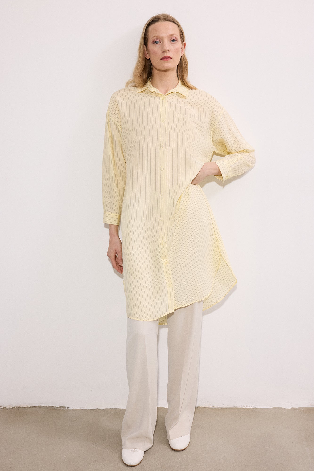 Gömlek yaka. Uzun kol. Önü düğme kapamalı. Çizgili. Uzun form gömlek.
