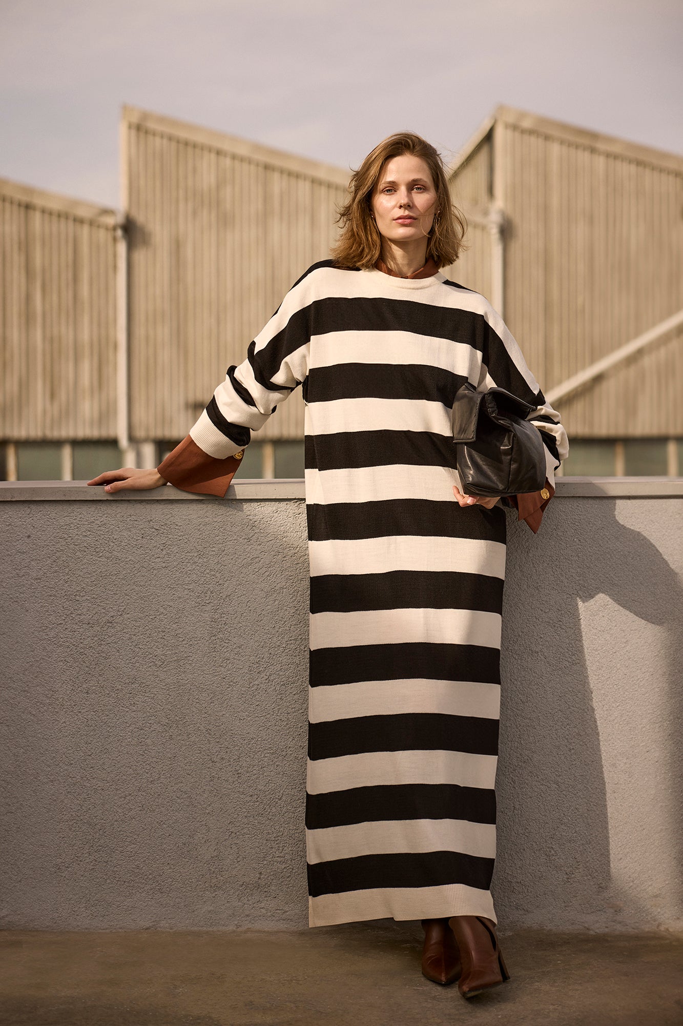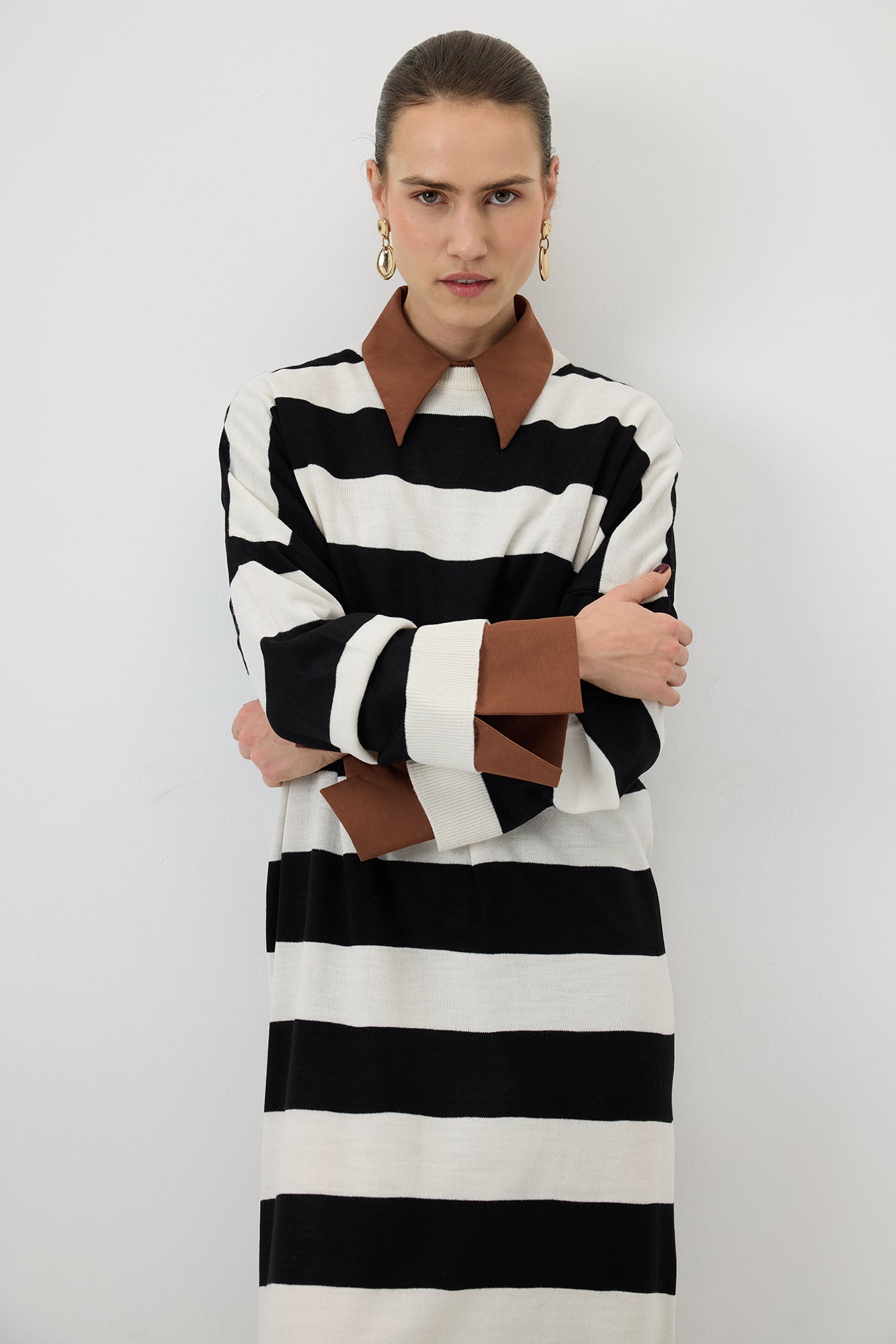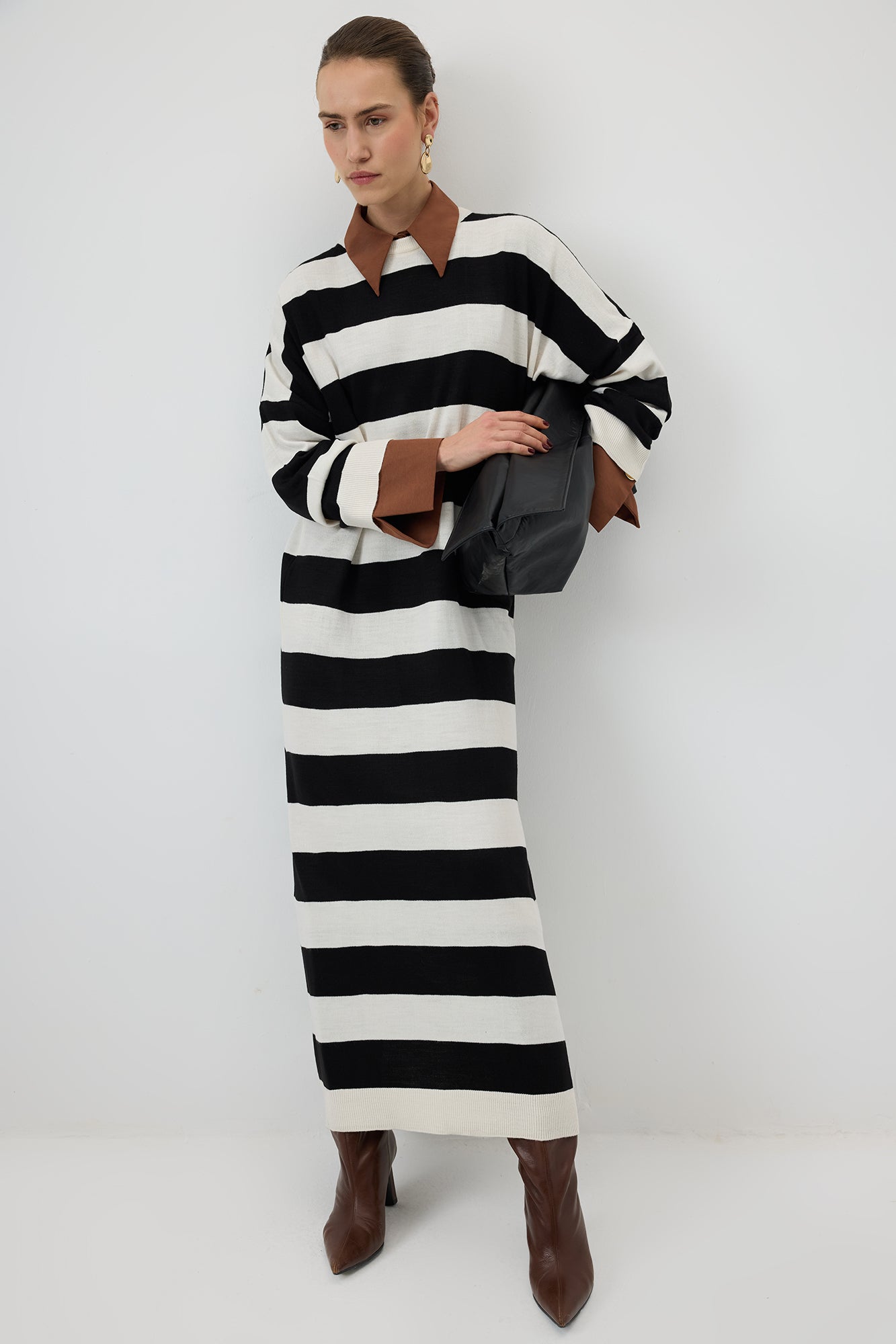 Rahat kesimi ve modern çizgileriyle dikkat çeken bu triko elbise, zamansız ve şık bir stil sunuyor. Yumuşak ve esnek dokusu sayesinde gün boyu konfor sağlarken, oversize kesimi hareket özgürlüğü sunarak sportif ve şık bir görünüm yaratıyor. Kontrast ince çizgi deseni, elbiseye dinamik bir hava katarken, minimal tasarımıyla her tarza kolayca uyum sağlıyor. Sneakerlarla casual bir stil oluşturabilir, topuklu ayakkabılarla ise daha sofistike bir hava yakalayabilirsiniz. Hem günlük hem de şehir şıklığında tercih edebileceğiniz bu elbise, gardırobunuzun vazgeçilmezlerinden biri olacak!