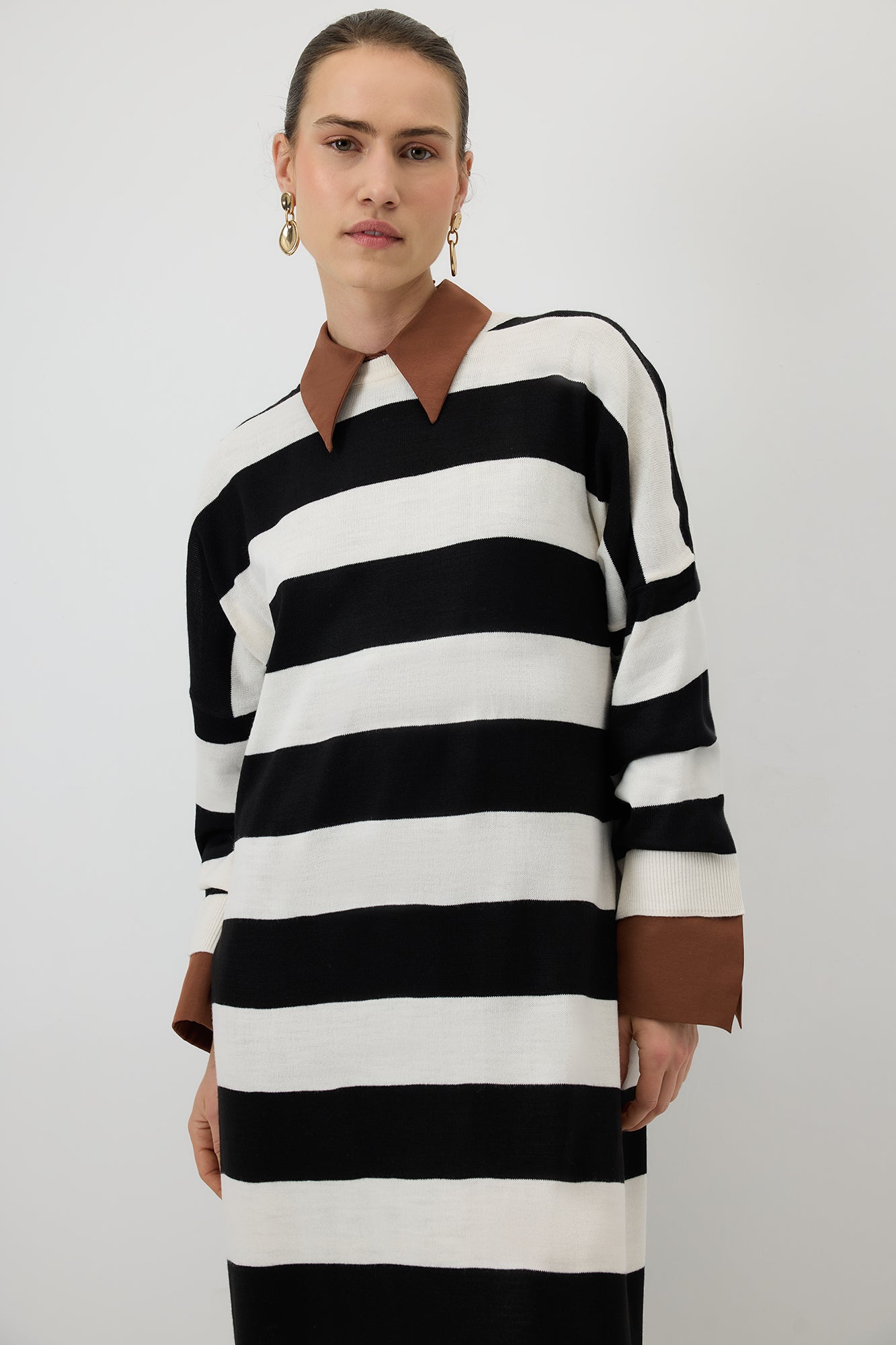 Bisiklet yaka. Düşük omuz. Kontrast çizgili. Yumuşak dokulu.