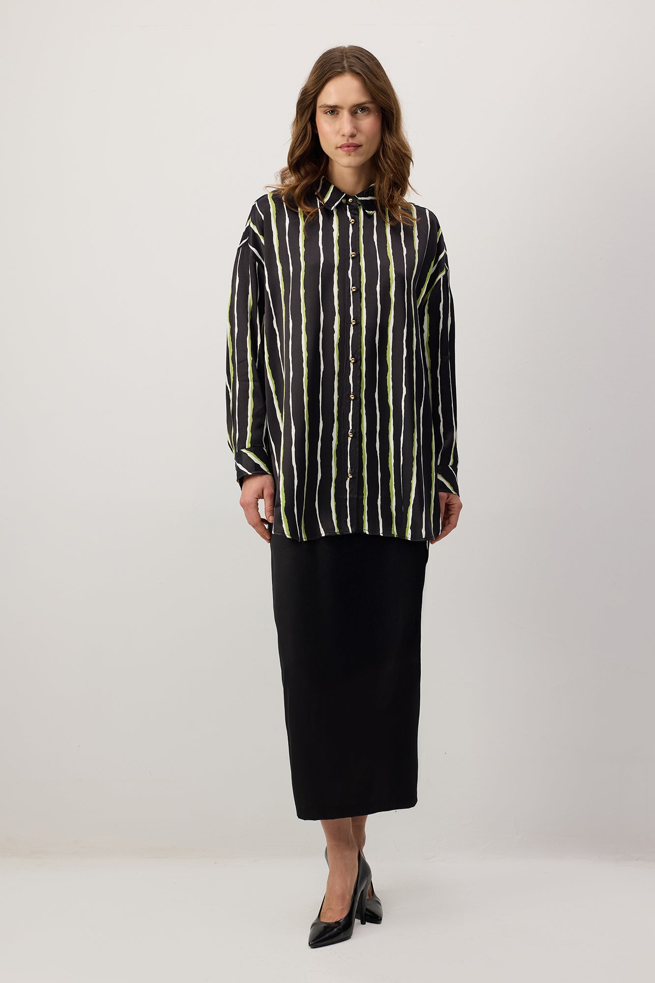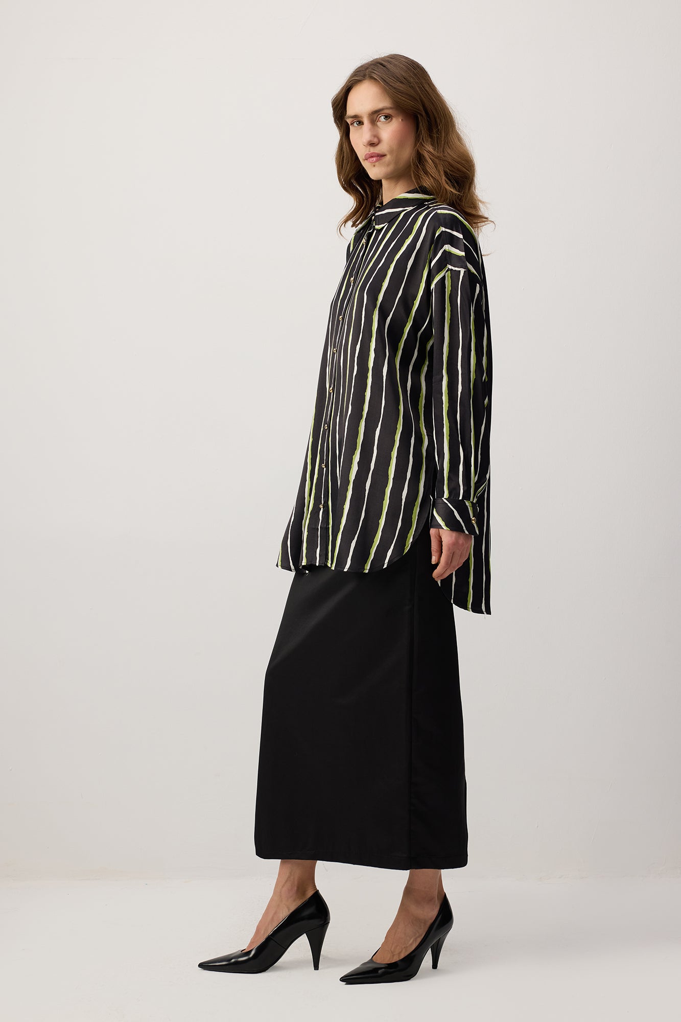 Parlak saten dokusu ve dikey çizgi deseniyle modern bir görünüm sunan bu gömlek, hafif dökümlü formuyla rahat ve zarif bir duruş kazandırır. Önden düğmeli tasarımıyla klasik bir şıklığı korurken, kumaşın akıcı yapısı gün boyu konfor sağlar. Hem ofis stilinde hem de şehir kombinlerinde kolaylıkla kullanılabilir.