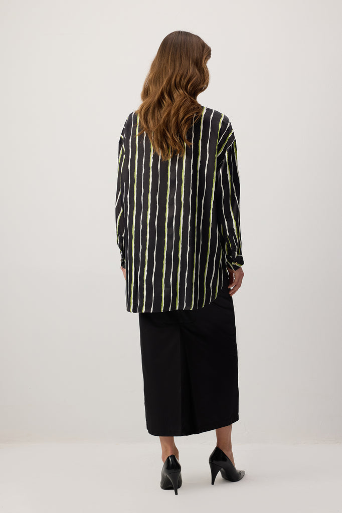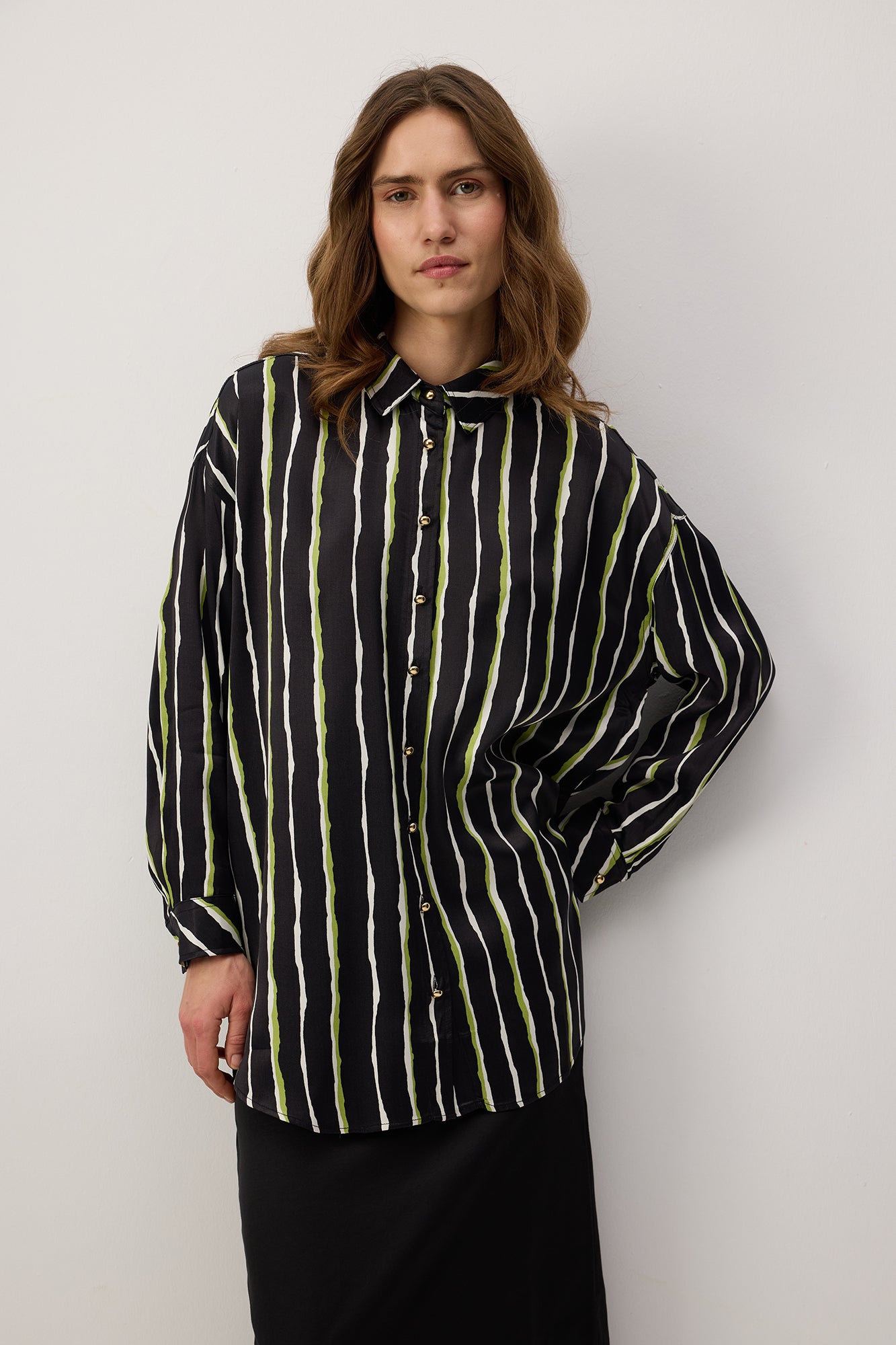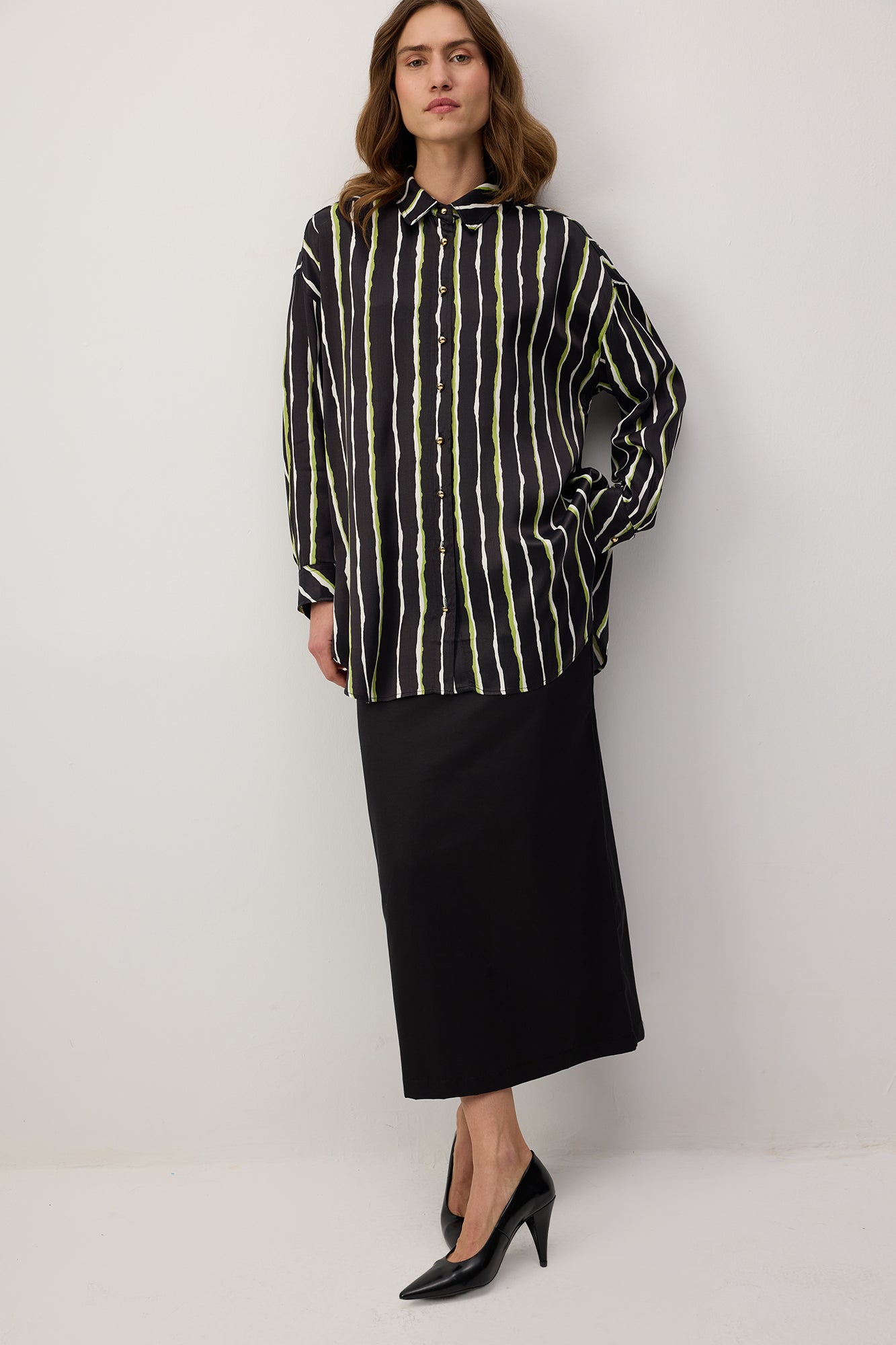 Dikey çizgili saten gömlek. Önden düğmeli. Uzun kollu.