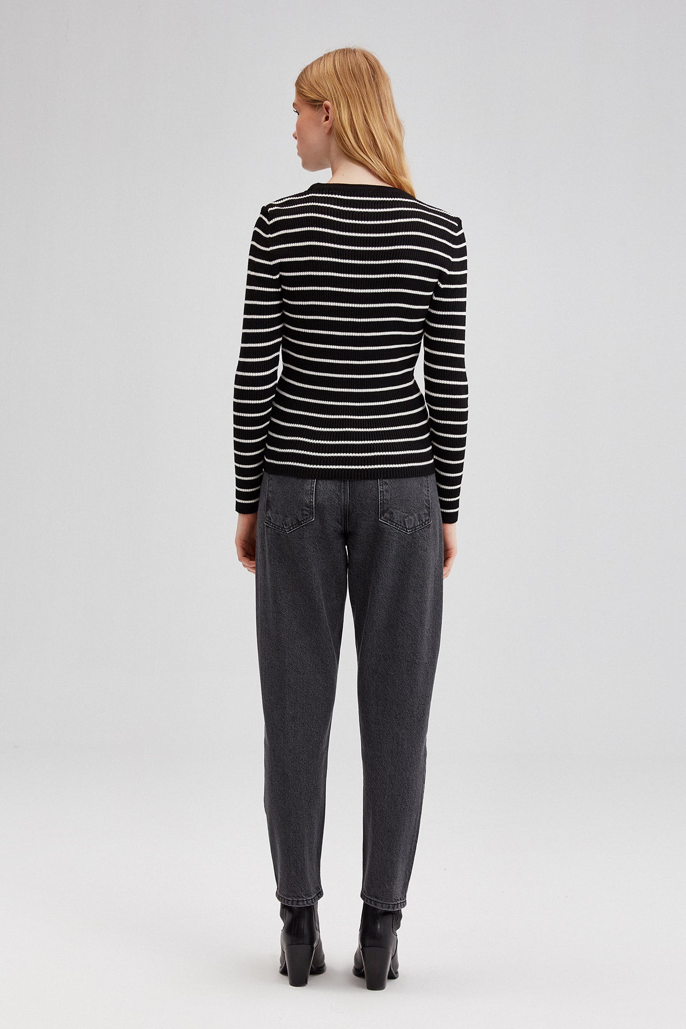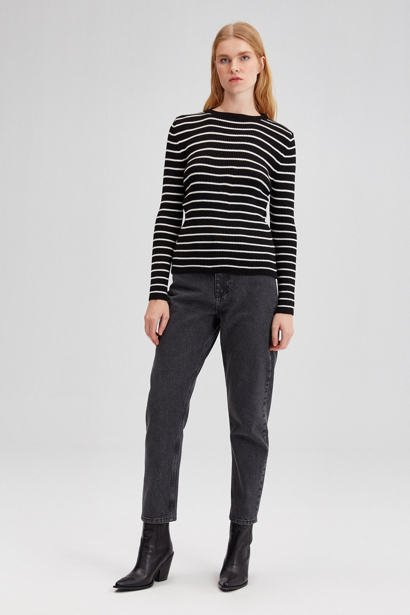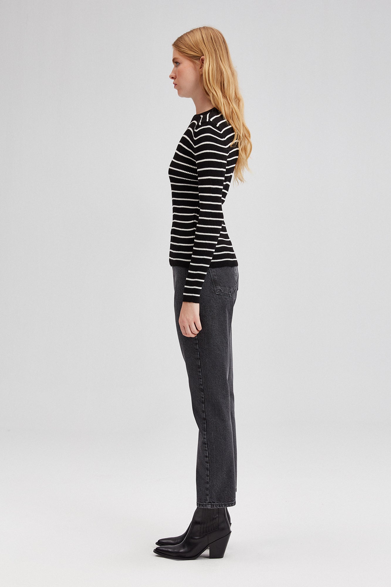 Uzun kollu, çizgili, bisiklet yaka triko kazak.
