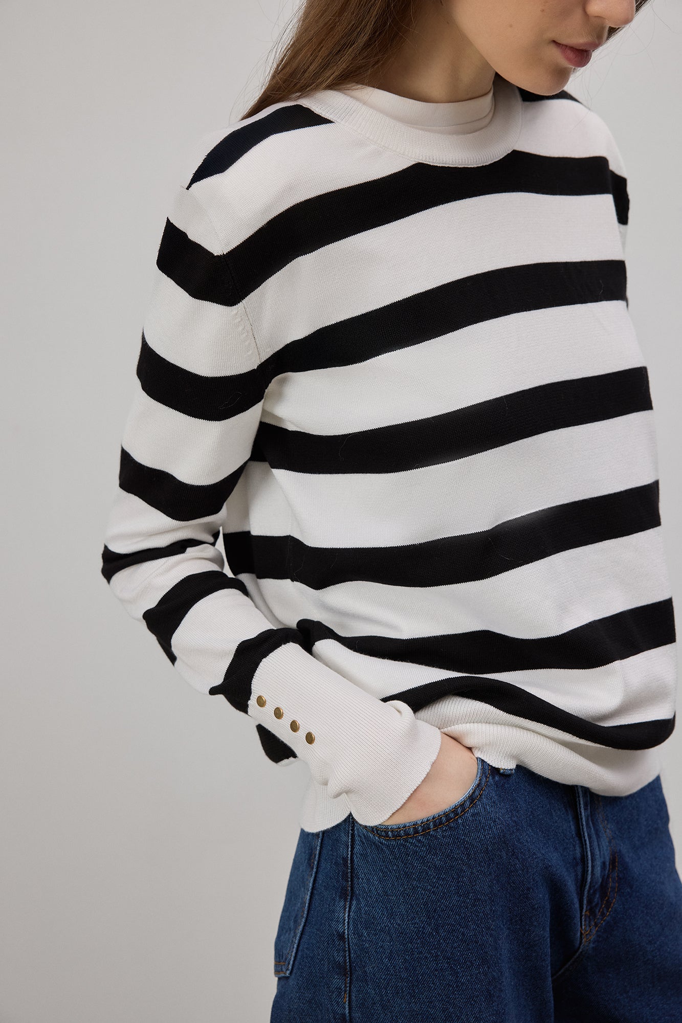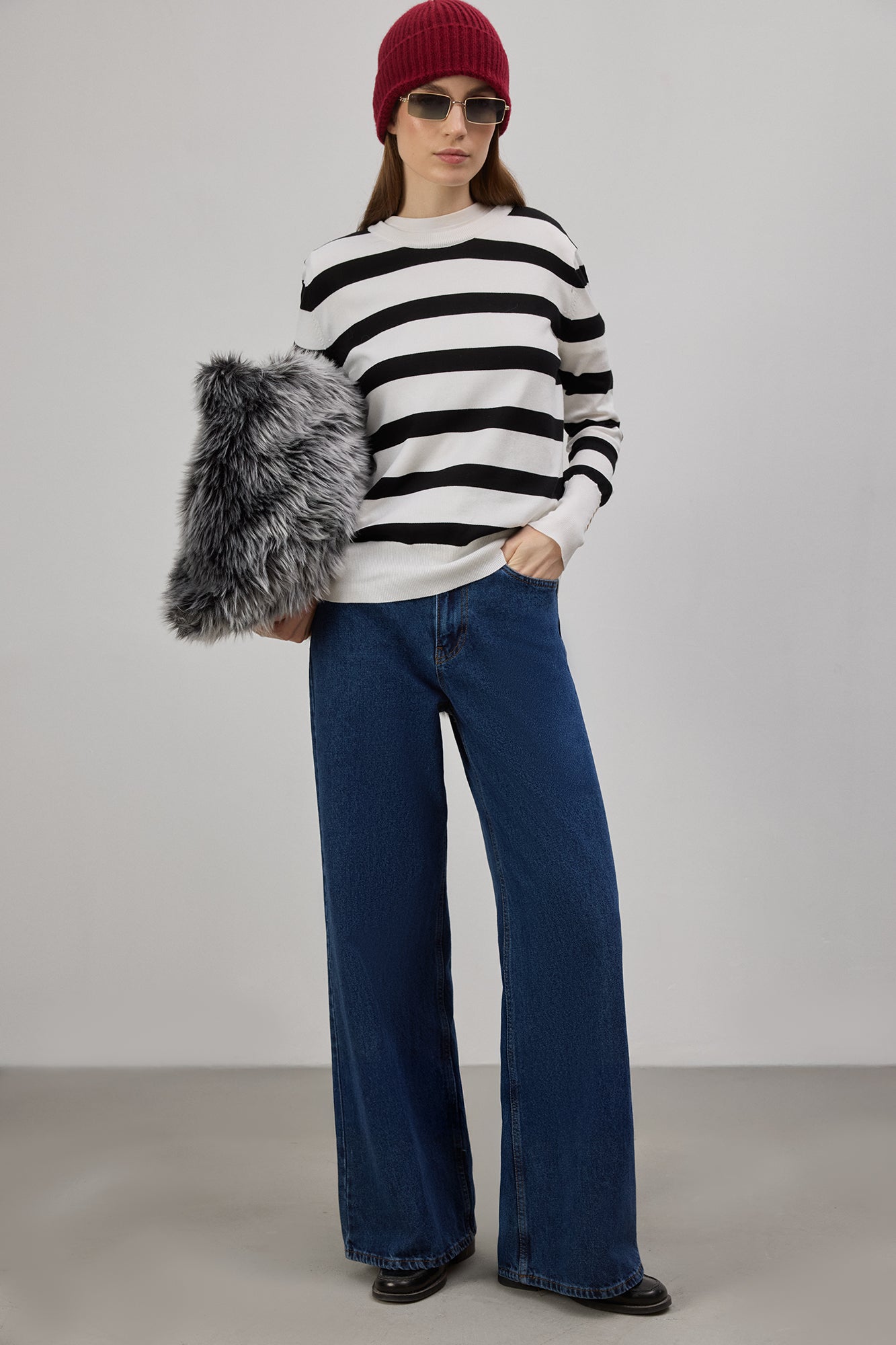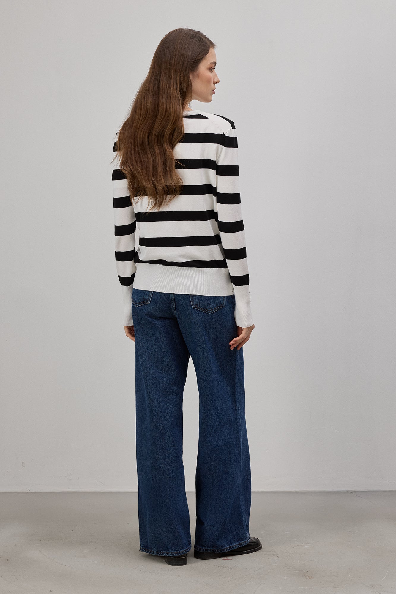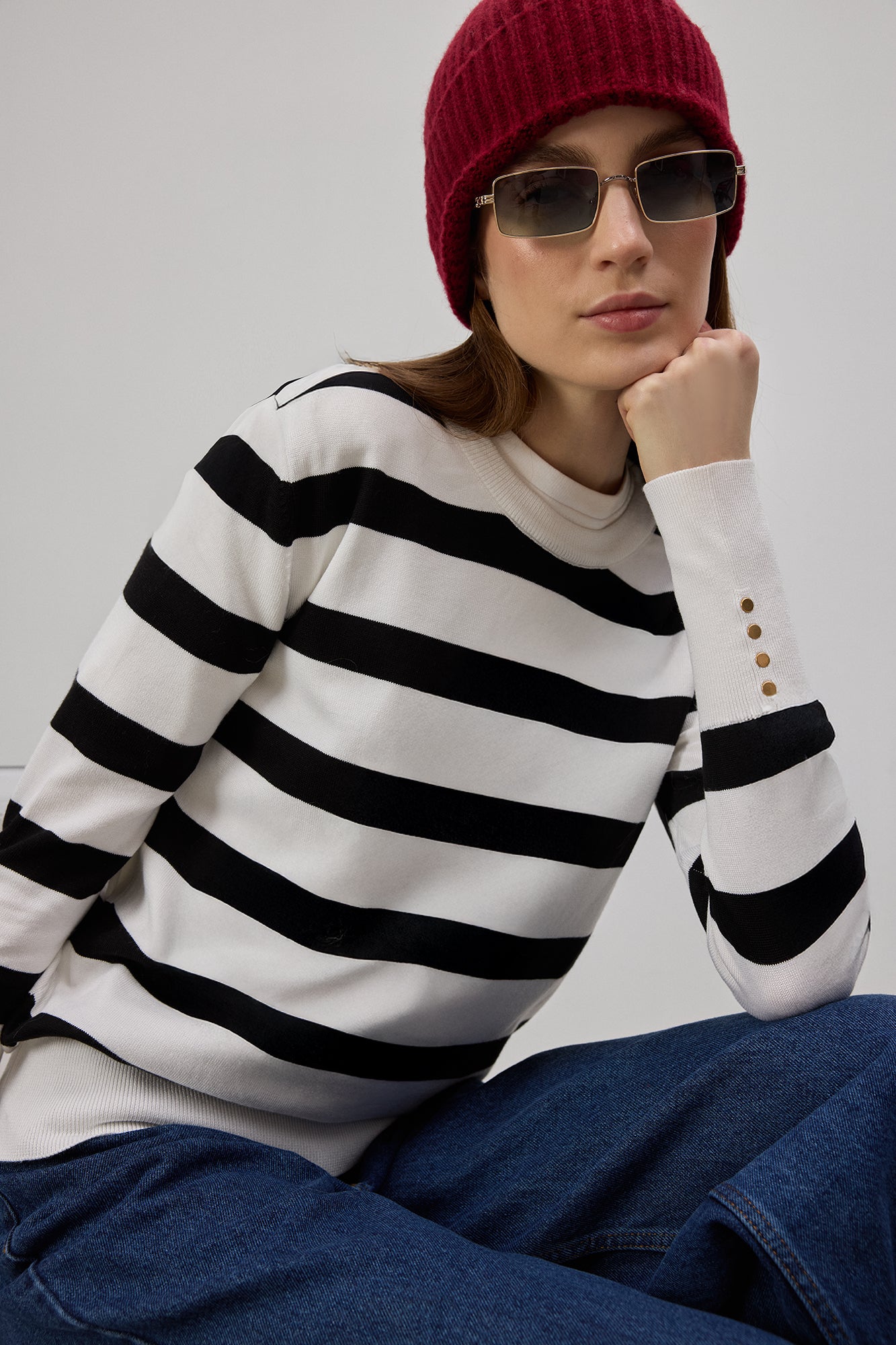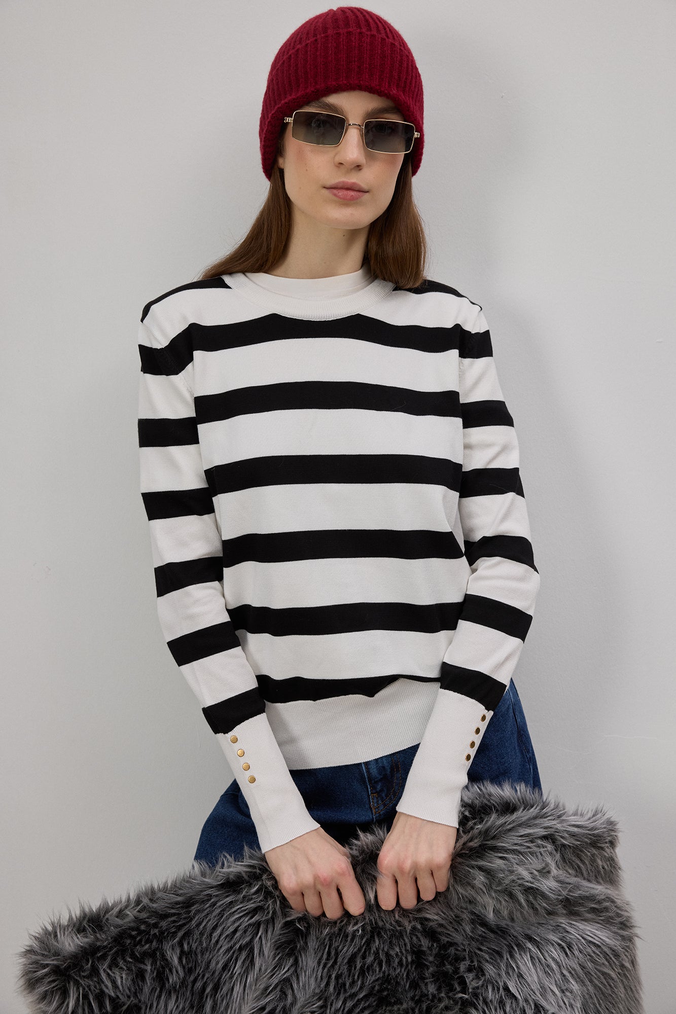 Bisiklet yaka. Uzun kollu. Çizgili. Manşet detaylı. Triko kazak.