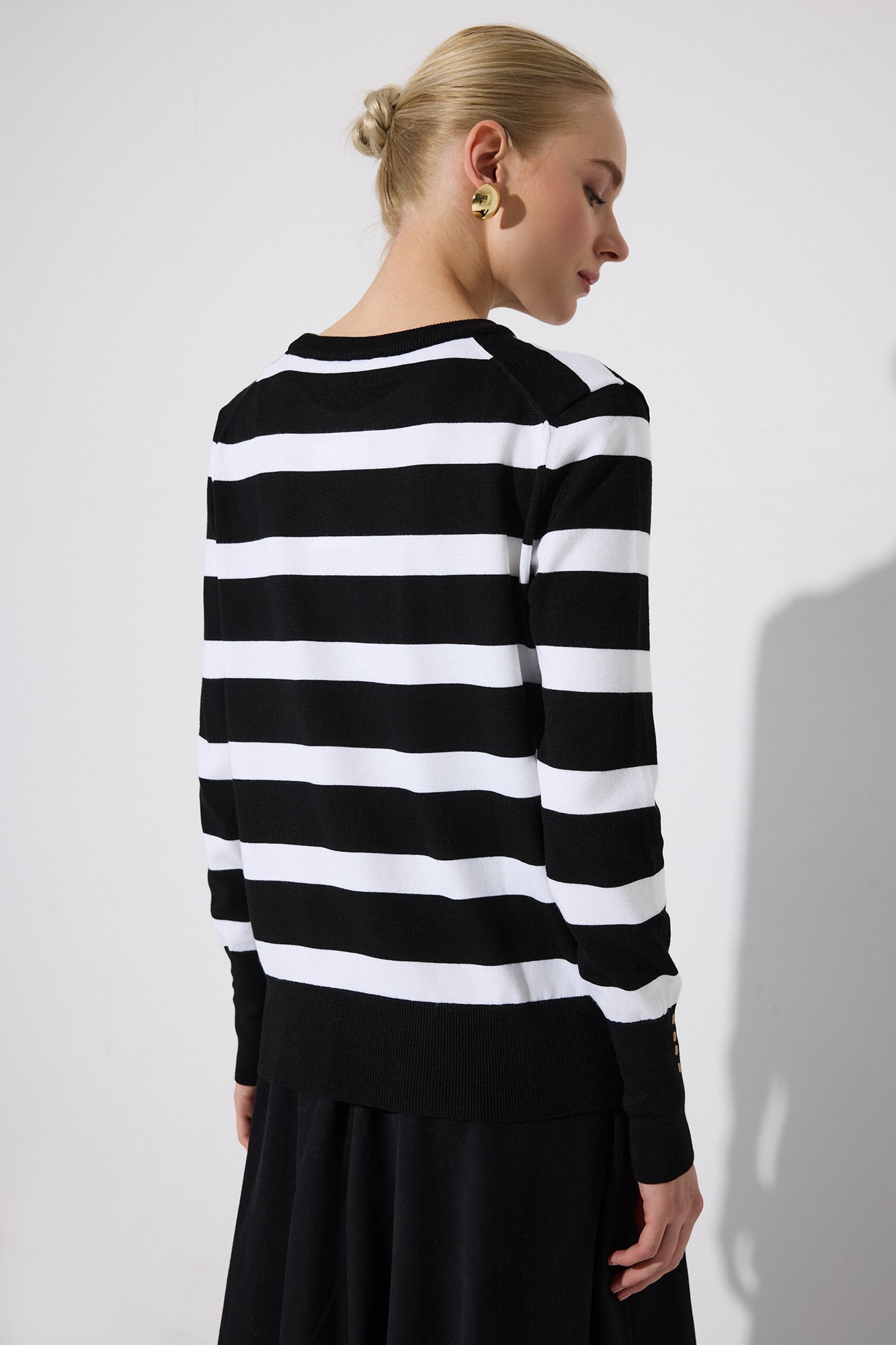Bisiklet yaka. Uzun kollu. Çizgili. Manşet detaylı. Triko kazak.