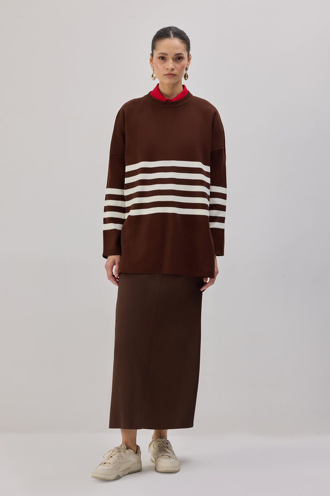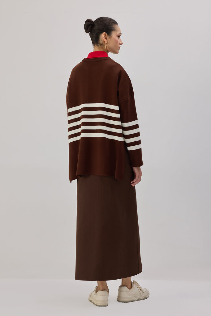 Bisiklet yaka. Uzun kollu ve düşük omuzlu. Çizgili. Yırtmaçlı. Triko.