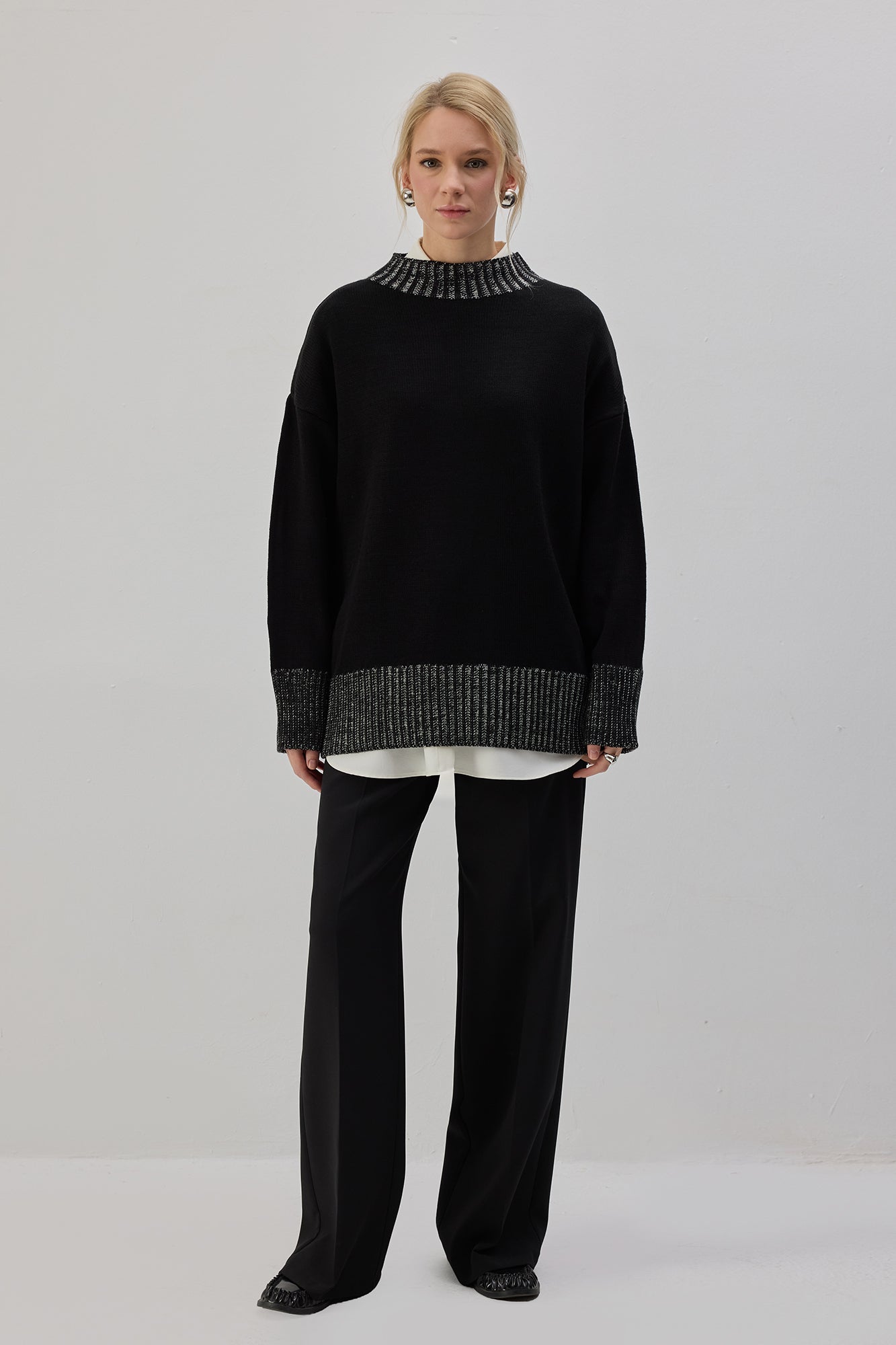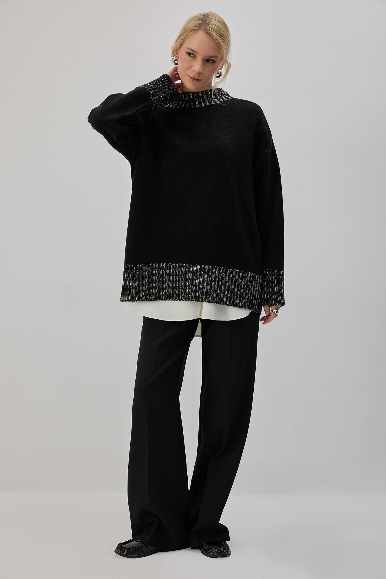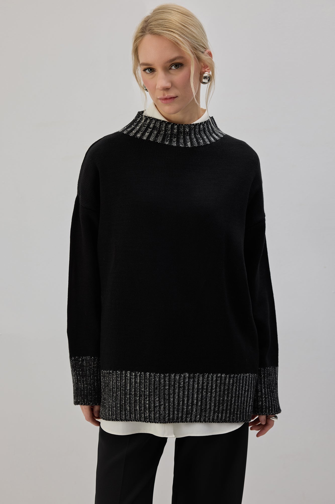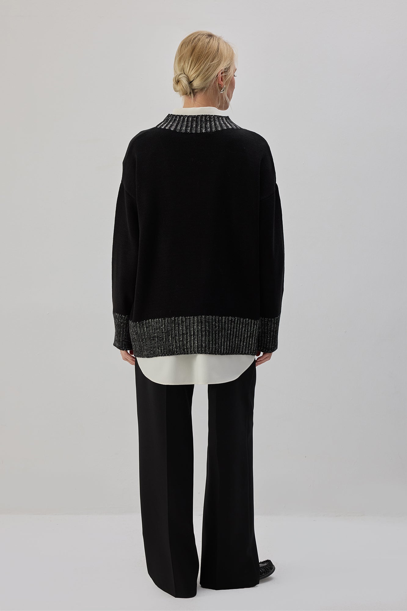 Kontrast ribana yaka. Uzun kollu. Düşük omuzlu. Etek uçlarında ribana örgü. Tunik.