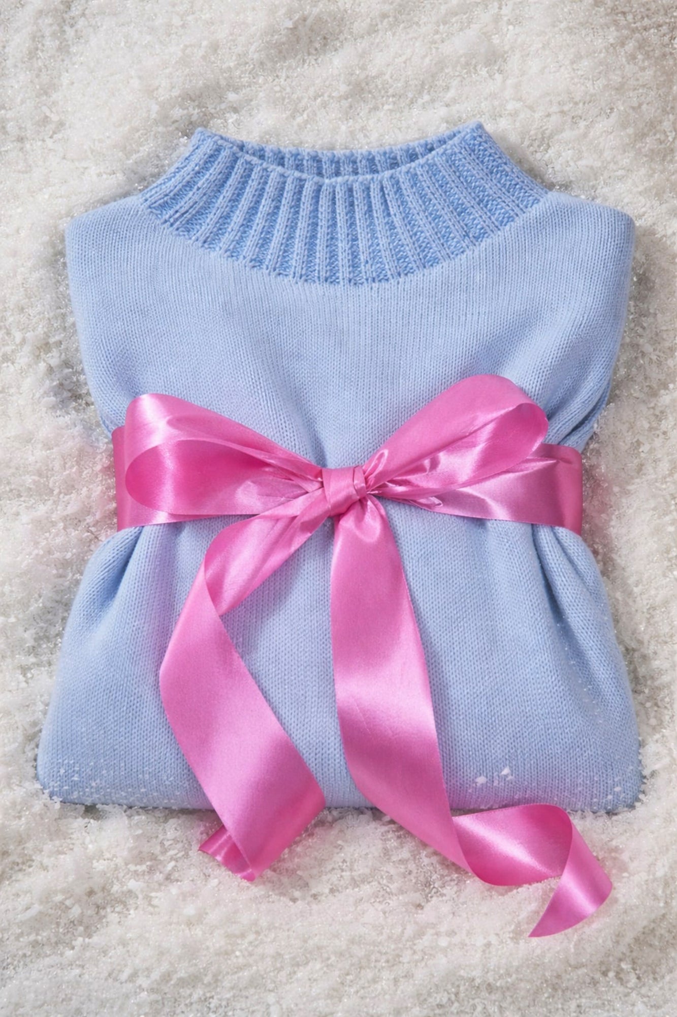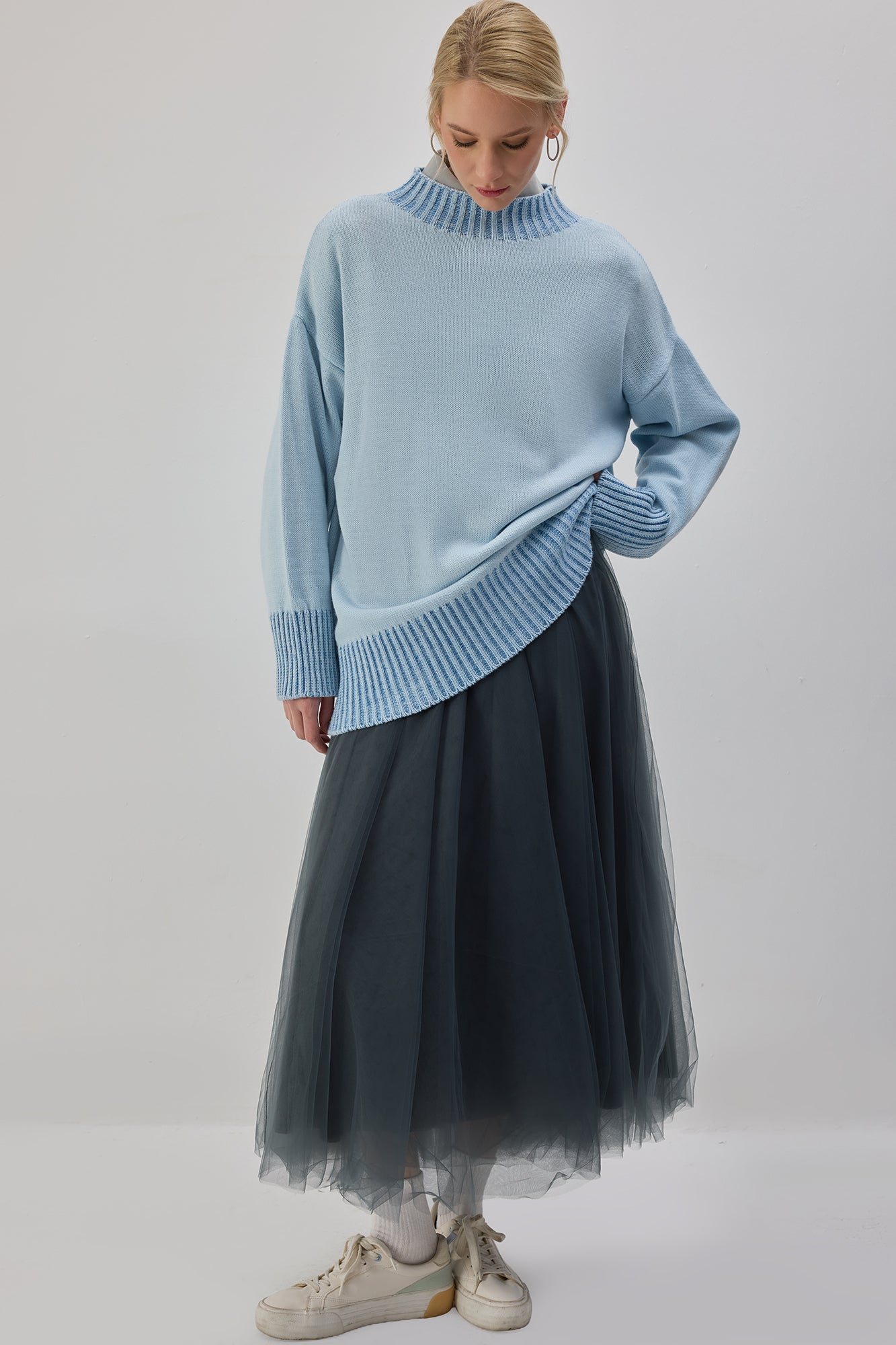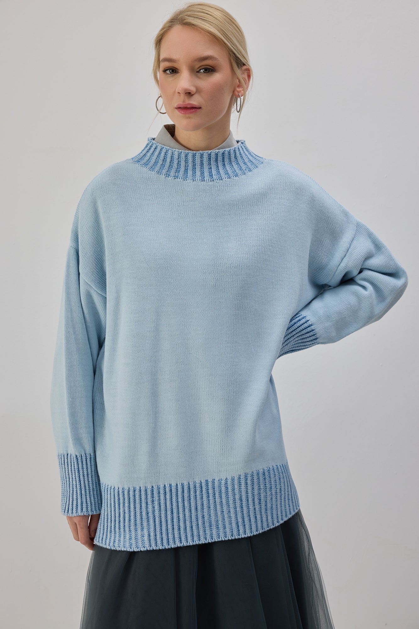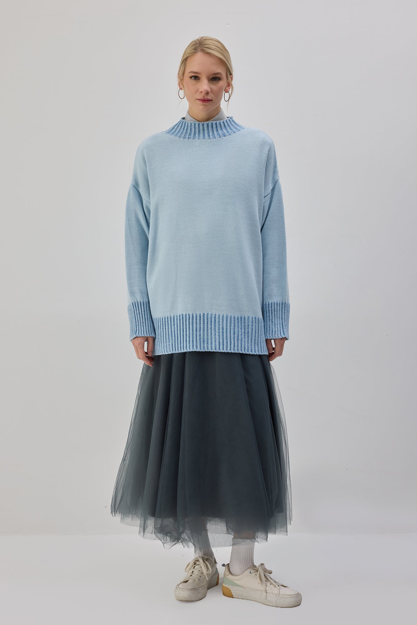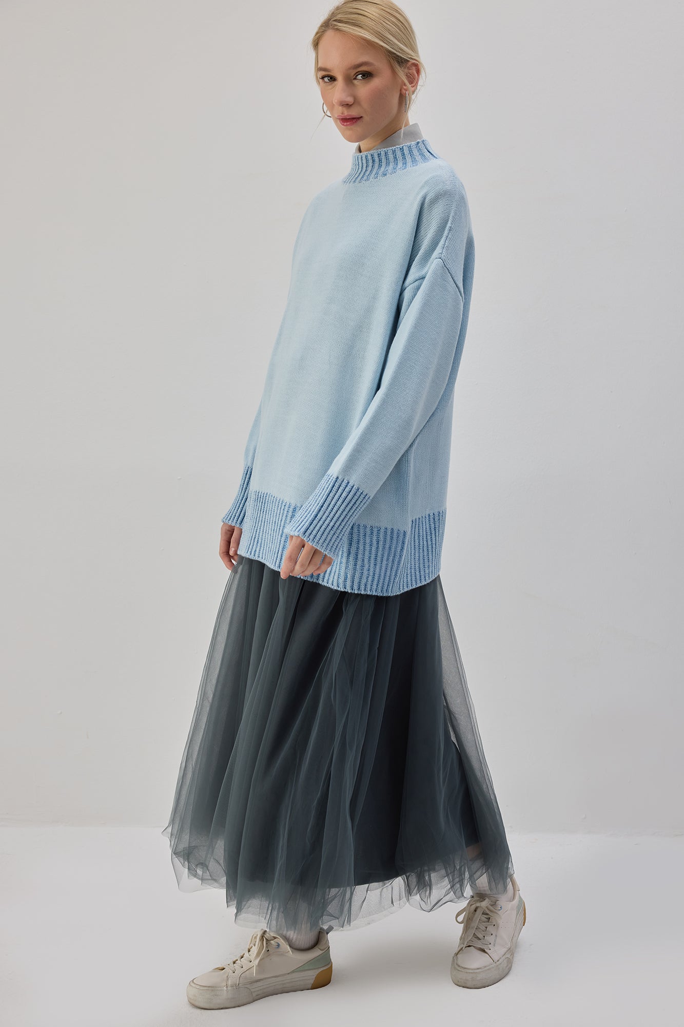 Kontrast ribana yaka. Uzun kollu. Düşük omuzlu. Etek uçlarında ribana örgü. Tunik.