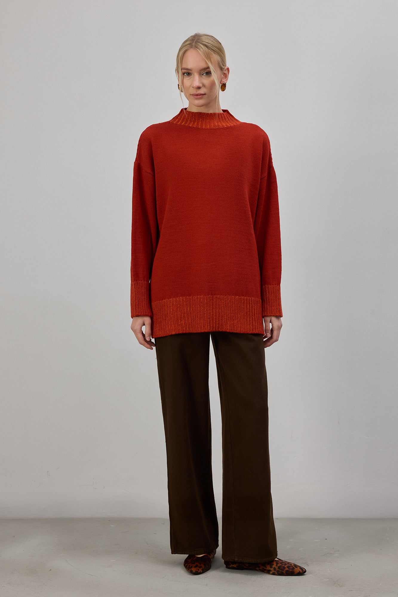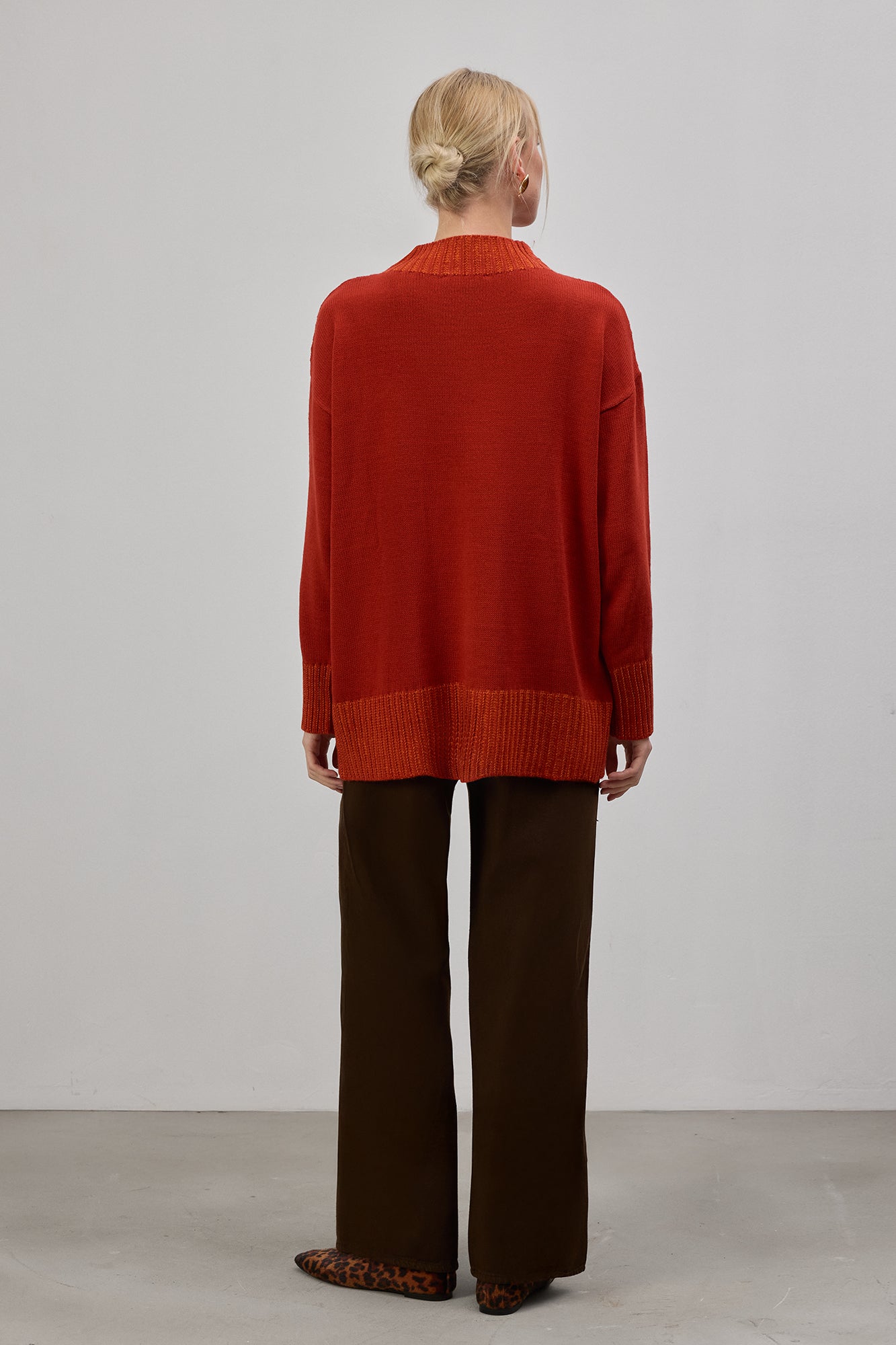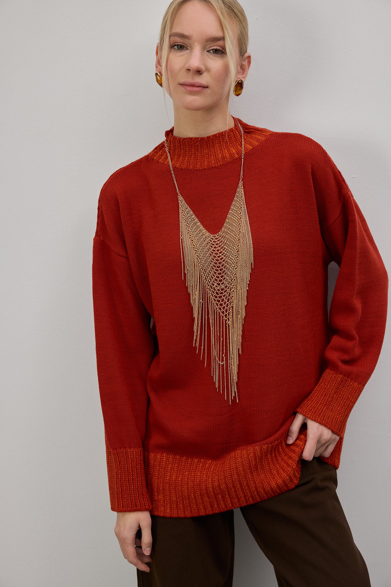 Kontrast ribana yaka. Uzun kollu. Düşük omuzlu. Etek uçlarında ribana örgü. Tunik.
