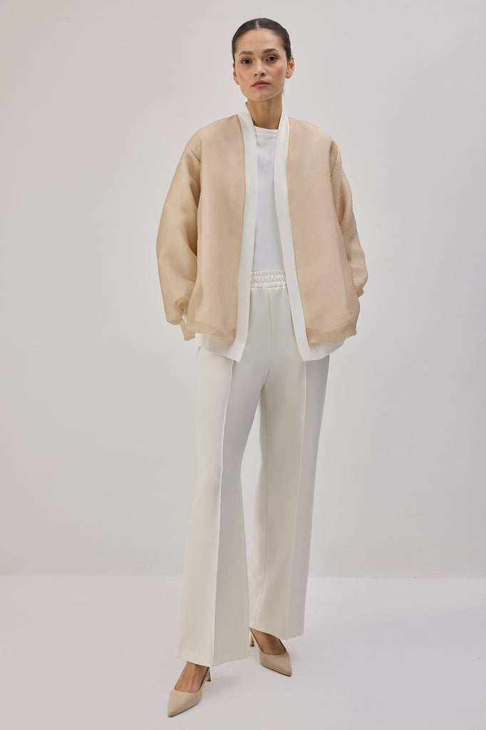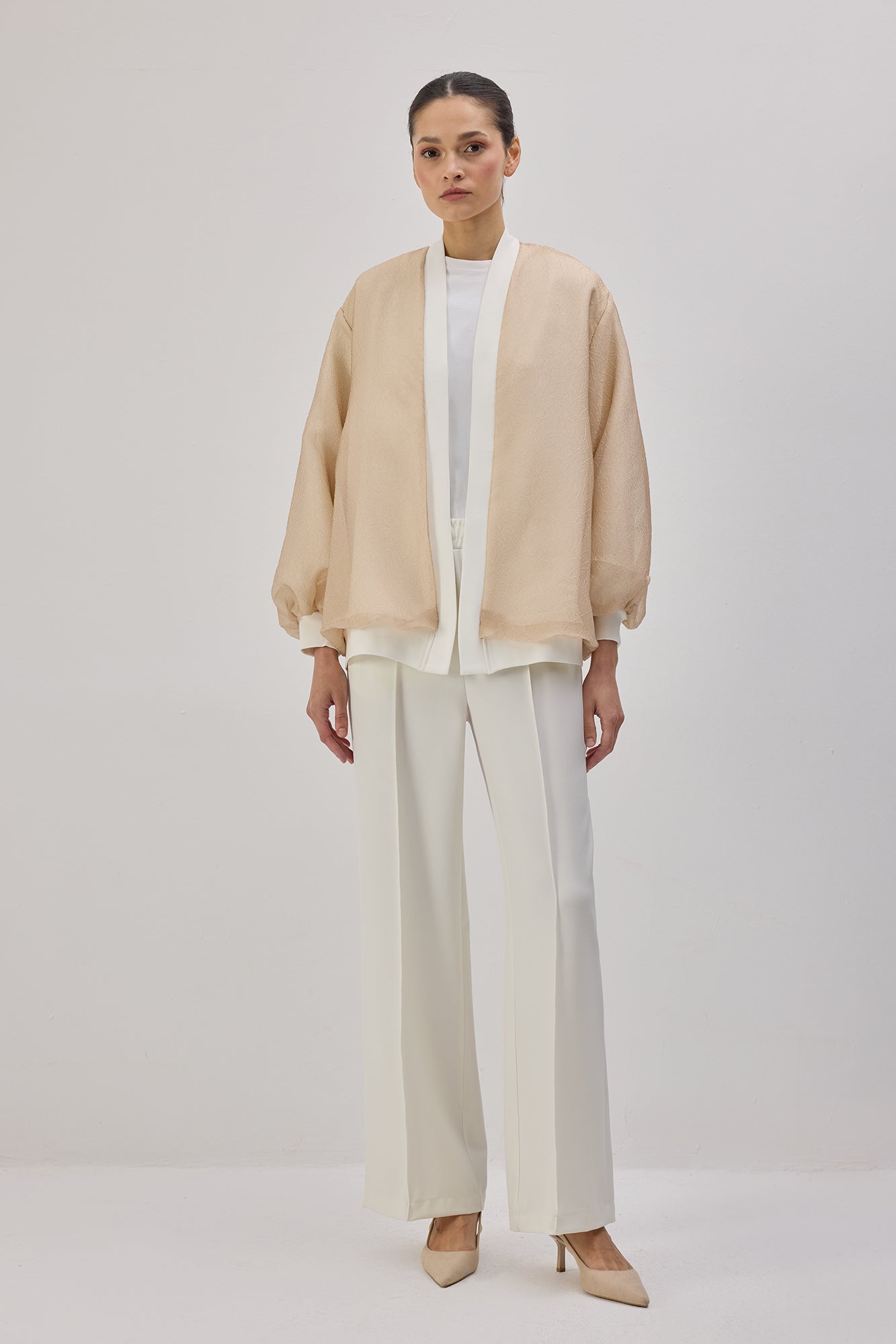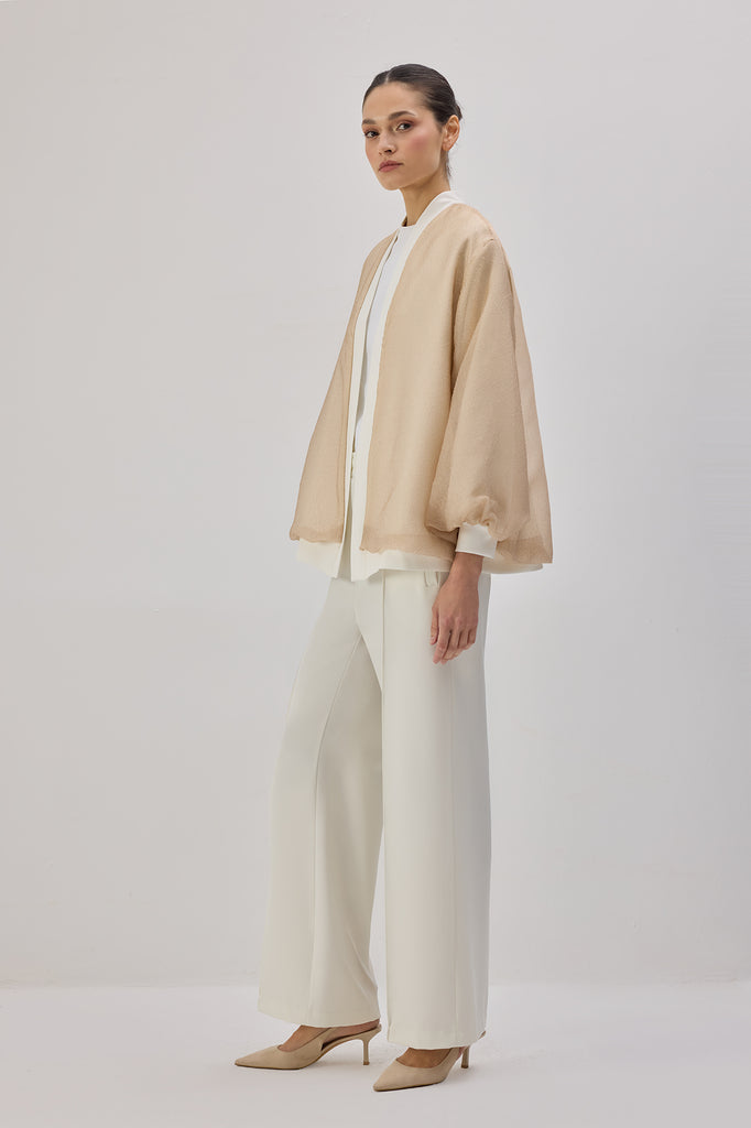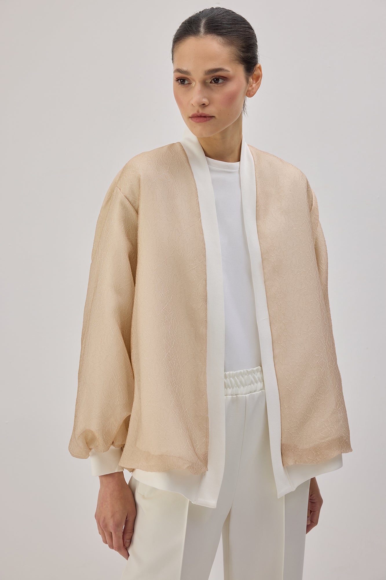 Bomber ceket. Volanlı balon kol. Manşetleri lastikli. Kontrast renkli iç kaplama. Kapamasız önü açık form.