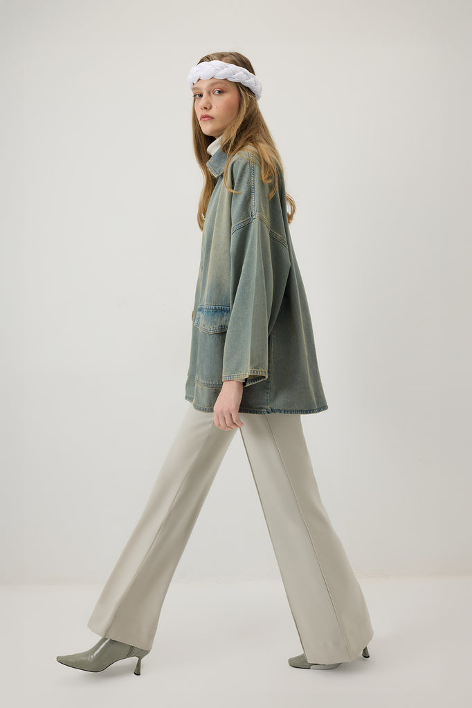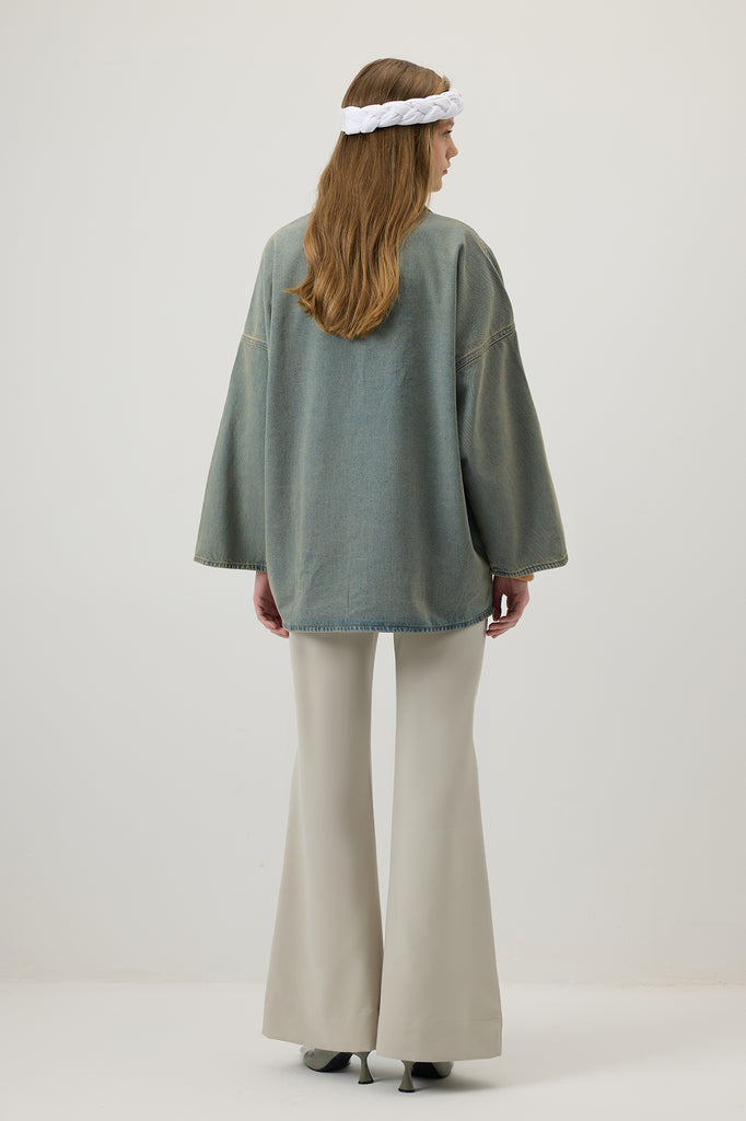 Klasik denim dokusunu modern bir formda yorumlayan bu ceket, geniş yakası ve büyük ön cepleriyle dikkat çeker. Rahat kesimi sayesinde günlük stillere konfor katar. Katmanlı kombinlerin tamamlayıcısı olarak sezonun öne çıkan parçalarındandır.