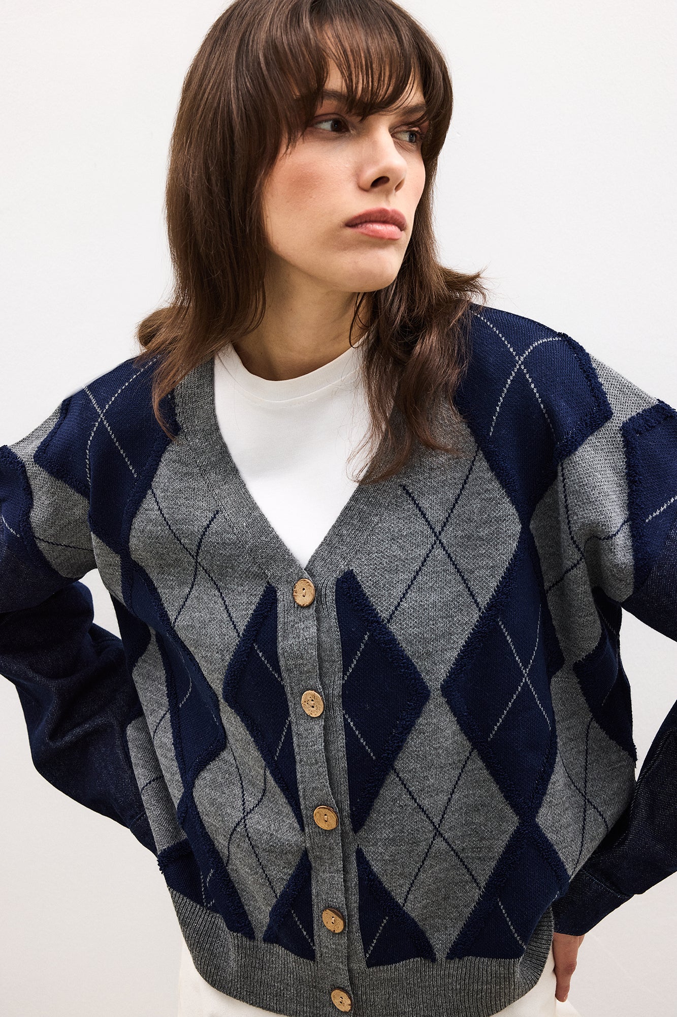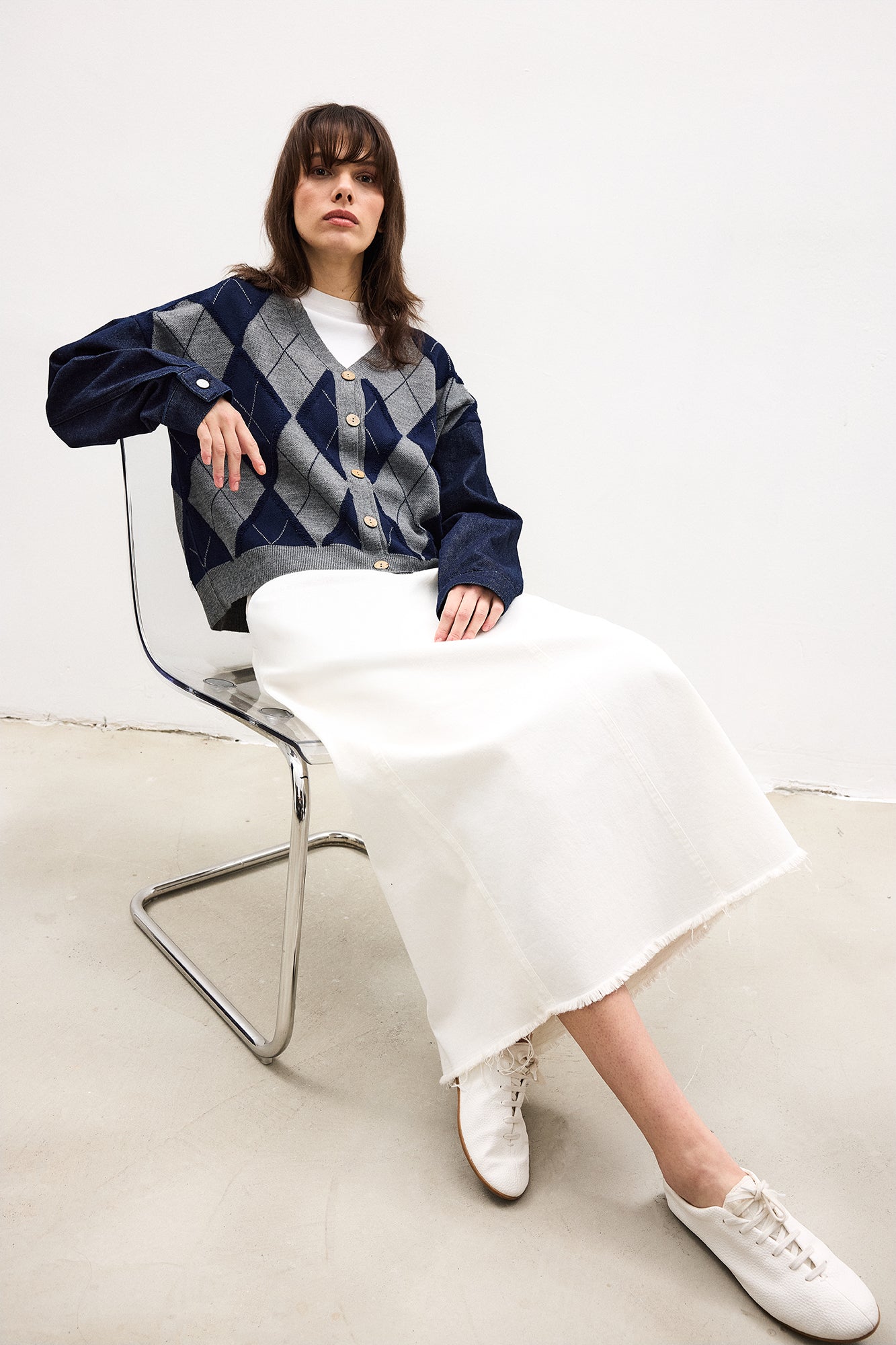 Klasik baklava desenli triko dokuyu modern denim garni detaylarıyla buluşturan bu hırka, rahat kesimi ve zamansız tasarımıyla günlük kombinlere güçlü bir stil dokunuşu katar.