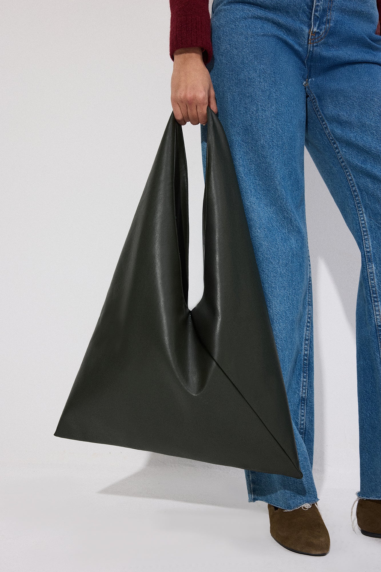 Metal logolu, minimal tasarımlı büyük boy deri çanta.