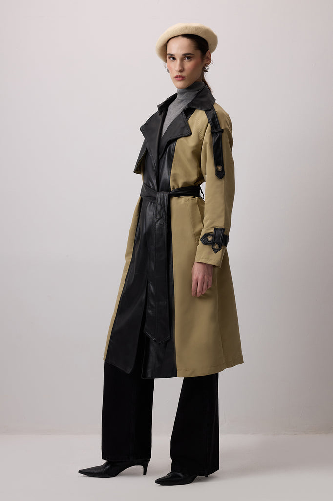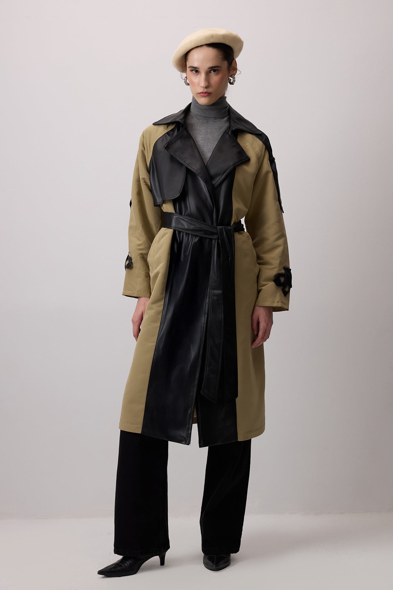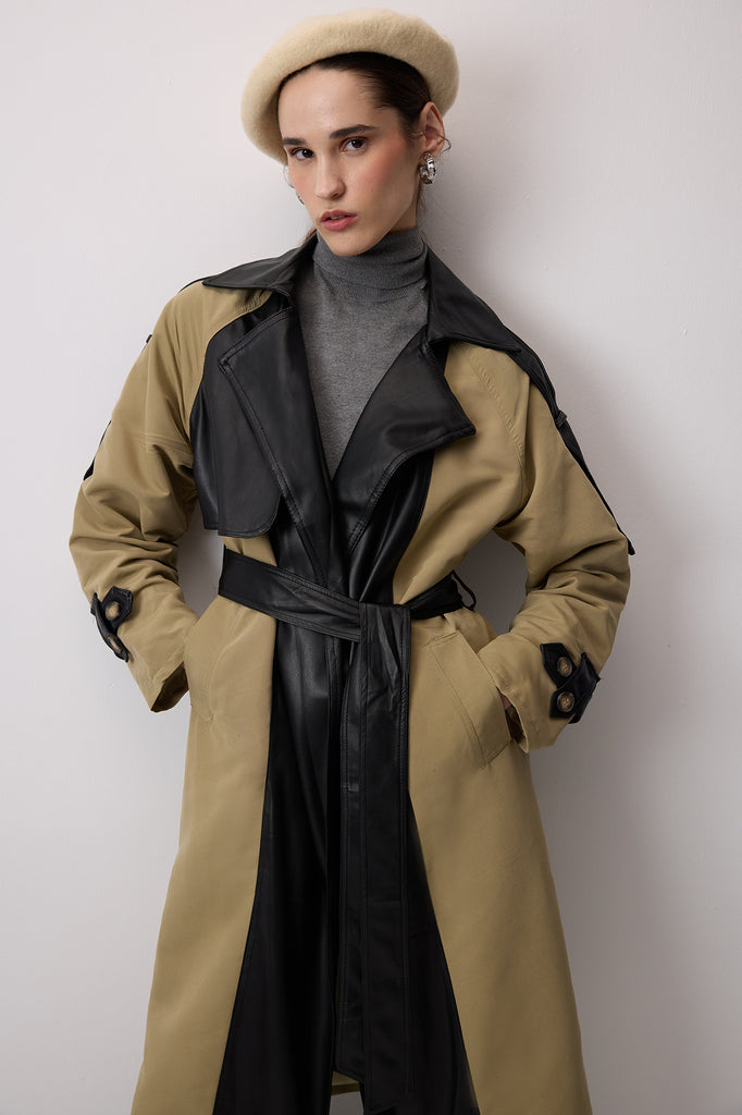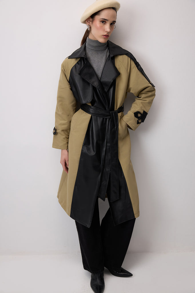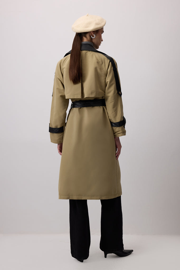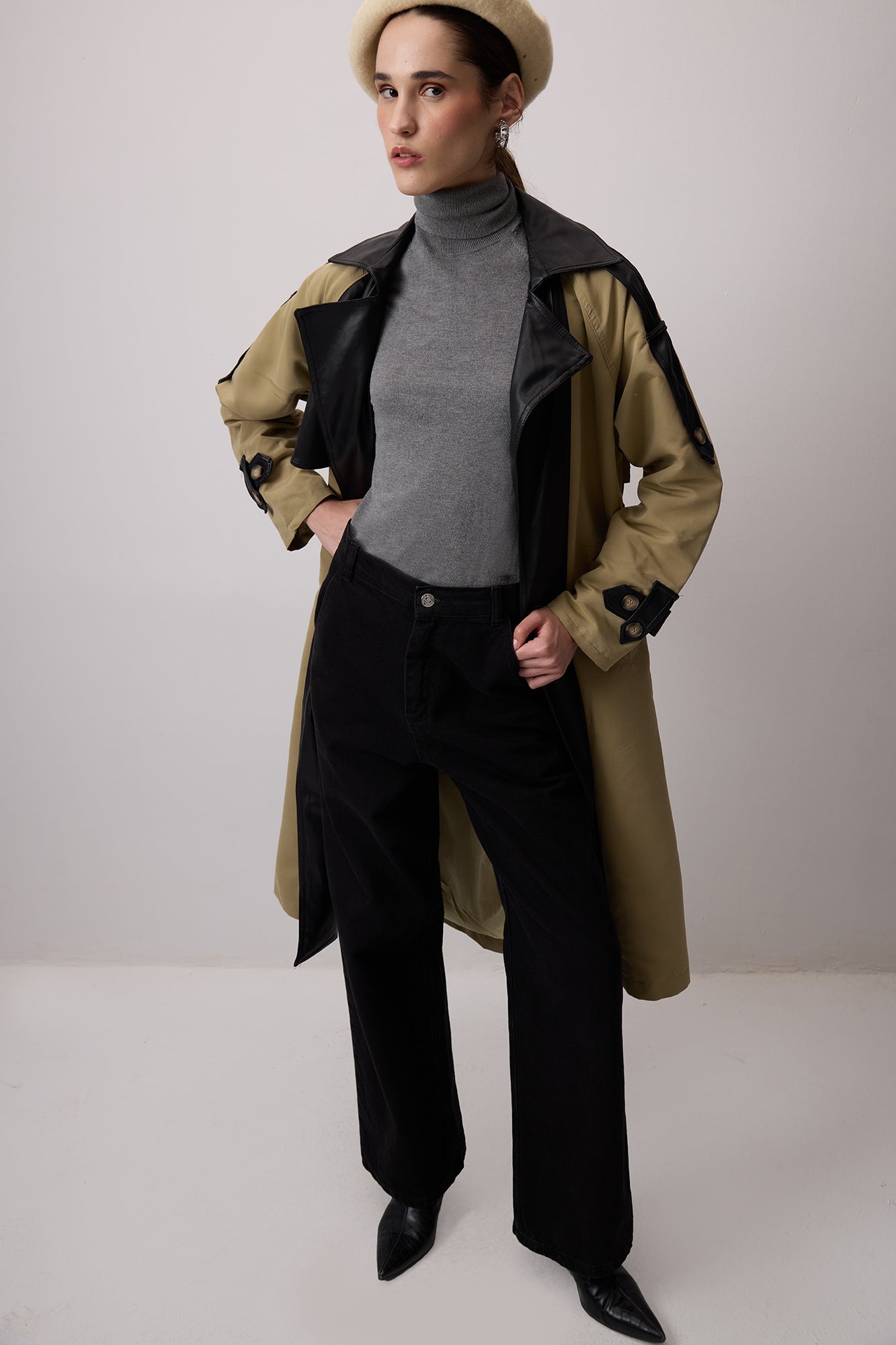 Klasik, kontrast çentik yaka. Uzun kollu. Kontrast apolet ve kuşak detaylı. Çift cepli.