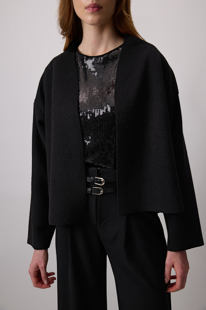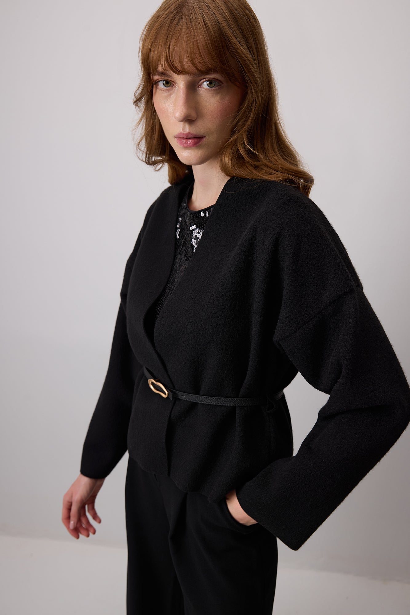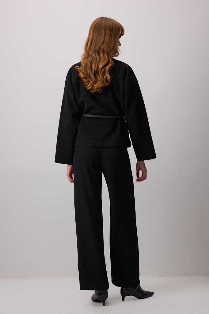 V yaka. Uzun kollu ve düşük omuzlu. Deri kemer detaylı. Ceket.