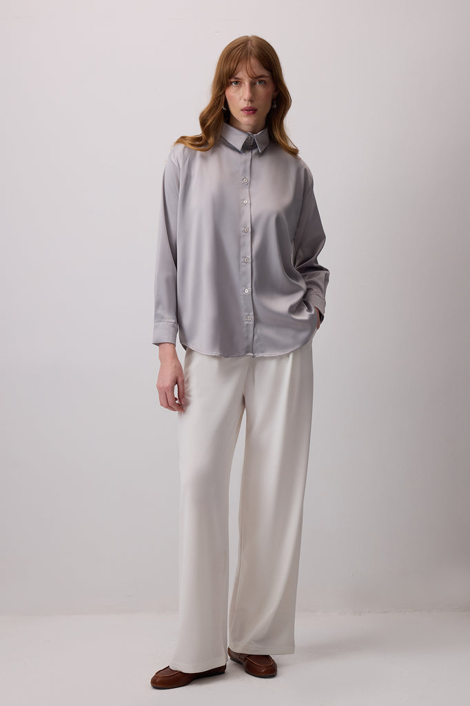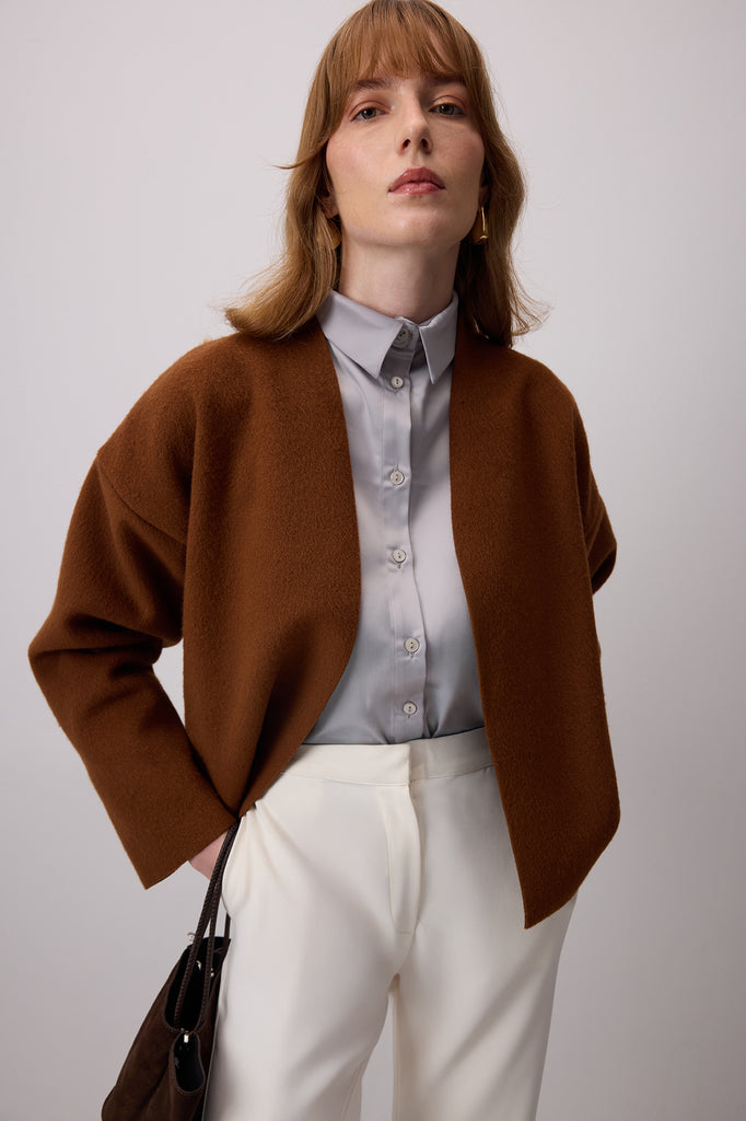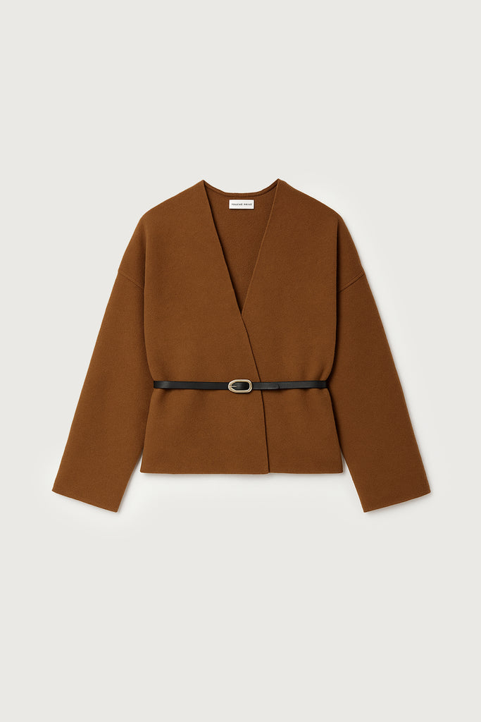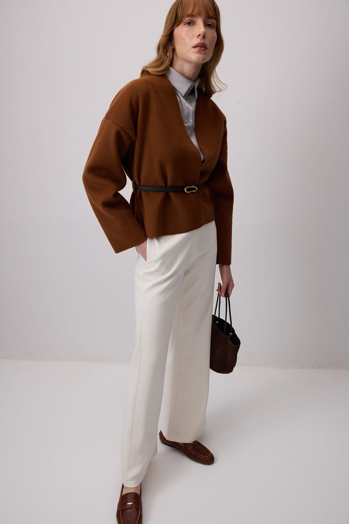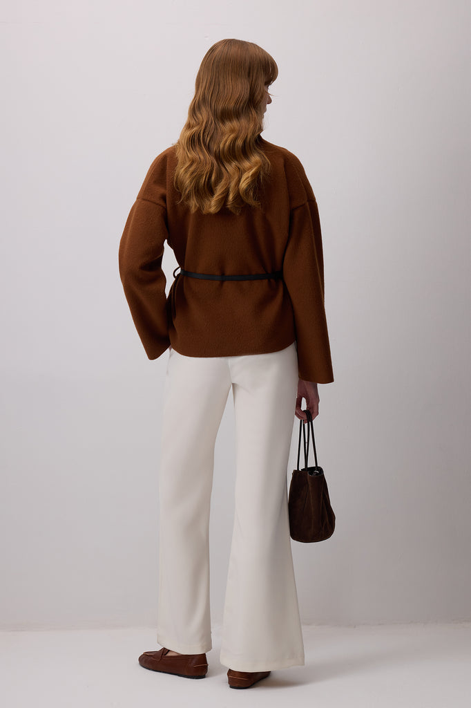 V yaka. Uzun kollu ve düşük omuzlu. Deri kemer detaylı. Ceket.