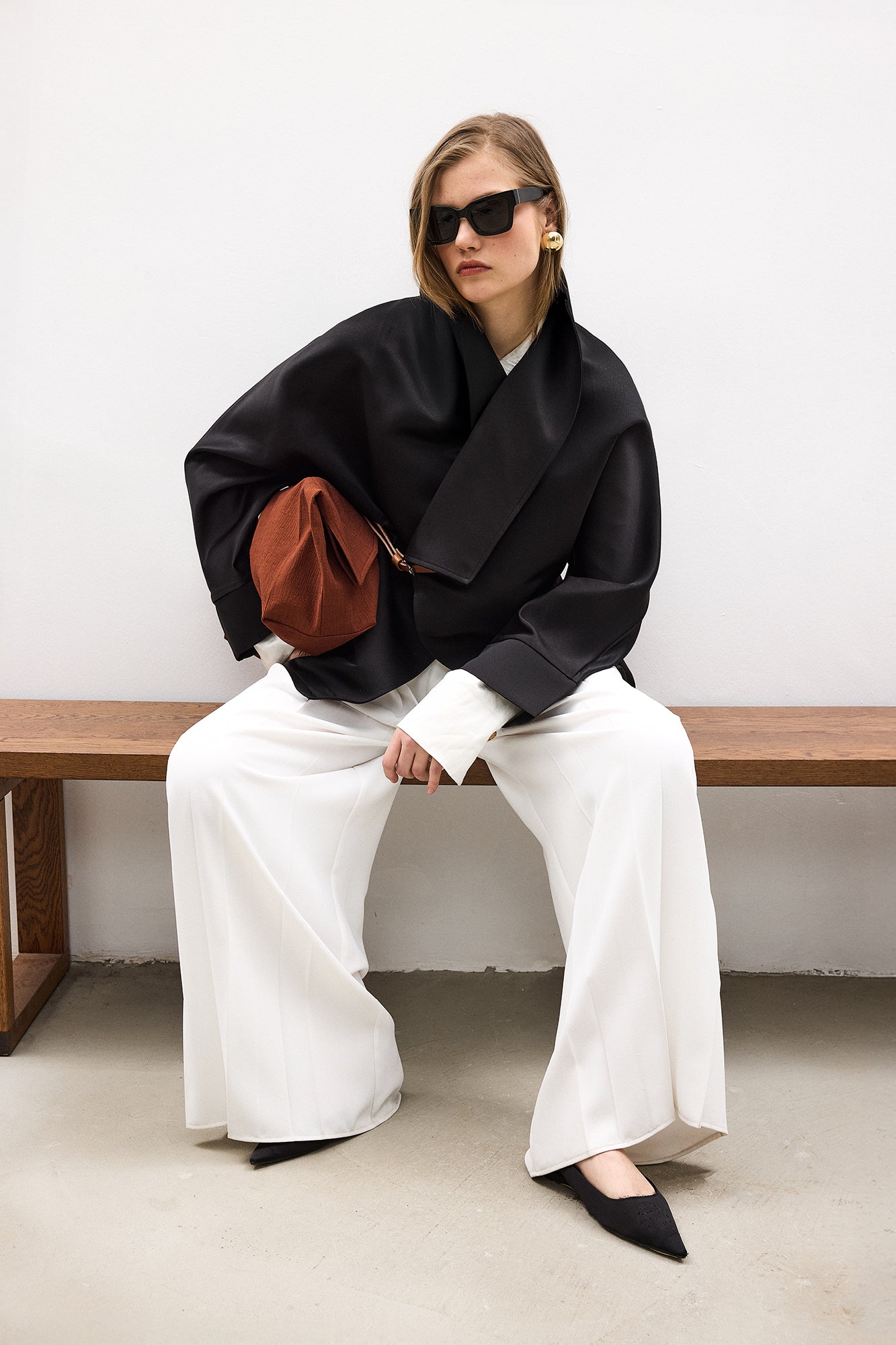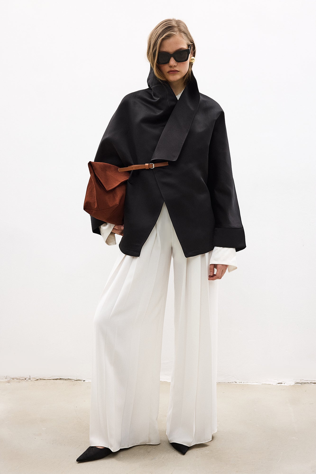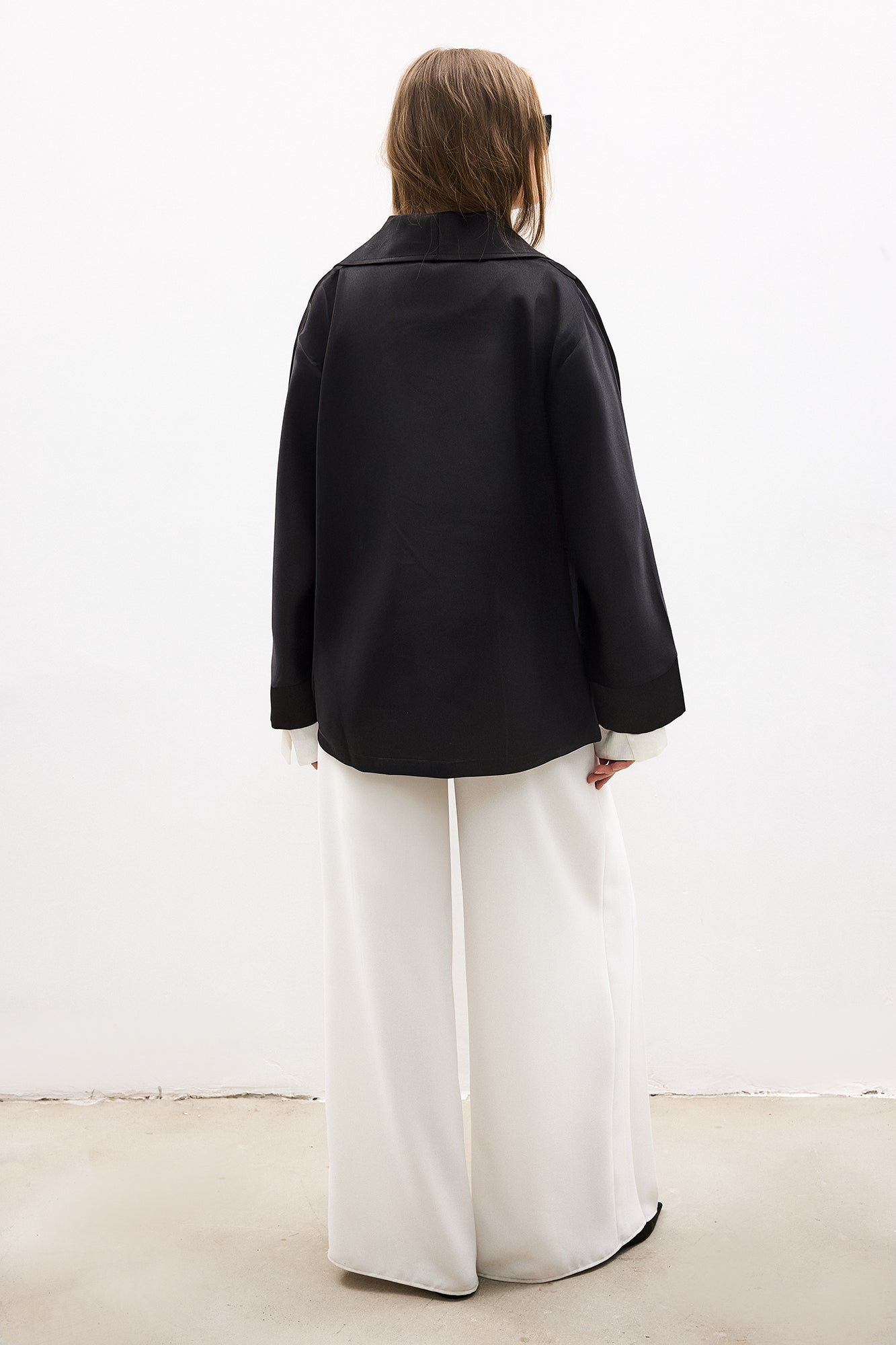 Geniş yaka. Uzun kol. Ayarlanabilir kemerli.