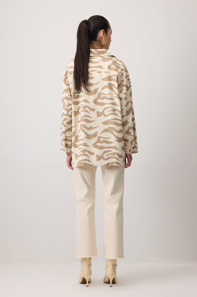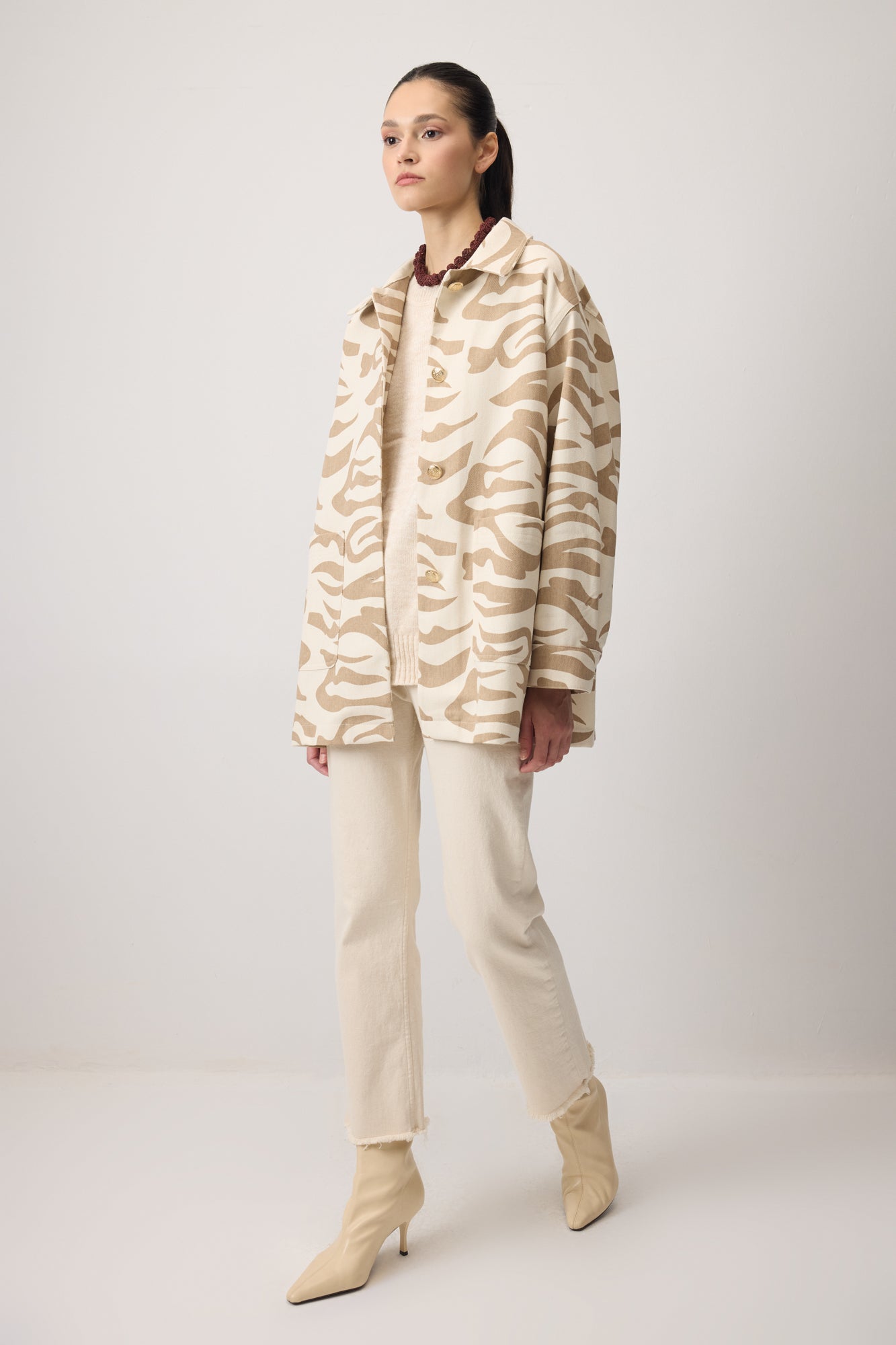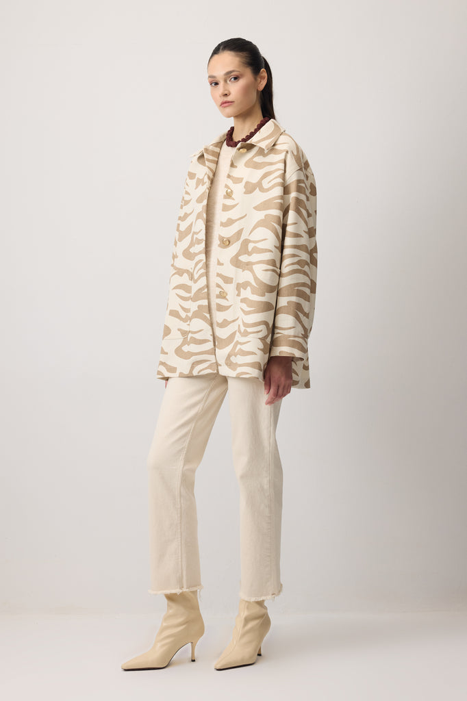 Desenli gabardin ceket. Önden düğmeli. Büyük cepli. Uzun kollu.