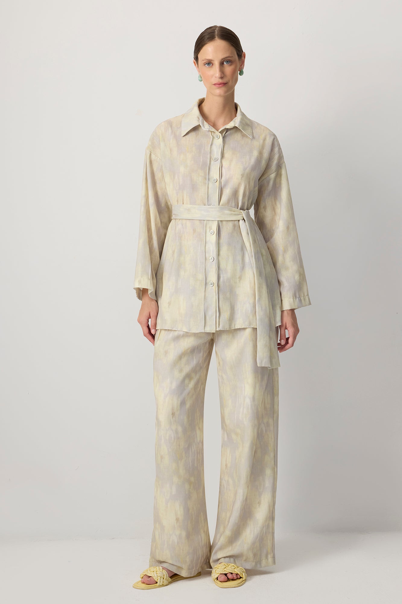 Klasik yaka. Uzun kollu ve düşük omuzlu. Önden düğme kapamalı. Belden bağlama detaylı. Desenli. Gömlek. Uzun boy. Rahat kesim Elastik bel. Desenli. Pantolon.